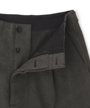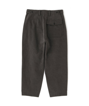 ヴィンテージのミリタリートラウザーから着想を得たデザインで、裾のダーツによるテーパードを際立たせるため、全体にゆとりを持たせたシルエットに仕上げている点が魅力。フラップ付きのバックポケットなど、機能性とデザインのバランスが際立つ一着。