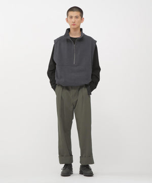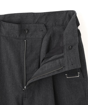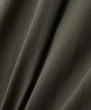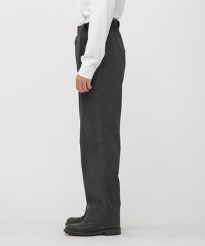 ウールとコットンを高密度に織り上げたツイル素材のワイドトラウザーズ。ウールの暖かみとコットンのカジュアルな風合いをあわせ持ち、仕上げを抑えることで素材本来の表情を活かした一着。