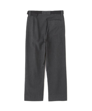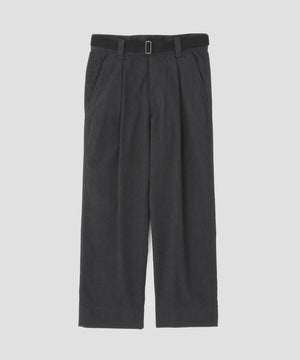 アクリルのウェビングベルトを組み合わせたデザイン。股上を深く取り、フロントタックから広がるワイドシルエットがマニッシュな印象。センターバックのみ幅を変えたベルトループがワークウエアを思わせるディテール。ベルトは取り外し可能で、レザーベルトへの付け替えもできる仕上がり。
