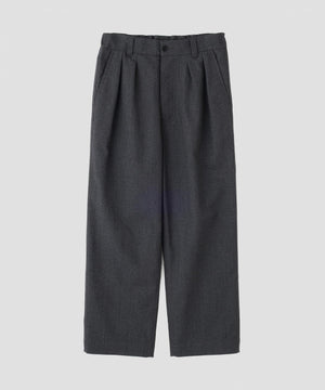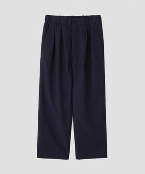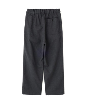 タックで生まれるヒップまわりのゆとりと、ワイドなシルエットが特徴。ウエスト後ろをゴムギャザーにすることで、構えすぎない自然なリラックス感を加えたデザイン。クラシックな雰囲気の中に、MHL.らしい抜けを感じる一本。