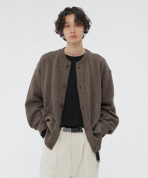 ヴィンテージのキッズセーターから着想を得ておい、シンプルな襟型に大きな腰ポケットを組み合わせ、度目を詰めて仕上げることでアウターライクな雰囲気の一着。