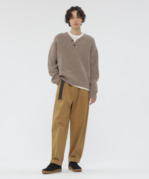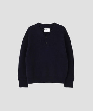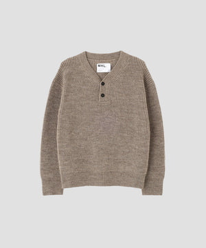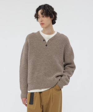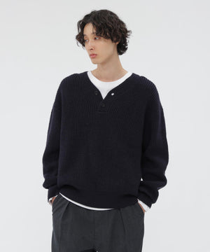 畦編みのボディにヘンリーネックを合わせ、レトロな表情を残しつつボクシーフィットでモダンに仕上げたデザイン。襟付きのシャツをインナーに重ねることで、首元のレイヤードを楽しめる一着。