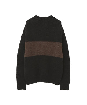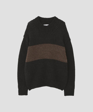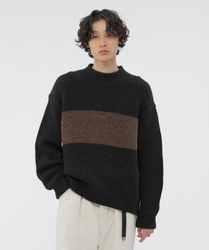 エボニーのボディにブラウンのストライプをグラフィカルに配したローゲージニットは、ハンドニットのような温かみを漂わせつつ、ルーズフィットにドロップショルダーを組み合わせたバランス。見た目に反して軽やかな着心地で、糸の風合いを引き出す米富繊維の技術が光る一着。