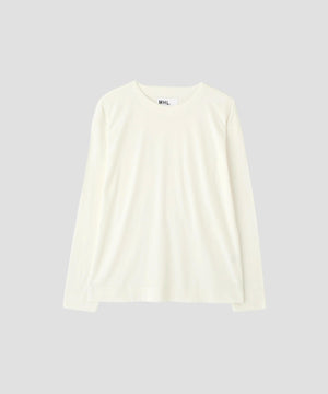 コンパクト糸を使用した、滑らかで肌触りの良いジャージー素材のTシャツ。日本国内で編みと加工を行い、ヌメリ感のある上品な風合いに仕上げた一枚。薄手で軽やかさがあり、ほんのりと落ち感のある質感が特長。
