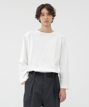 タテに走る編み目と程よいムラ感がヴィンテージのカットソーを思わせる風合いで、幅広いスタイリングに馴染むシンプルなデザイン。