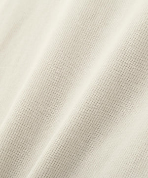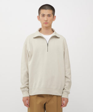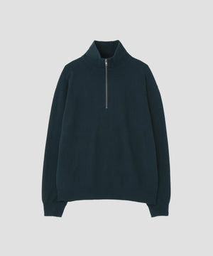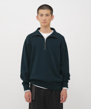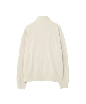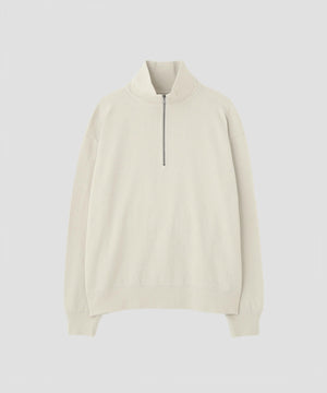 ダブルフェイスで編み立てたコットンジャージーで仕立てたハーフジップジャンパー。Tシャツより厚みがあり、裏毛より軽やかな質感が特長。細かなリブのような組織感で、ニットのような着心地を楽しめる素材。