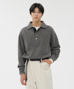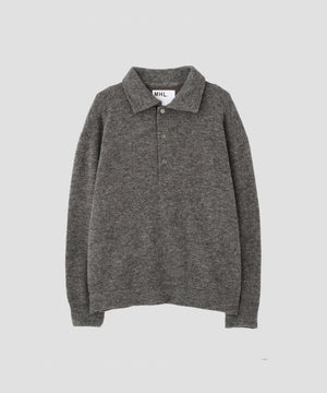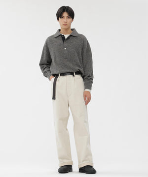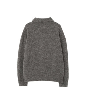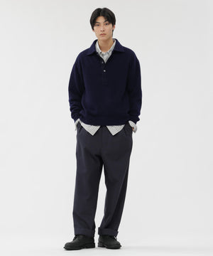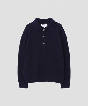 ヴィンテージのニットポロから着想を得たデザインで、ドットボダンの前立てがアクセント。襟や袖、裾を共布で仕立て、カットソーらしい軽さを感じる一枚。