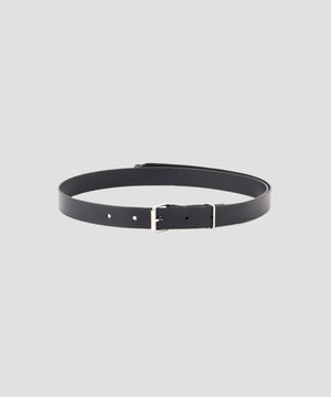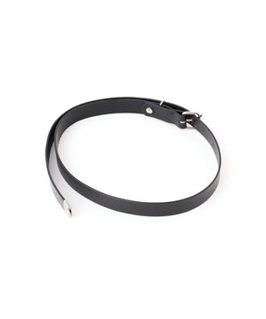 MHL定番のウェビングベルトをレザーで表現したモデル。先端の金具やローラーバックル、リベットを組み合わせ、MHLらしいフォルムを強調。ブラックにはニッケル、ブラウンには黒ニッケルを採用し、それぞれ異なるコントラストを添えたデザインが魅力。
