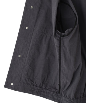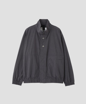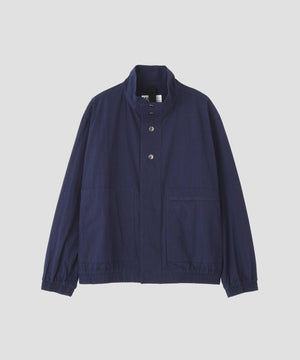 フロントは上部3つのみを表に出したドットボタンと、比翼仕立てを組み合わせたスタンドカラーデザイン。脇から手を入れられるパッチポケットに加え、左側にはジップポケットを配置した機能的なデザイン。裏地のない軽い仕立てで、コンパクトな着丈とボクシーなフィットが気負わず着られるバランス。袖口と裾に配したゴムギャザーが程よいボリュームを生み、カジュアルな印象にまとめた一着。
