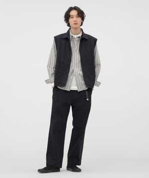 サイドアジャスターやフラップポケットのスナップボタンなど、実用性の高いディテールがポイントの一本。MHL.らしいモダンなカッティングで癖がなく、まっすぐに落ちるストレートシルエットが特徴のシングルプリーツトラウザーズ。同素材のウエストコートとのセットアップもおすすめ。
