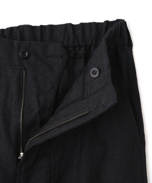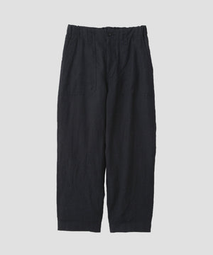 丁寧に織り上げた、リネンとウールを組み合わせたツイル素材のトラウザーズ。タテ糸には中白染色を施したリネンを用い、着用を重ねることで縦方向に自然な色落ちと奥行きが生まれる素材感。ヨコ糸にはラフな表情のヘビーメリノを用い、ヴィンテージのようなミックス感を引き出した仕上がり。