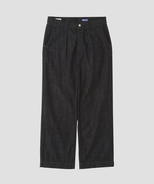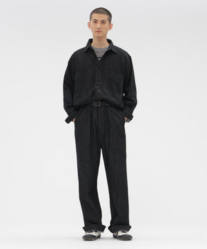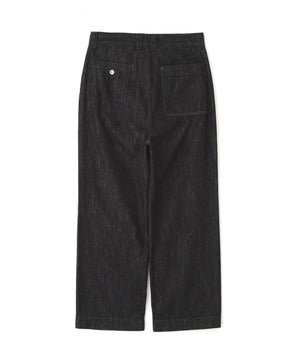 CANTON OVERALLS FOR MHL. のデニムトラウザーズ。旧式の紡績機による不均一なネップ感を再現した、CANTONオリジナルのライトオンスデニム素材(9oz)。履き込むほどに現れるタテ落ちと、さりげないネップが重なり、ワークウエアらしい粗野さとヴィンテージ感をあわせ持つ表情。薄手ながら膨らみとコシを備え、扱いやすく耐久性のある仕上がり。