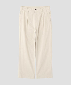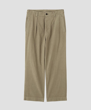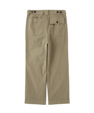 インプリーツを入れた、すっきりとしたストレートシルエット。ベルトタブボタンを備え、バックポケットはアシンメトリーな配置が特徴。中央のベルトループはワイドに設計し、4隅すべてにカンヌキを施したワークウエア由来のディテールもポイント。同素材のブルゾンとのセットアップもおすすめ。