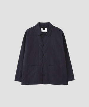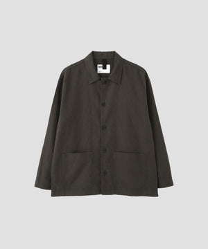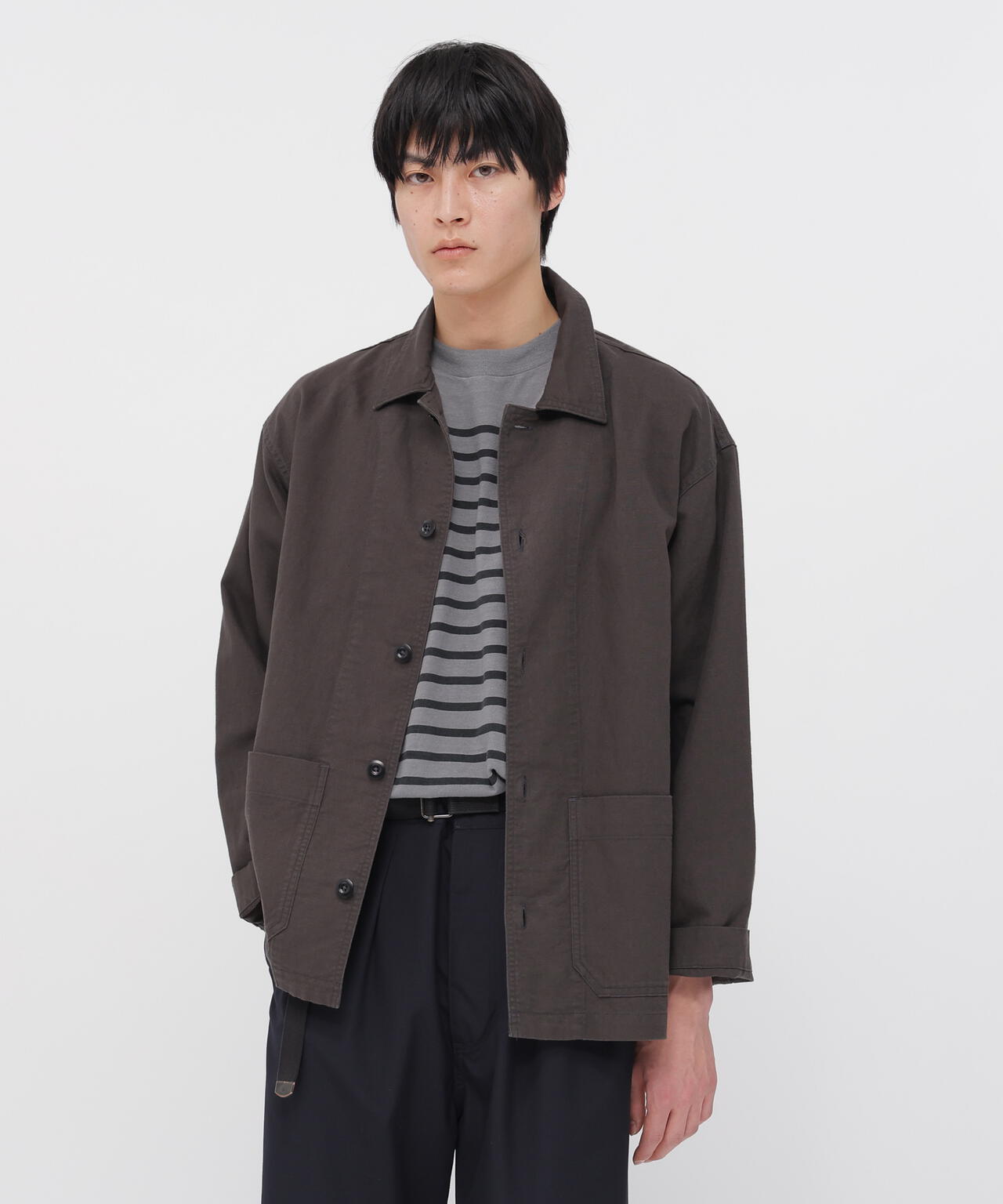 ヴィンテージのカバーオールをベースに、サイドに重ねスリットを入れ、裏にあしらった綾テープで補強とさりげないアクセントを両立。角を落としたパッチポケットを見返しのステッチに重なる位置に置き、ワークのニュアンスを添えたデザイン。ボクシーなシルエットとショート丈のバランスが特徴。春夏の軽い羽織として取り入れやすい一枚。