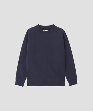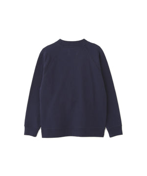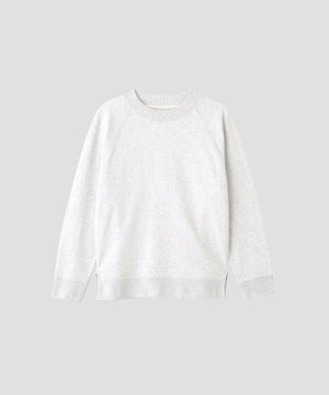 トップグレーをブリーチしたホワイト杢が特徴で、ネイビーはその上からオーバーダイで仕上げたカラー。コンパクトな着丈とボクシーなフィットが特徴のラグランスウェット。前に振った脇線から裾にかけて入れたパイピングがつくる独特のカッティングがポイント。肩にさりげなく入れたダーツが立体的なラインを生み、シンプルながら存在感のある一着。