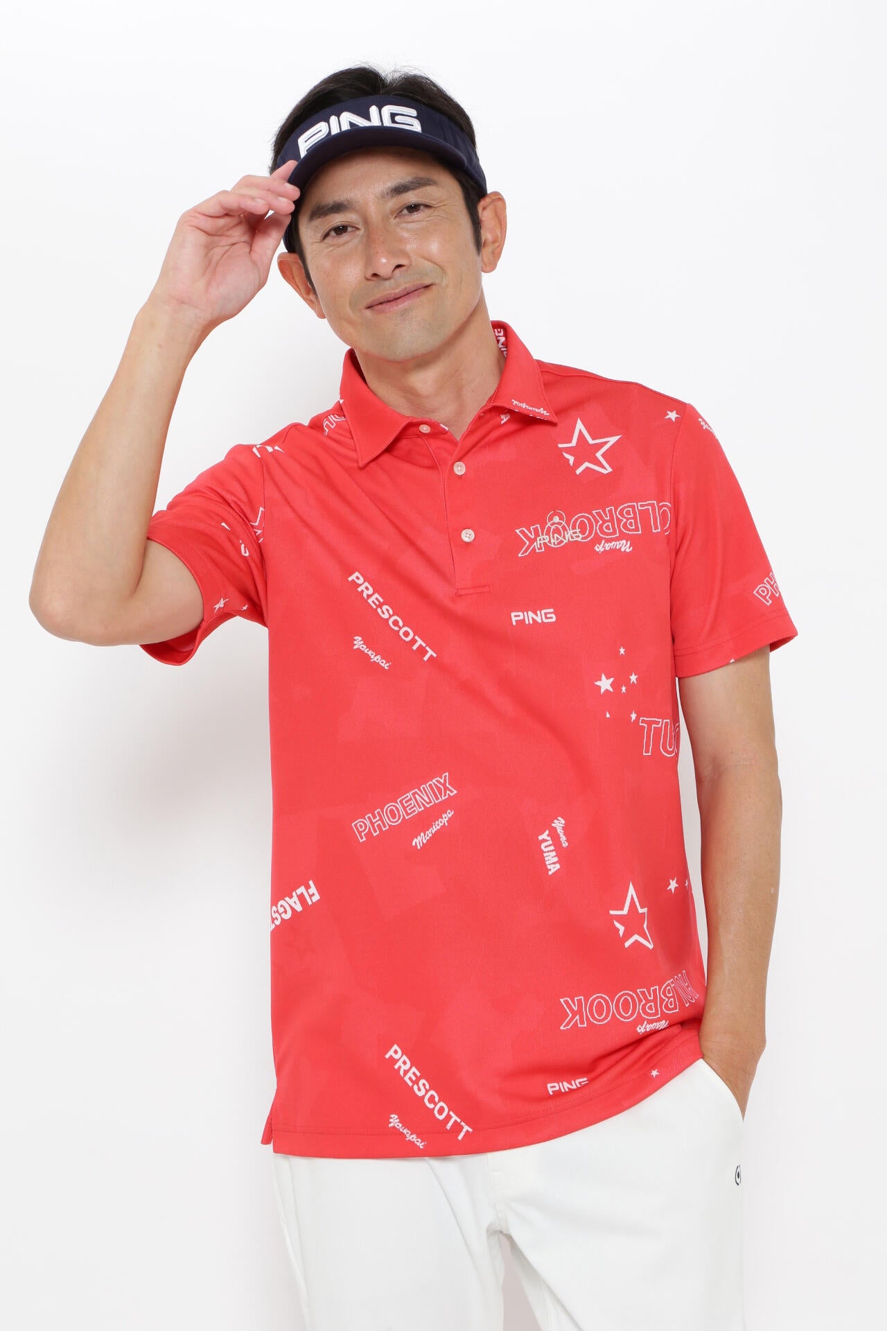 星柄やロゴなどレイアウトやフォントに変化をつけて個性的にデザインされた、カモフラージュ柄の半袖ジャガードポロシャツ。PING発祥地であるアリゾナを想起させる、インパクトたっぷりのポロシャツです。ドライでハリ感がある凸凹形状の生地なので、通気性と吸水速乾性に優れた軽い着心地を保ちます。着ることで楽しさが増すような、アクティブ感のあるPINGらしい爽やかな印象を演出できます。