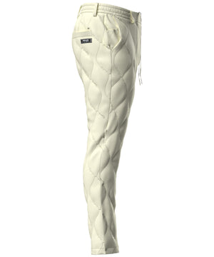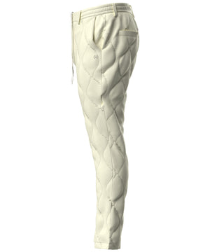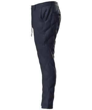 着膨れしにくいトレンド感のあるスッキリシルエットの、全方向ストレッチキルティングタフタテーパードパンツ。