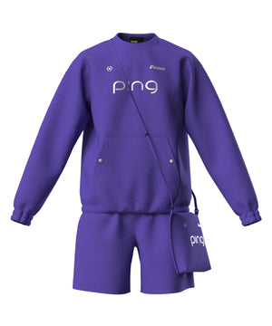 ゆったり着られるショルダー切替しのクルーネックのプルオーバーと、シンプルなショートパンツのセットアイテム。