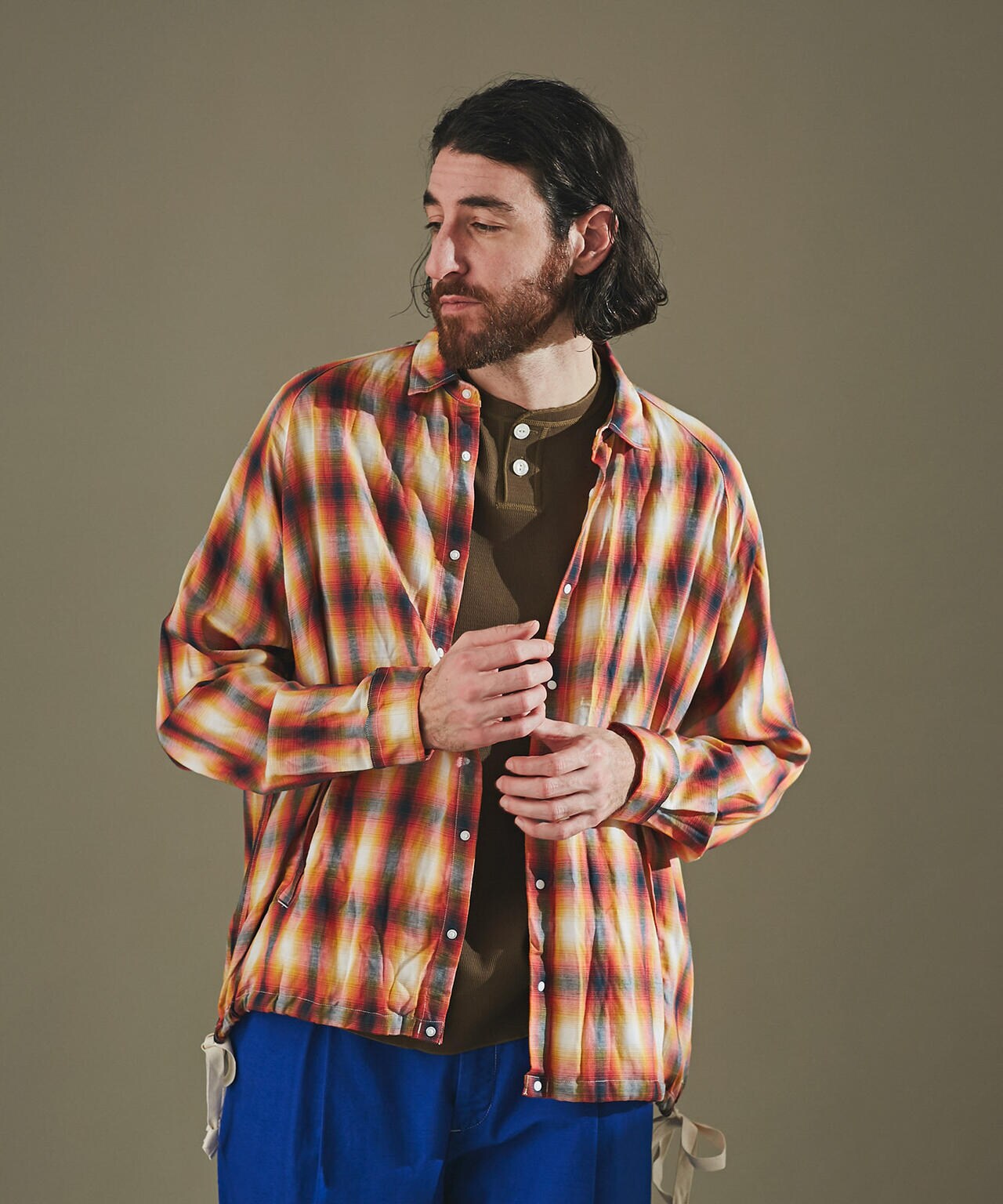 ネオンチェック柄のシャツブルゾン。裾部分をドローストリング仕様、ドット釦でよりブルゾン感を出しています。袖はラグランスリーブ仕様。手作業によってシワを施し、1点1点のシワの出方が不規則になっている為、商品ごとに異なる表情を持ちます。