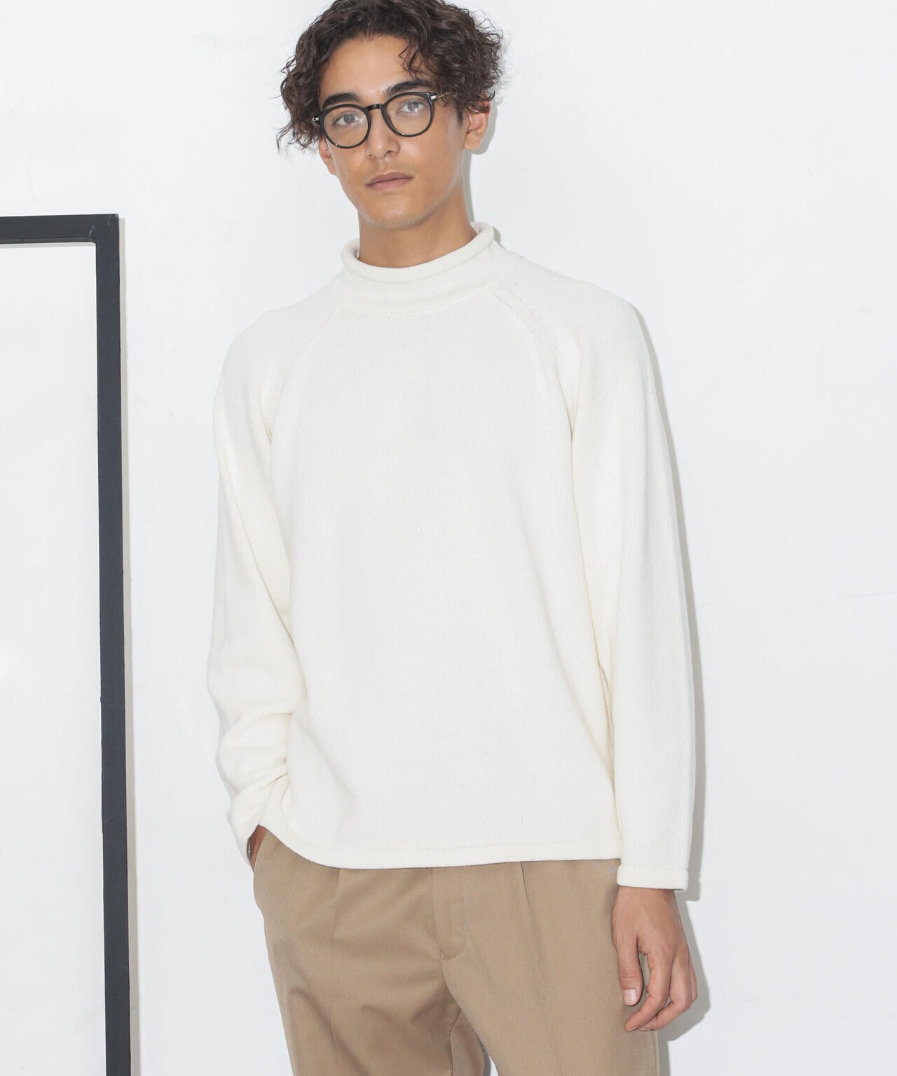 ・ロールしたボトルネックが特徴のニットプルオーバー