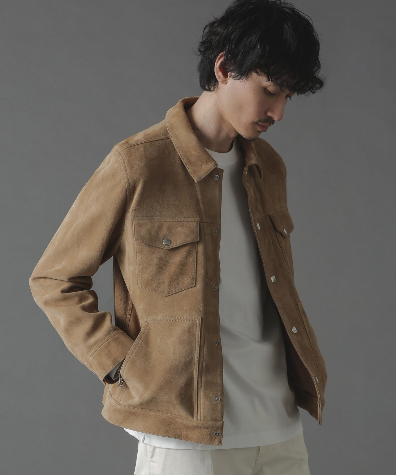 ・きめの細かいヤギ革のスエードを使用したトラッカージャケット
