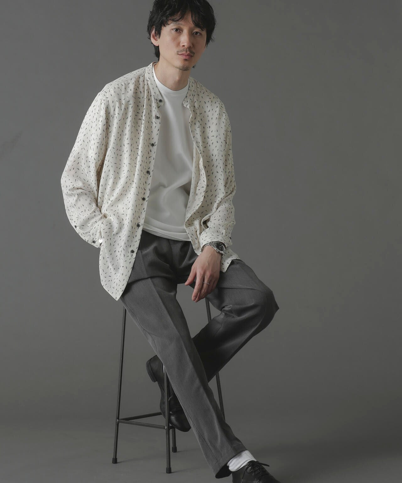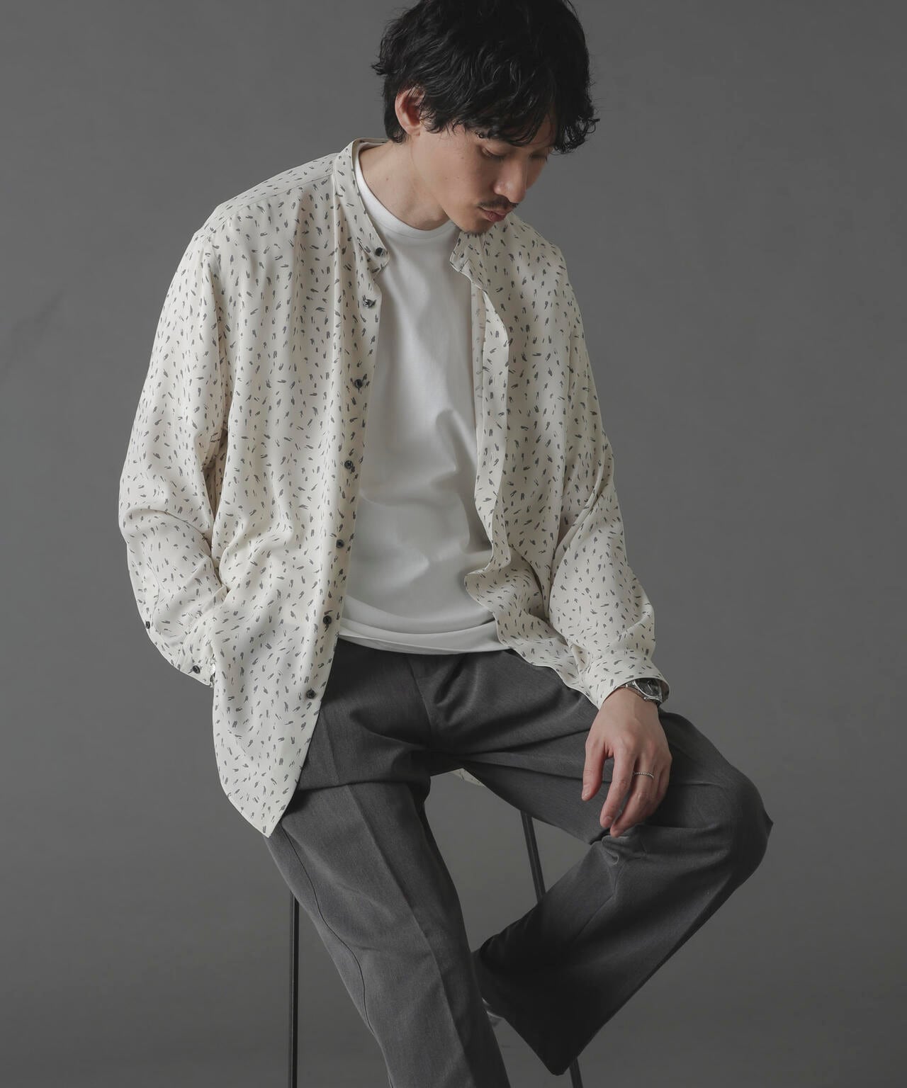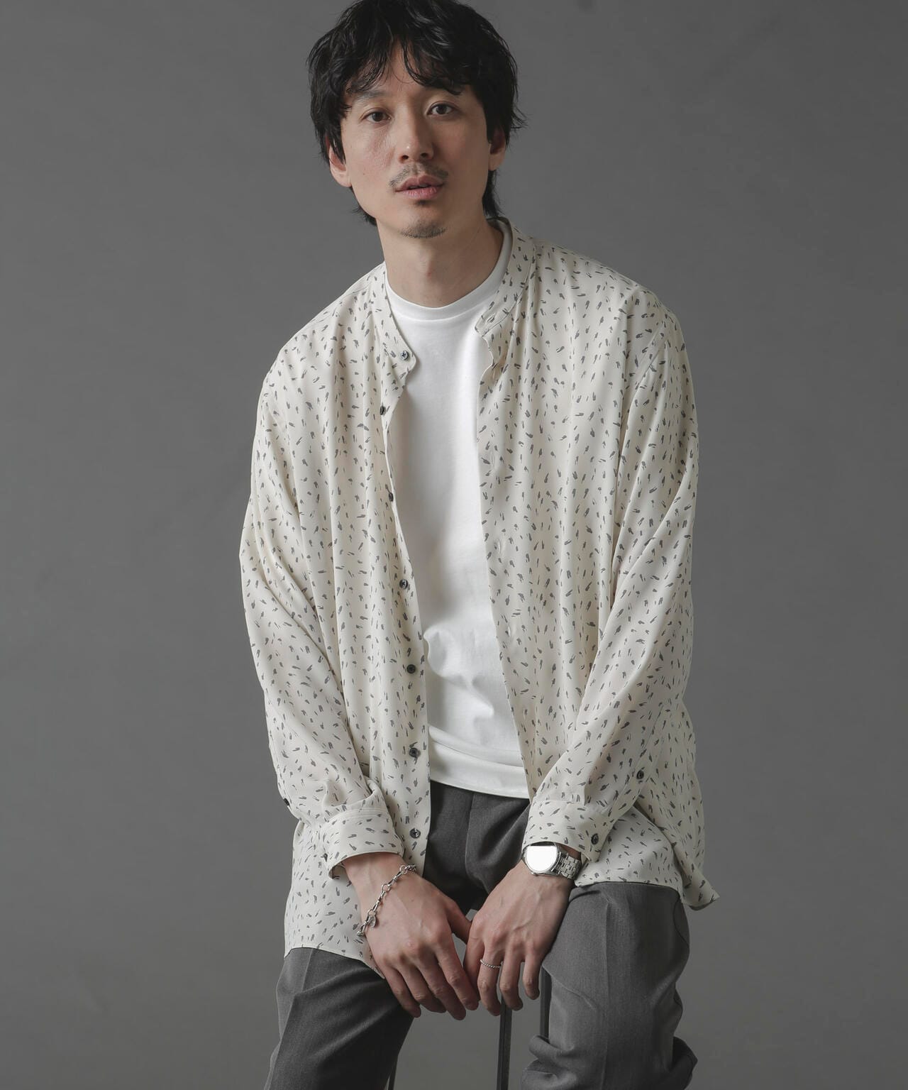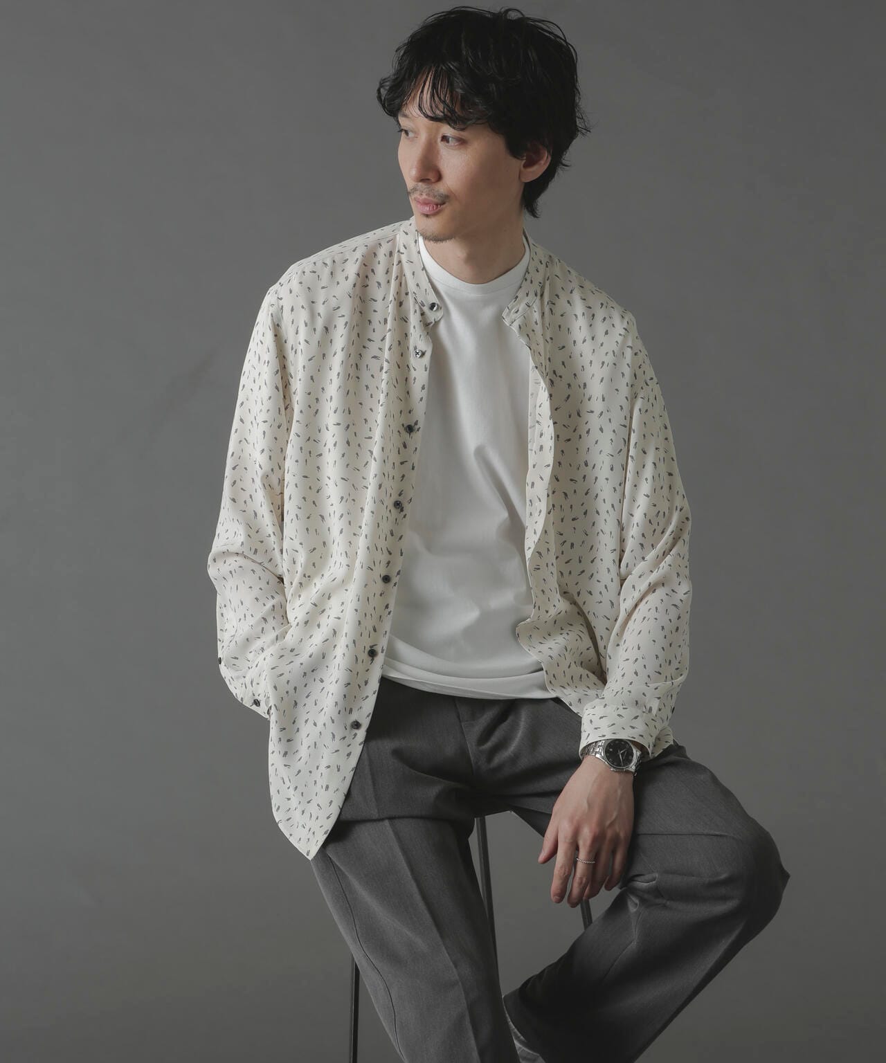 コーディネートの主役として映えるプリントバンドカラーシャツ。