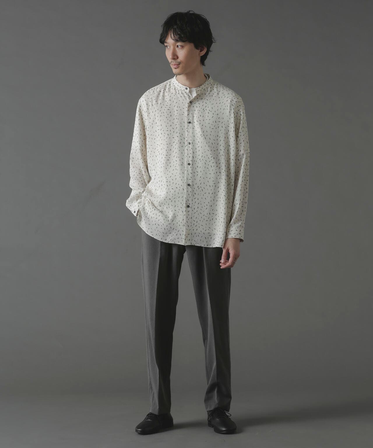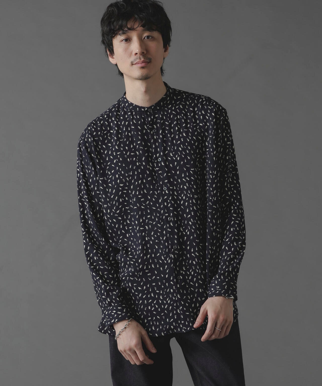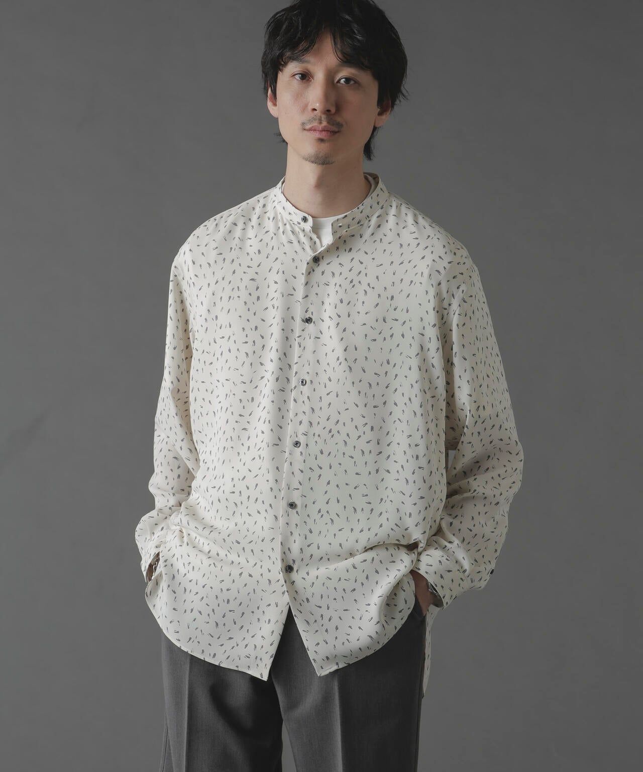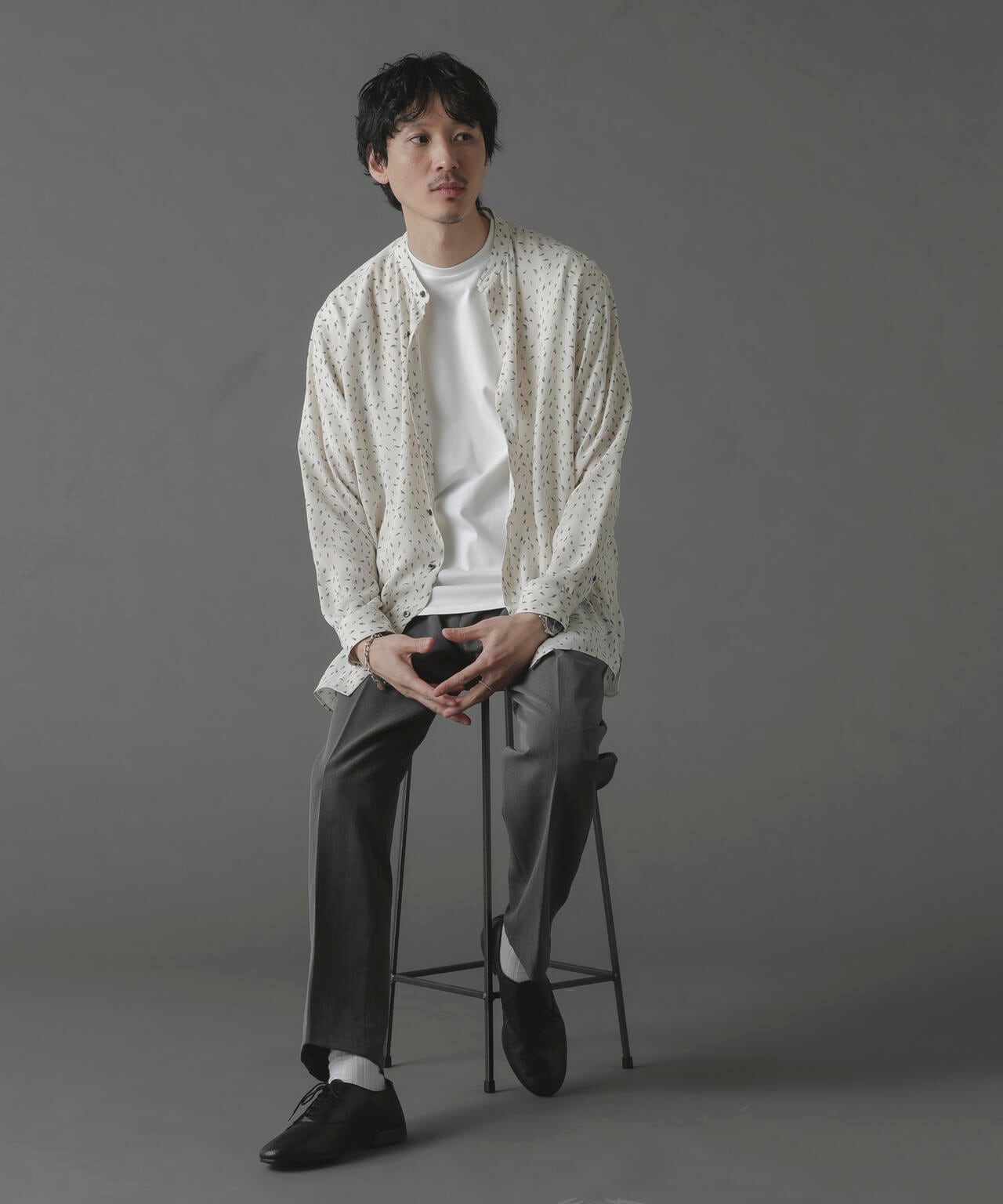 コーディネートの主役として映えるプリントバンドカラーシャツ。