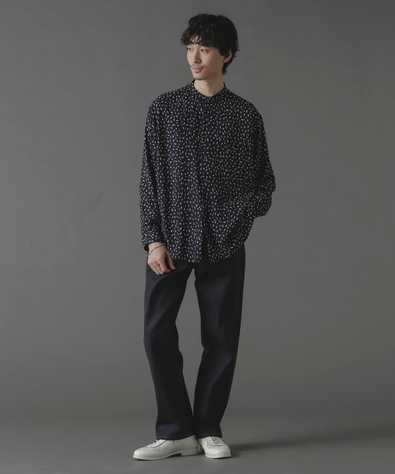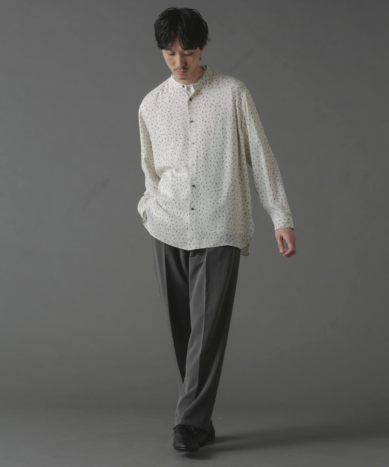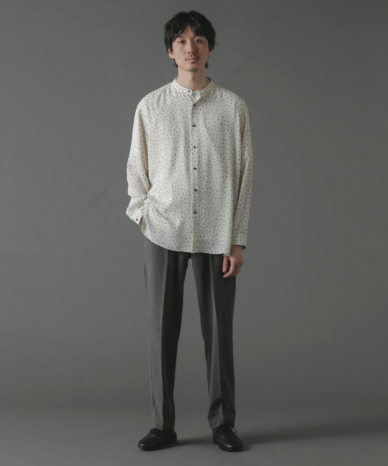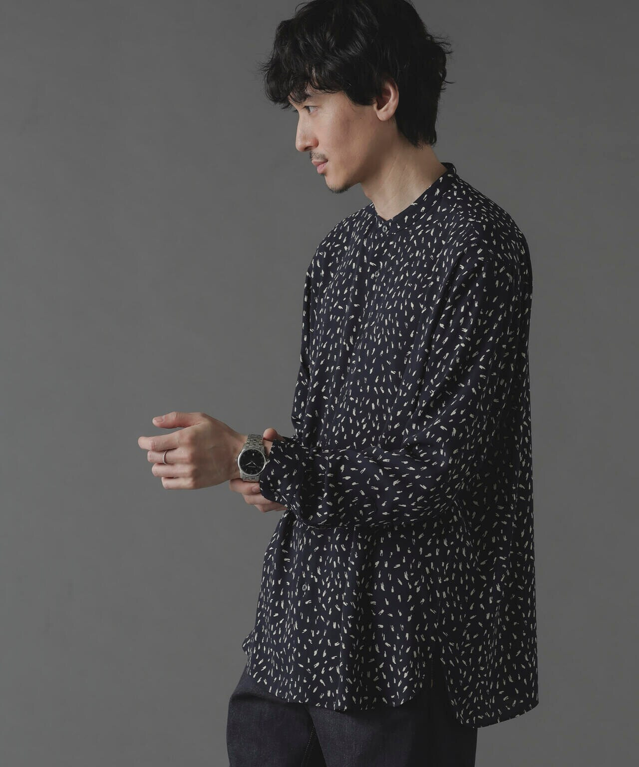 コーディネートの主役として映えるプリントバンドカラーシャツ。