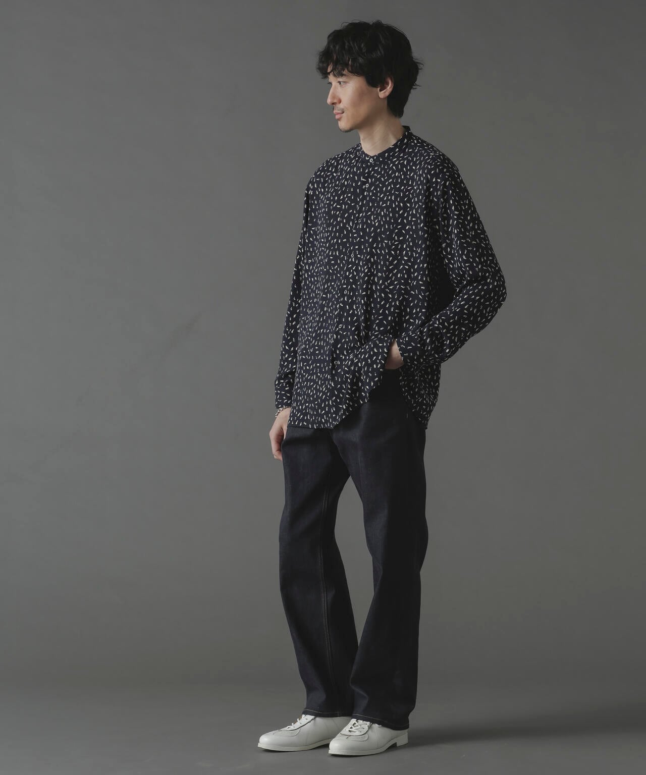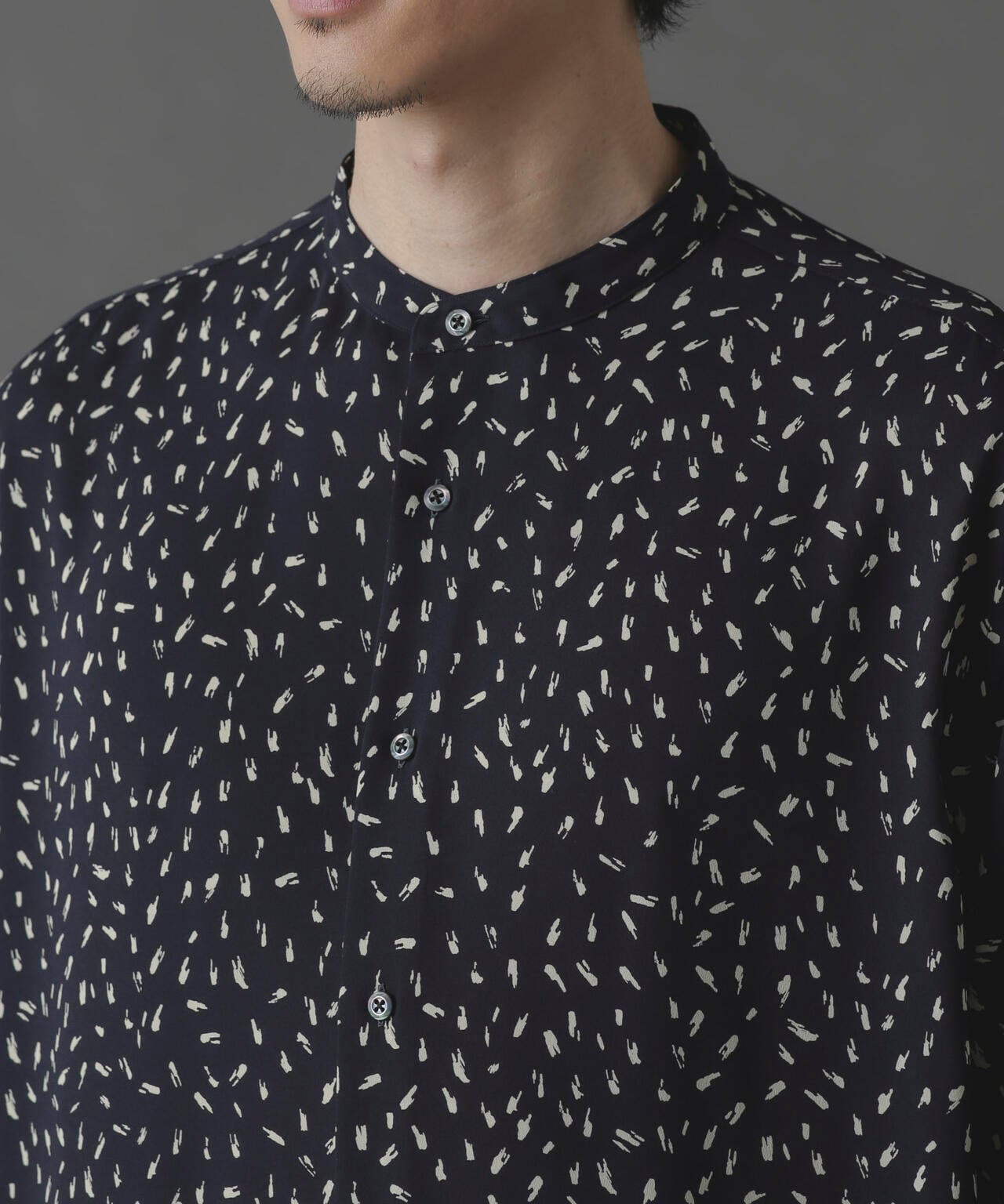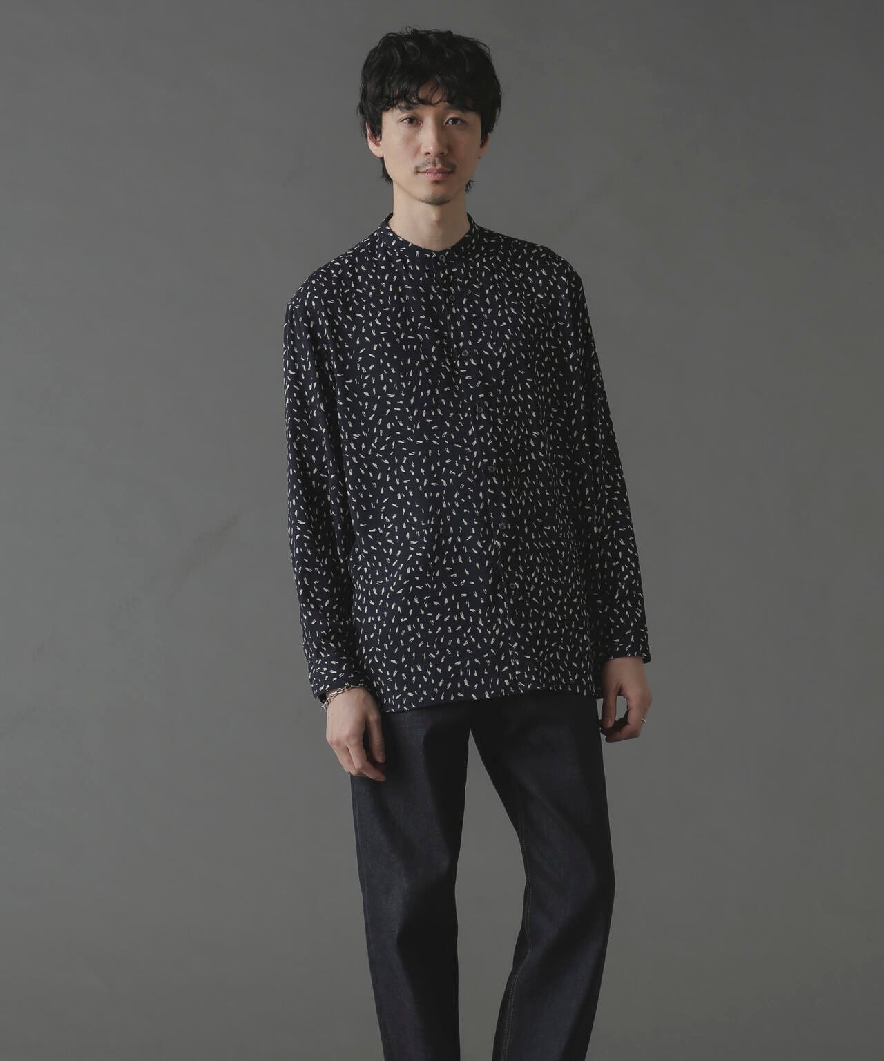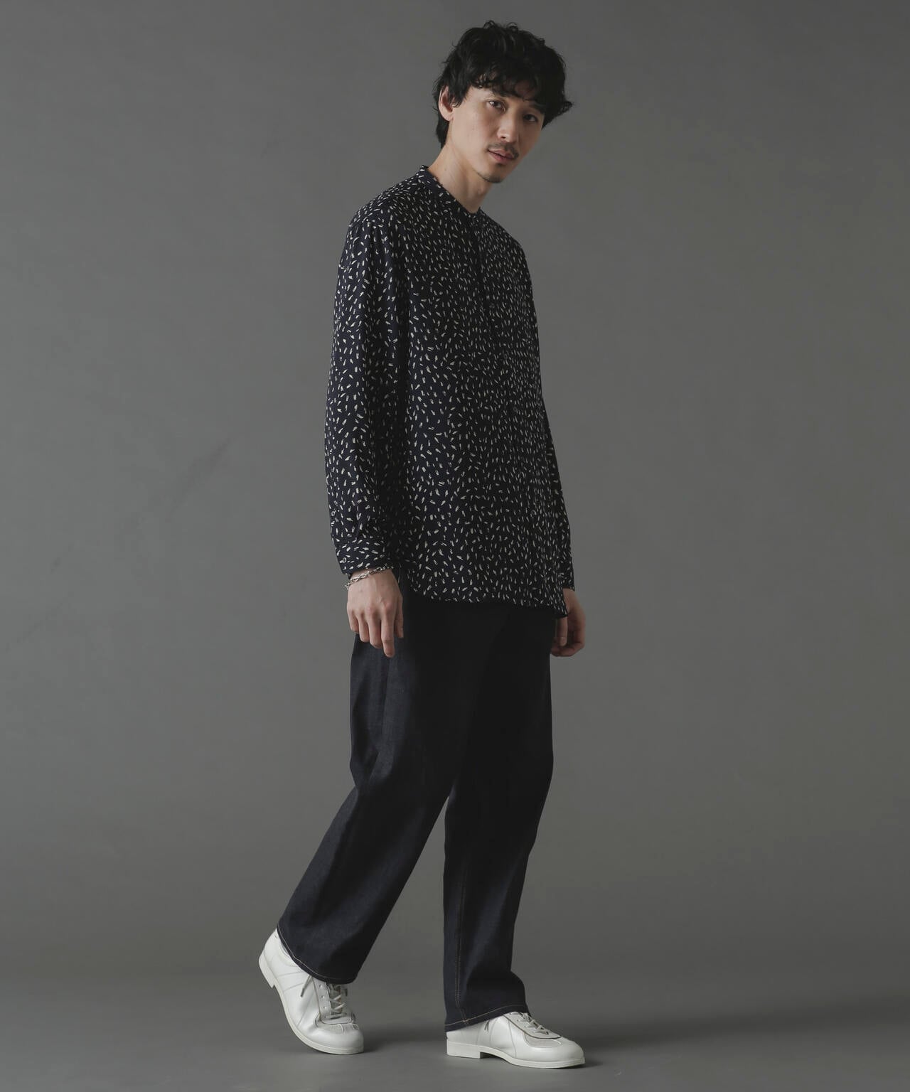 コーディネートの主役として映えるプリントバンドカラーシャツ。
