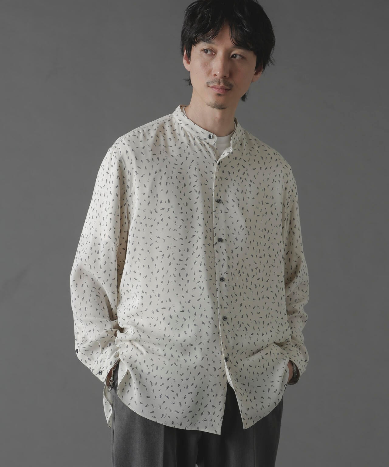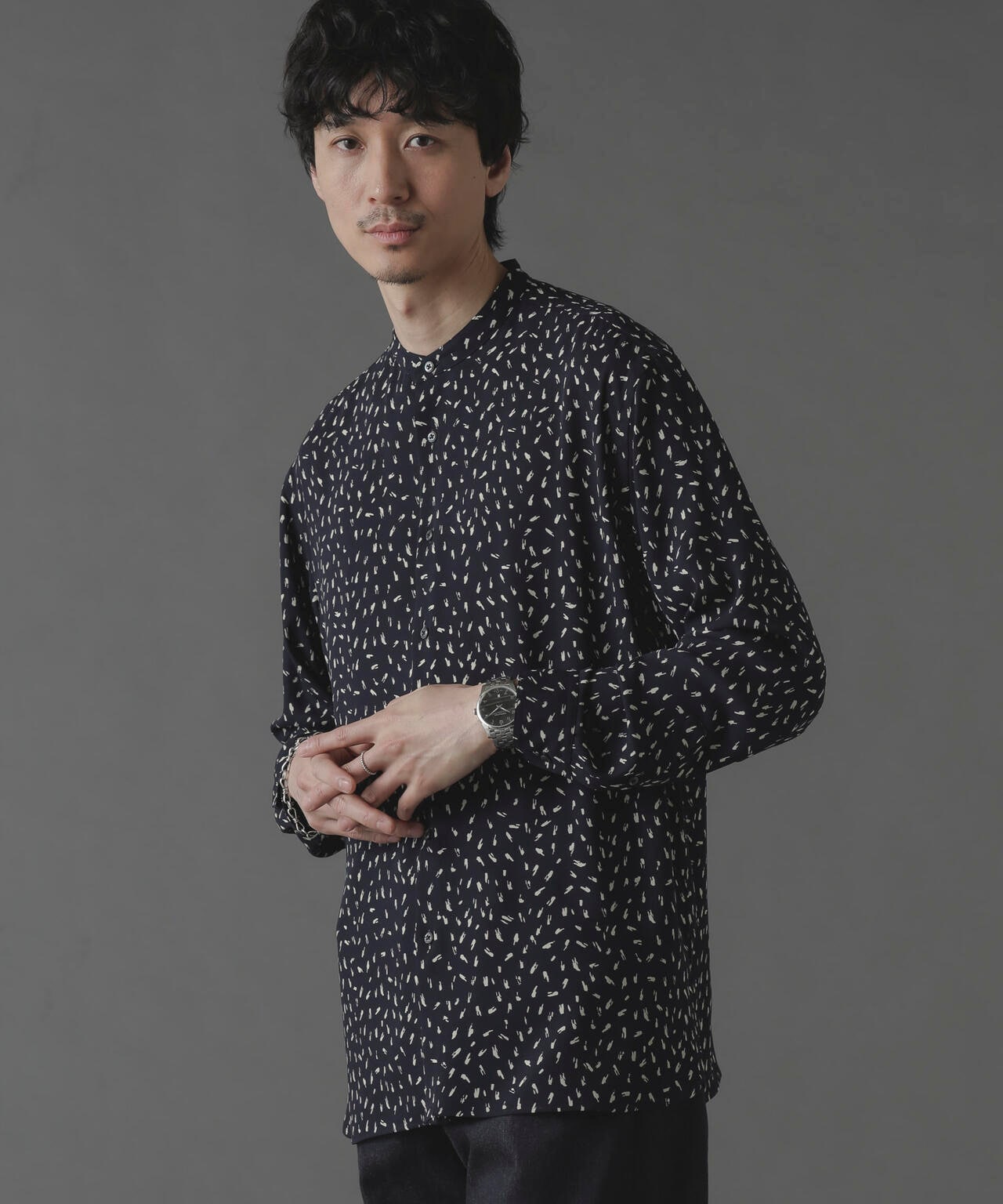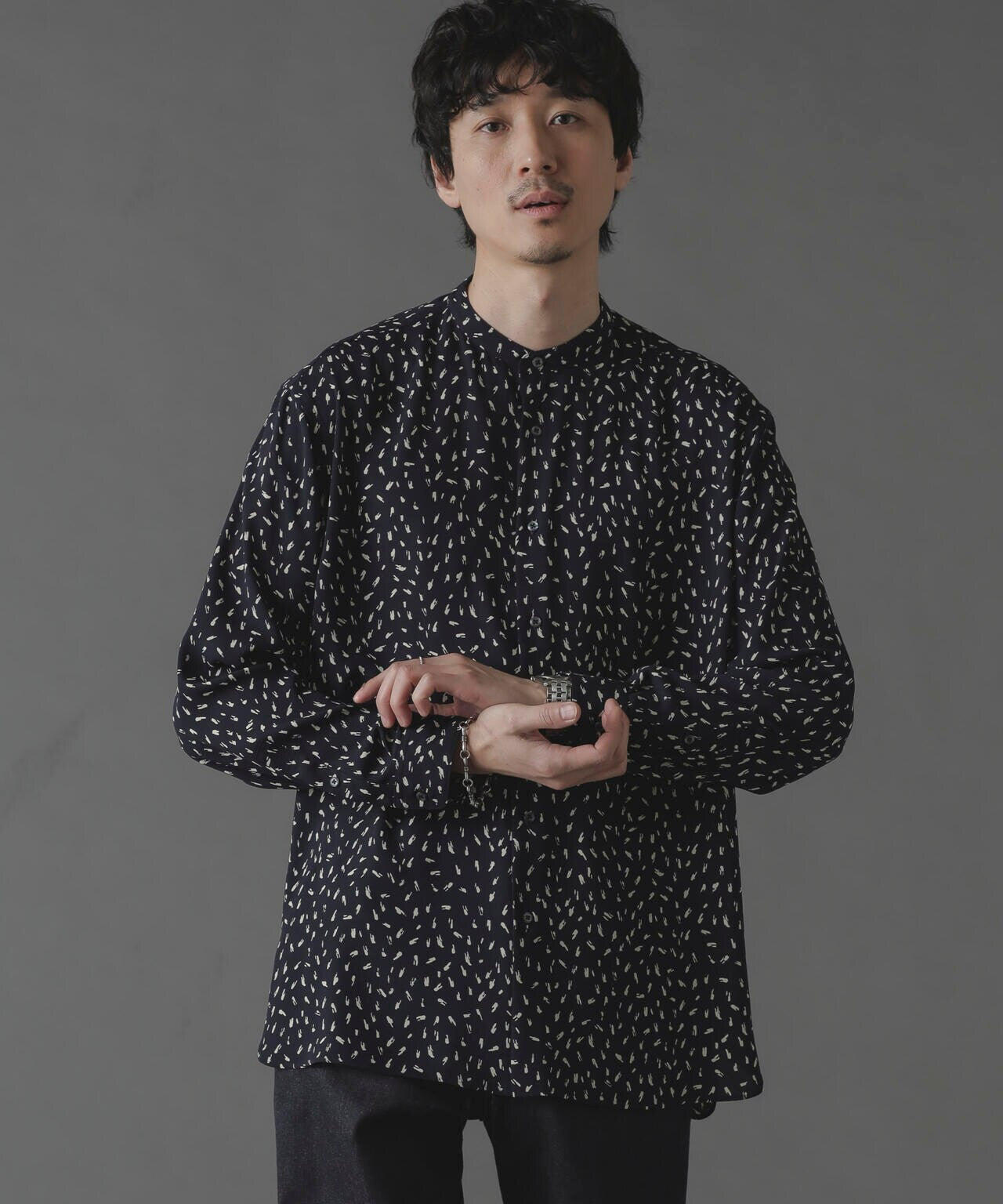 ・コーディネートの主役として映えるプリントバンドカラーシャツ