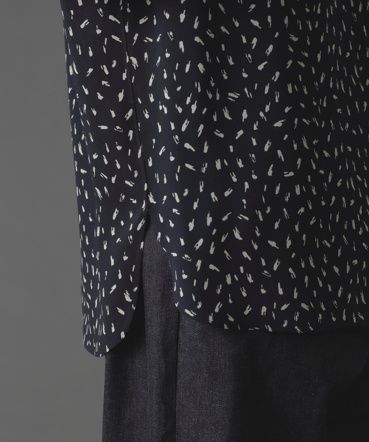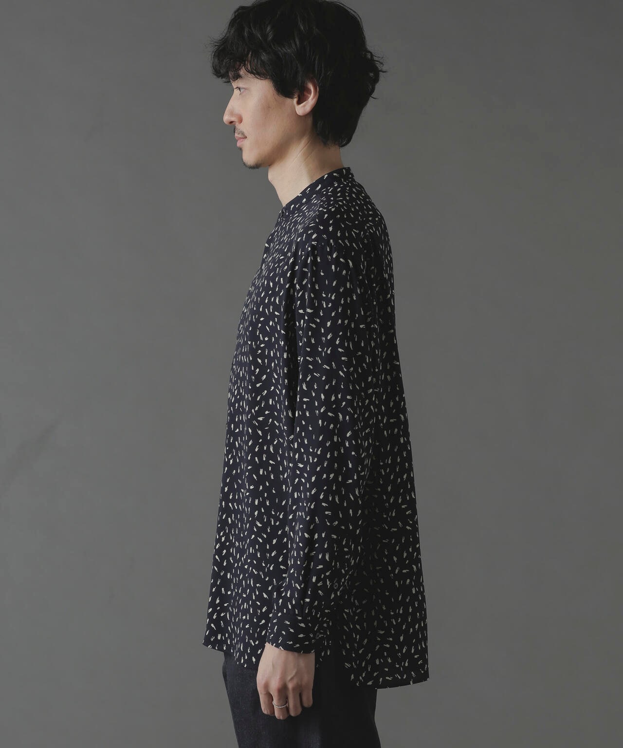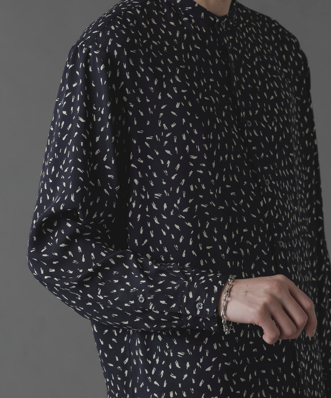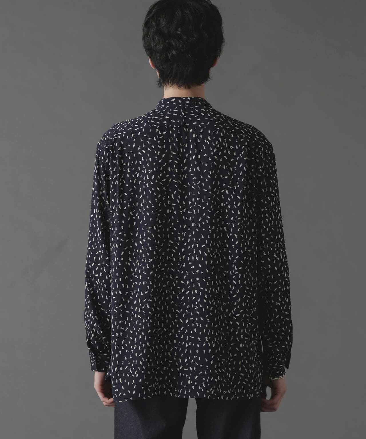 ・コーディネートの主役として映えるプリントバンドカラーシャツ