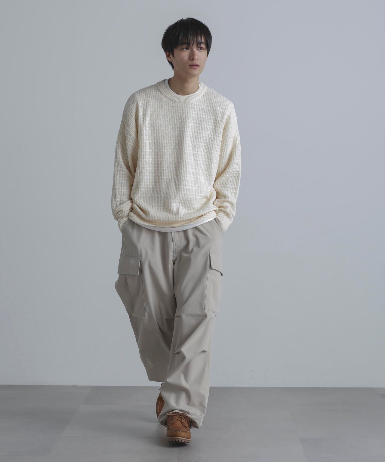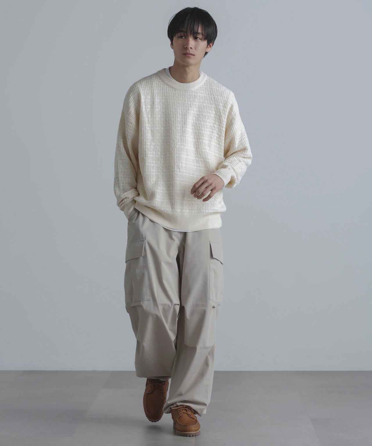 テープヤーン・ブークレヤーン等の特徴のある糸を使い、立体感のある雰囲気に仕上げたアイテム。