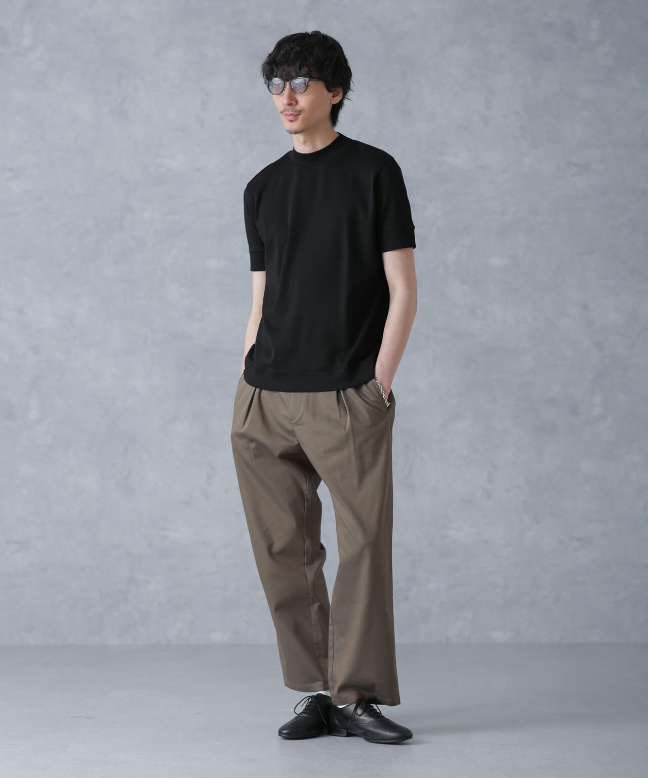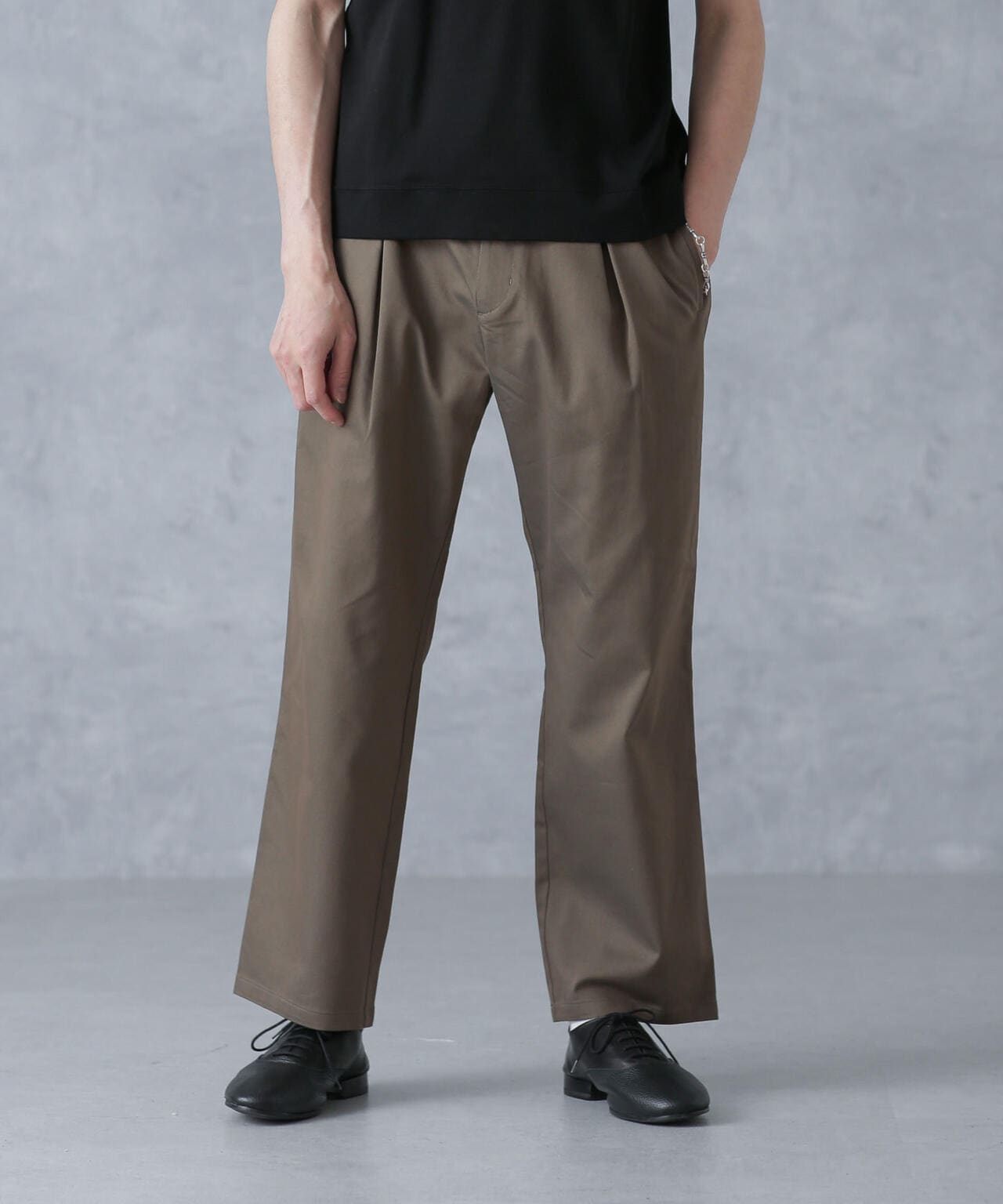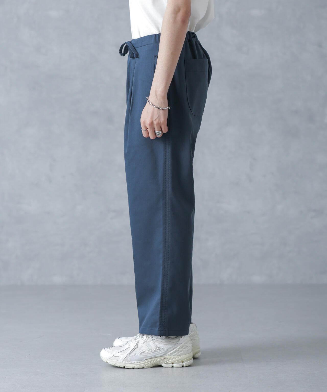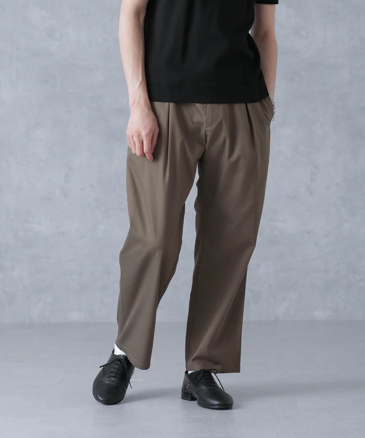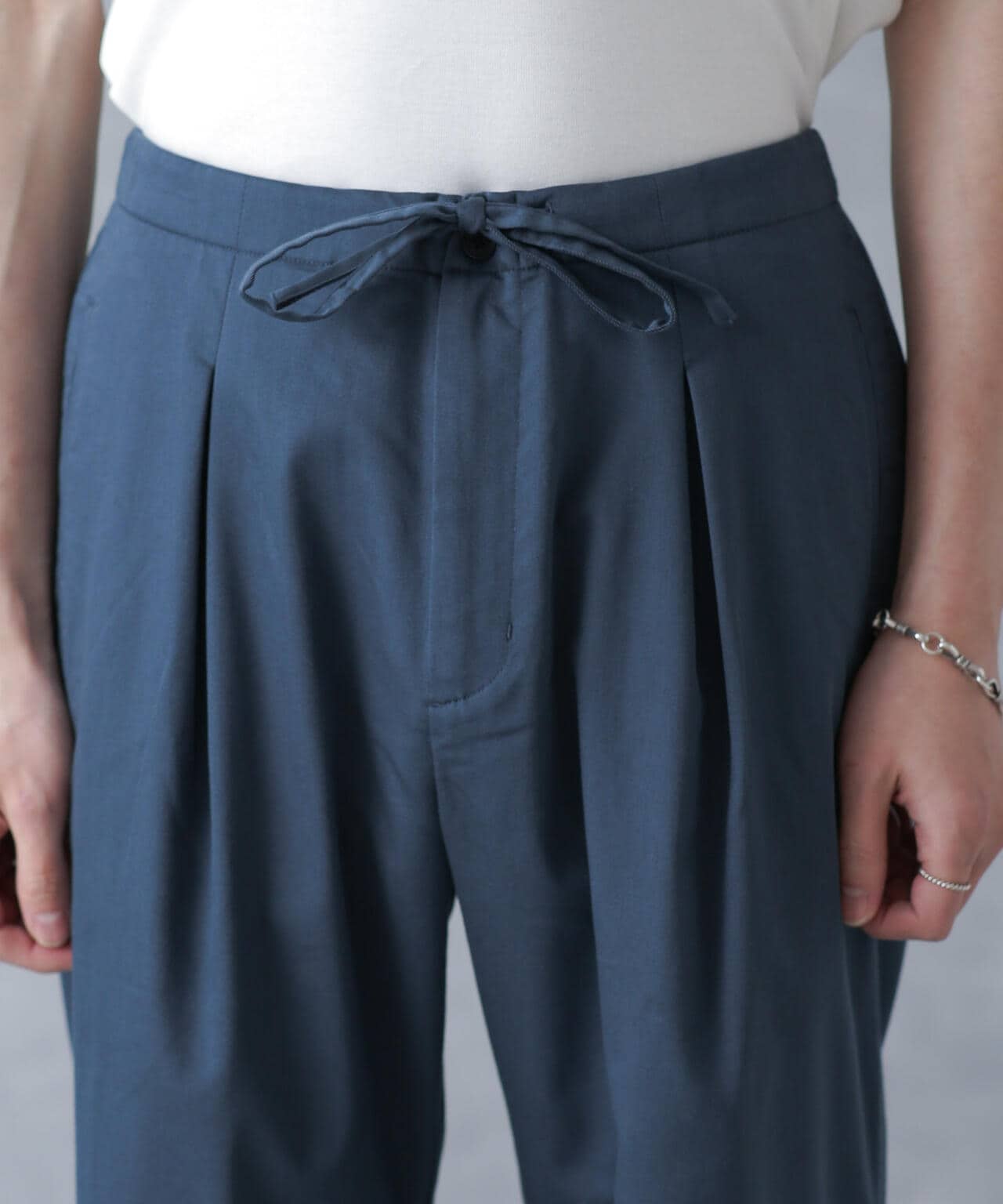 程よくリラックスしたシルエットでありながら、フロントのタックがスッキリとした印象に仕上げてくれます。