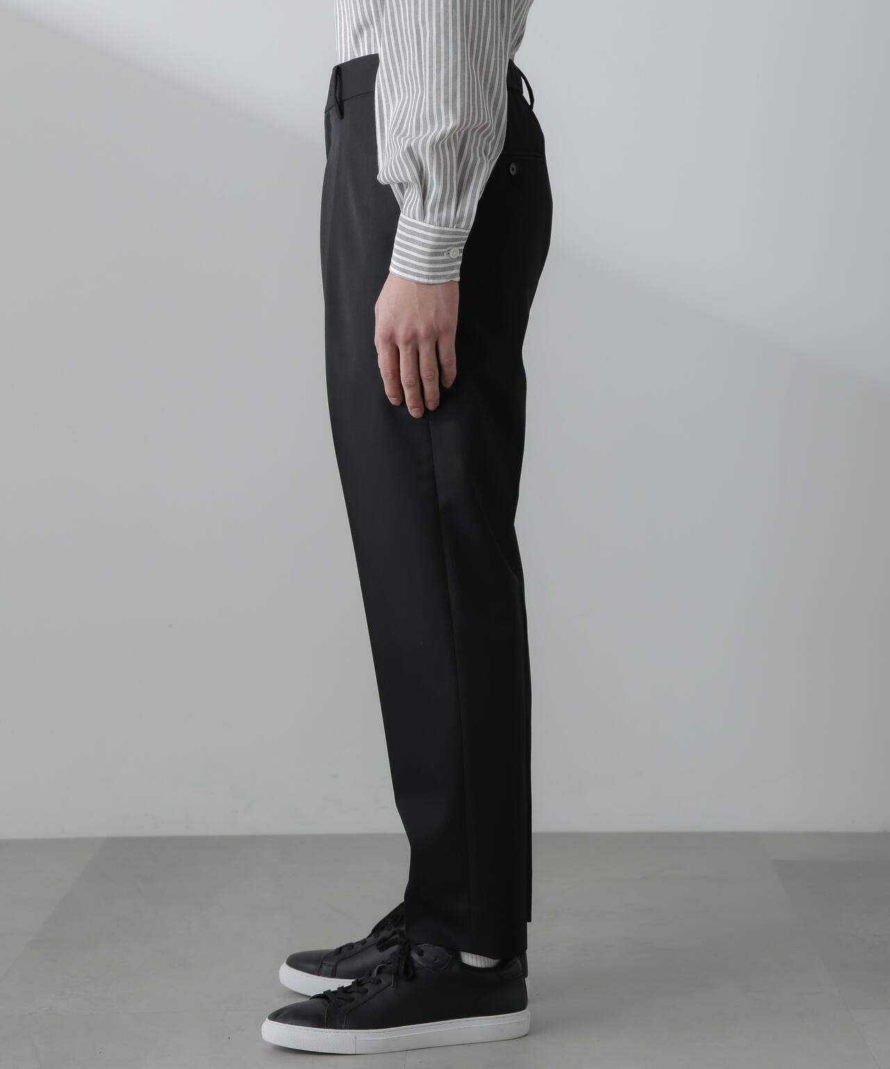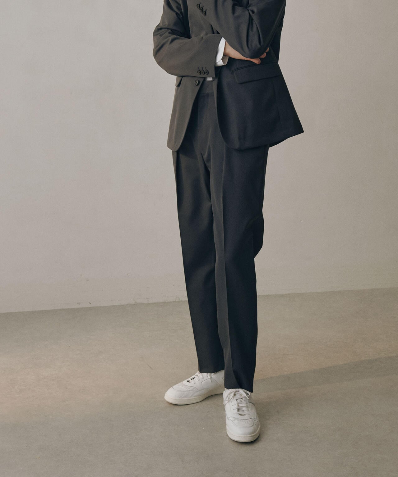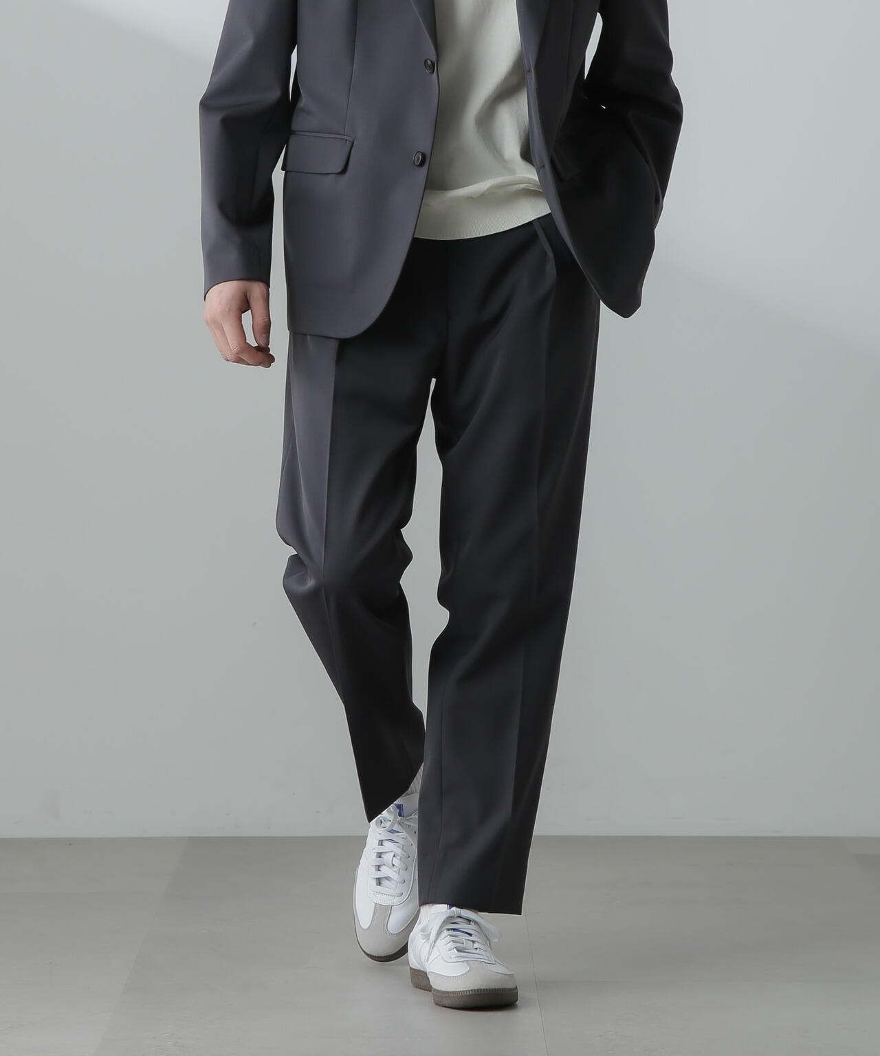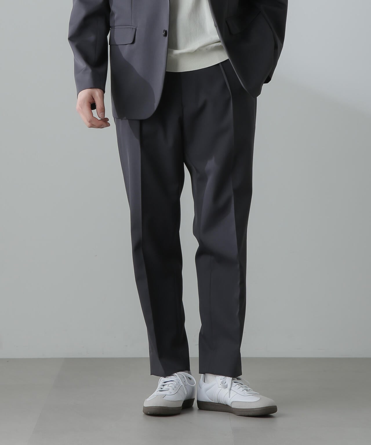 ウールのドレープ性と保形性を併せ持ち、クリース加工でキレイなテーパードシルエットを保てる仕様。