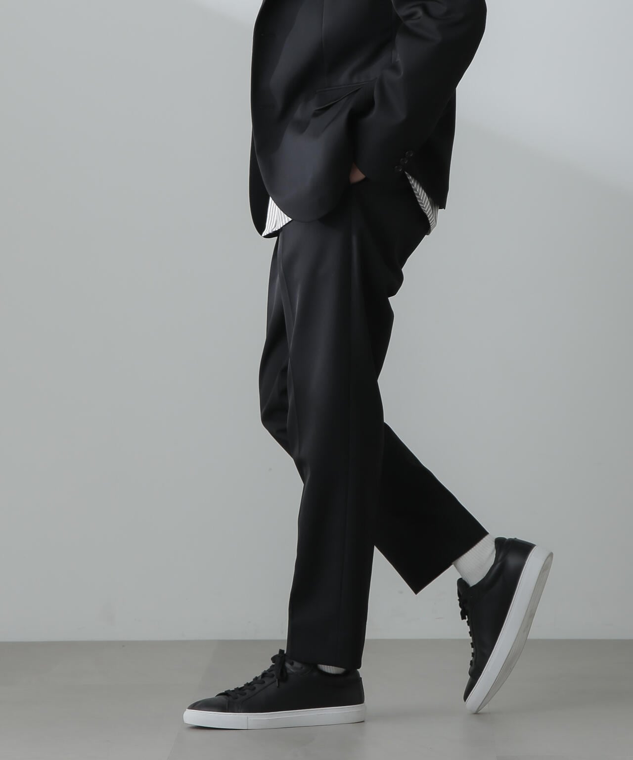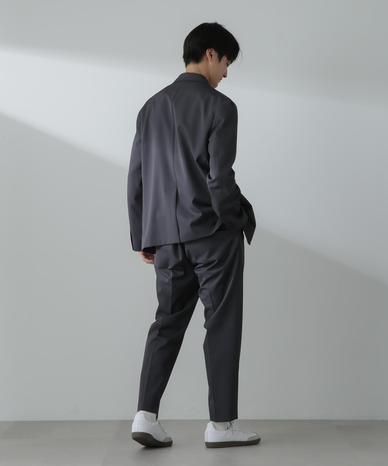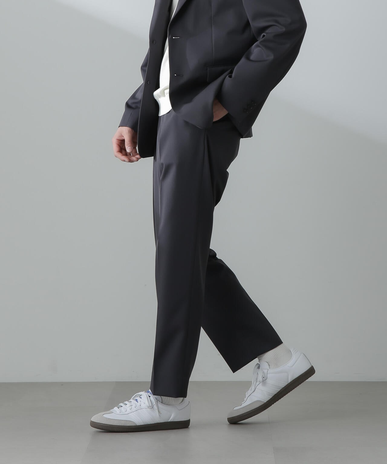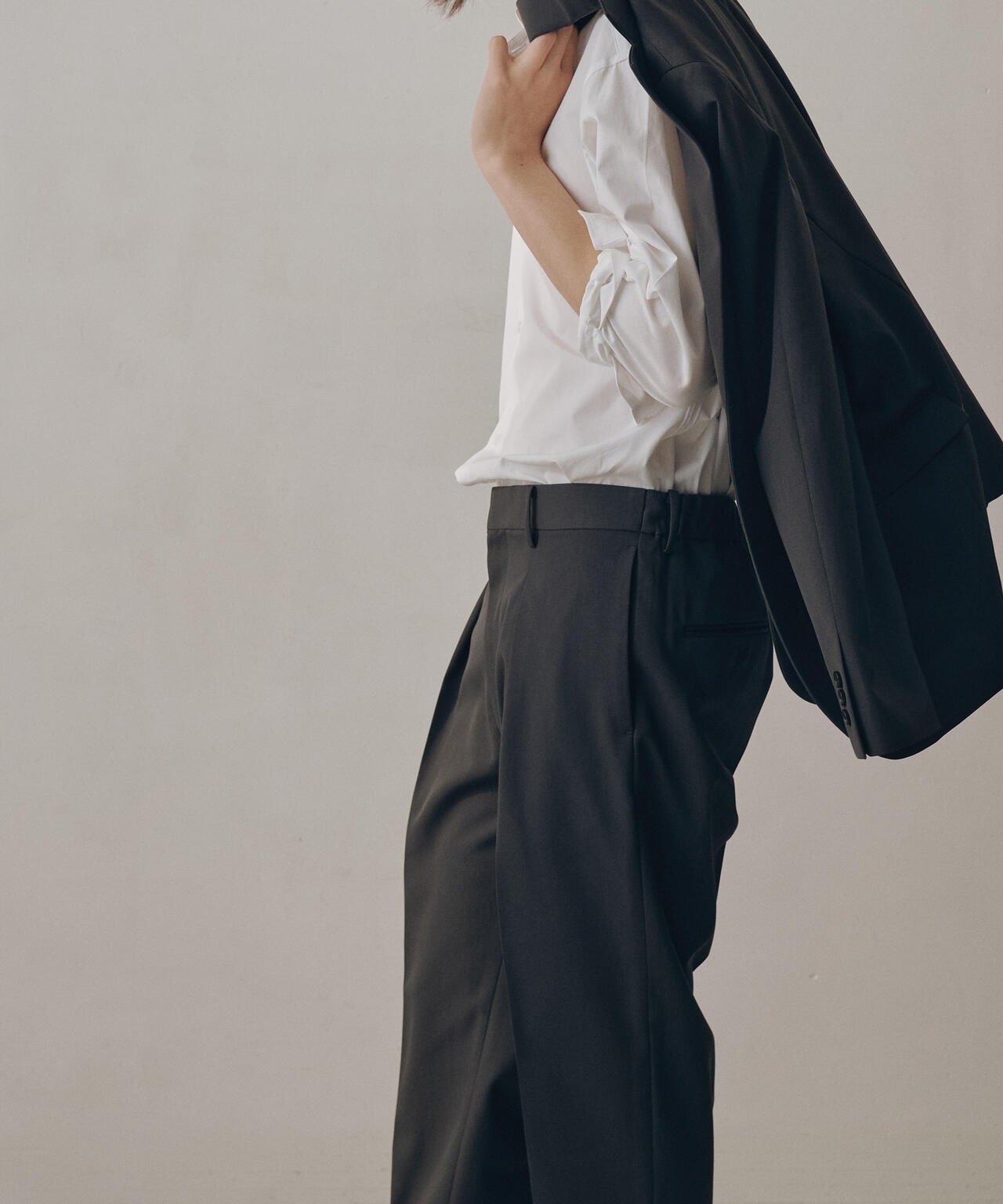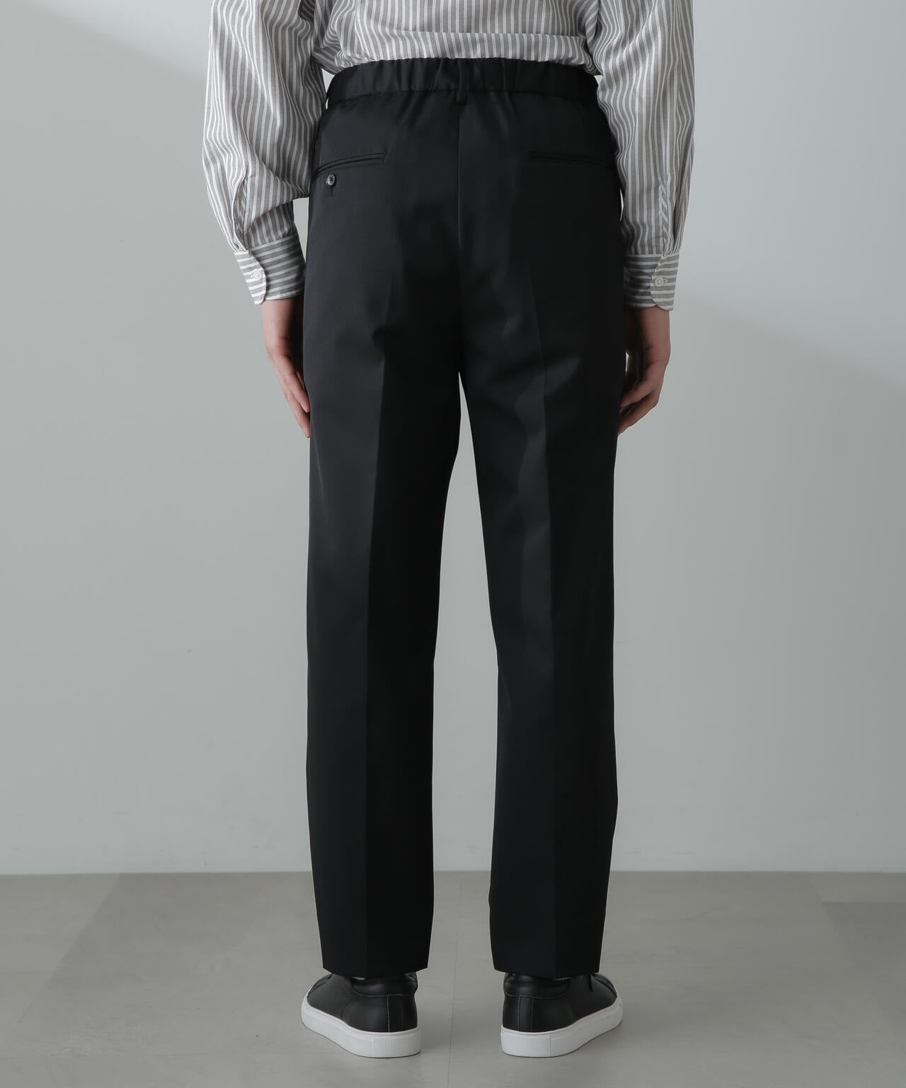 ウールのドレープ性と保形性を併せ持ち、クリース加工でキレイなテーパードシルエットを保てる仕様。