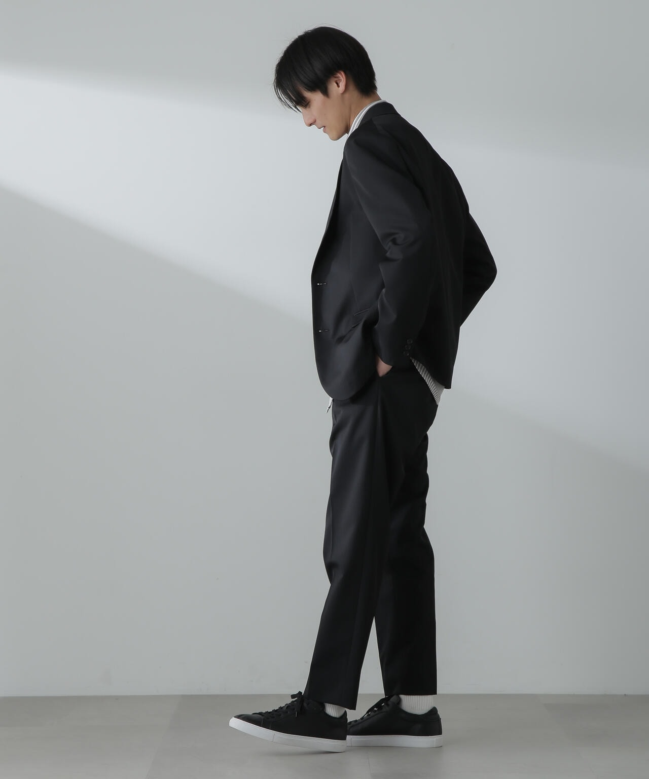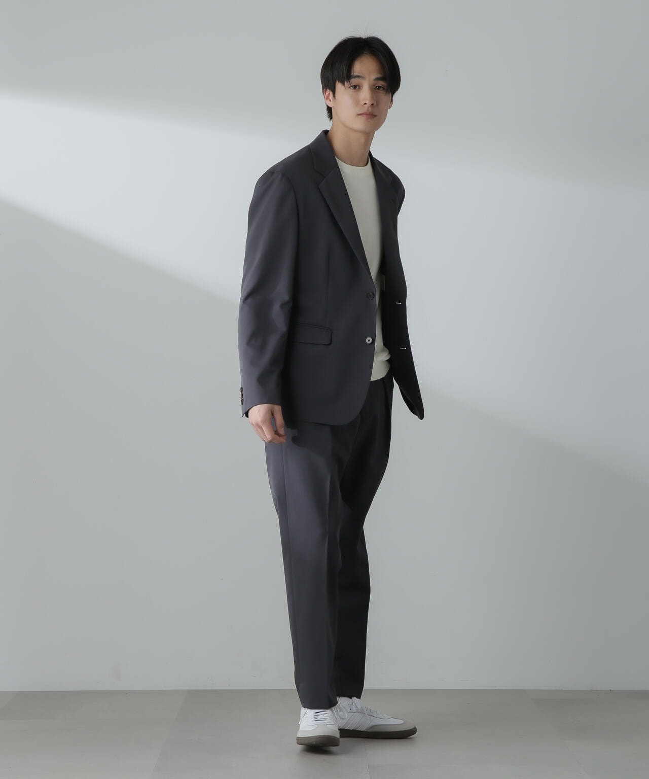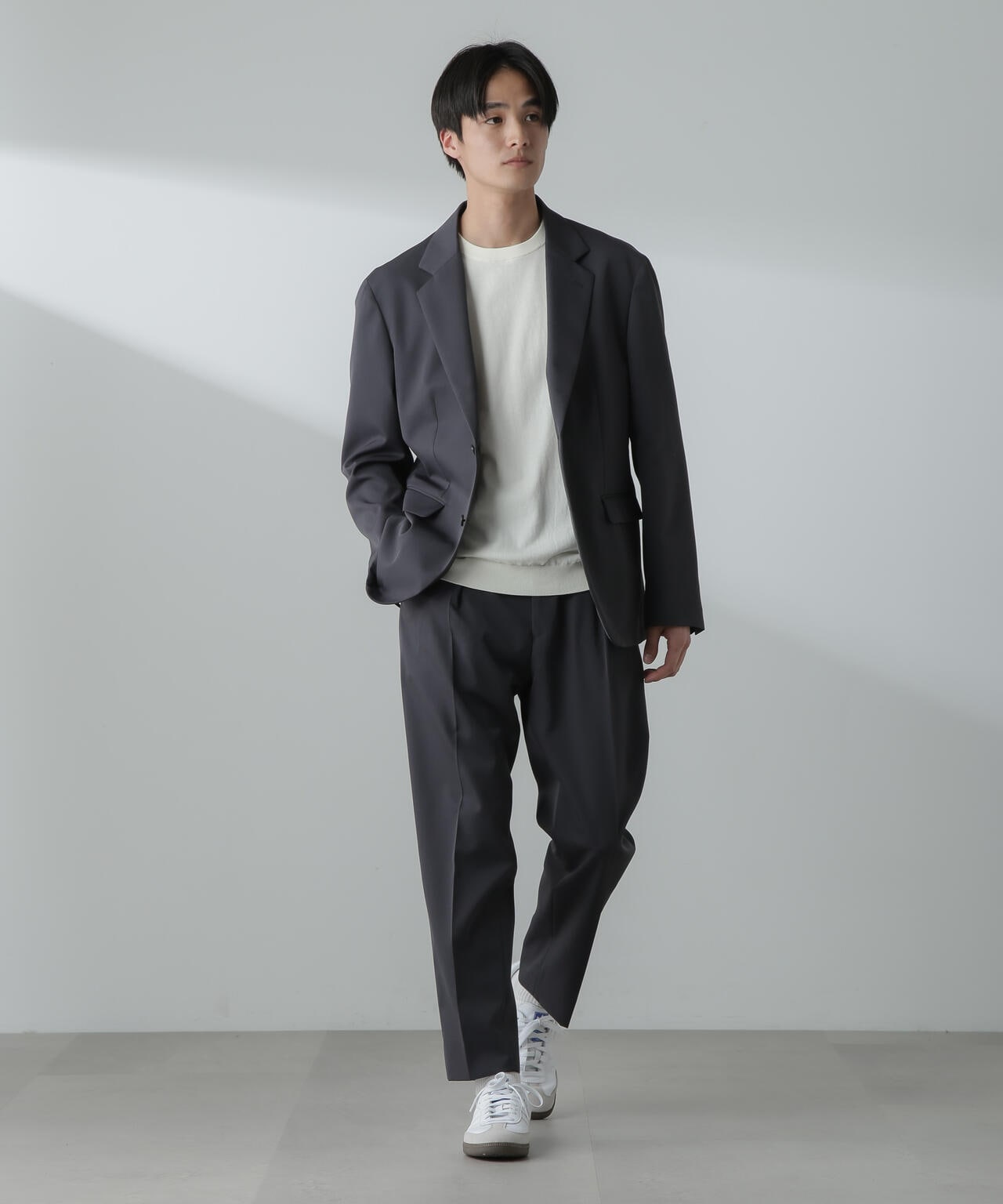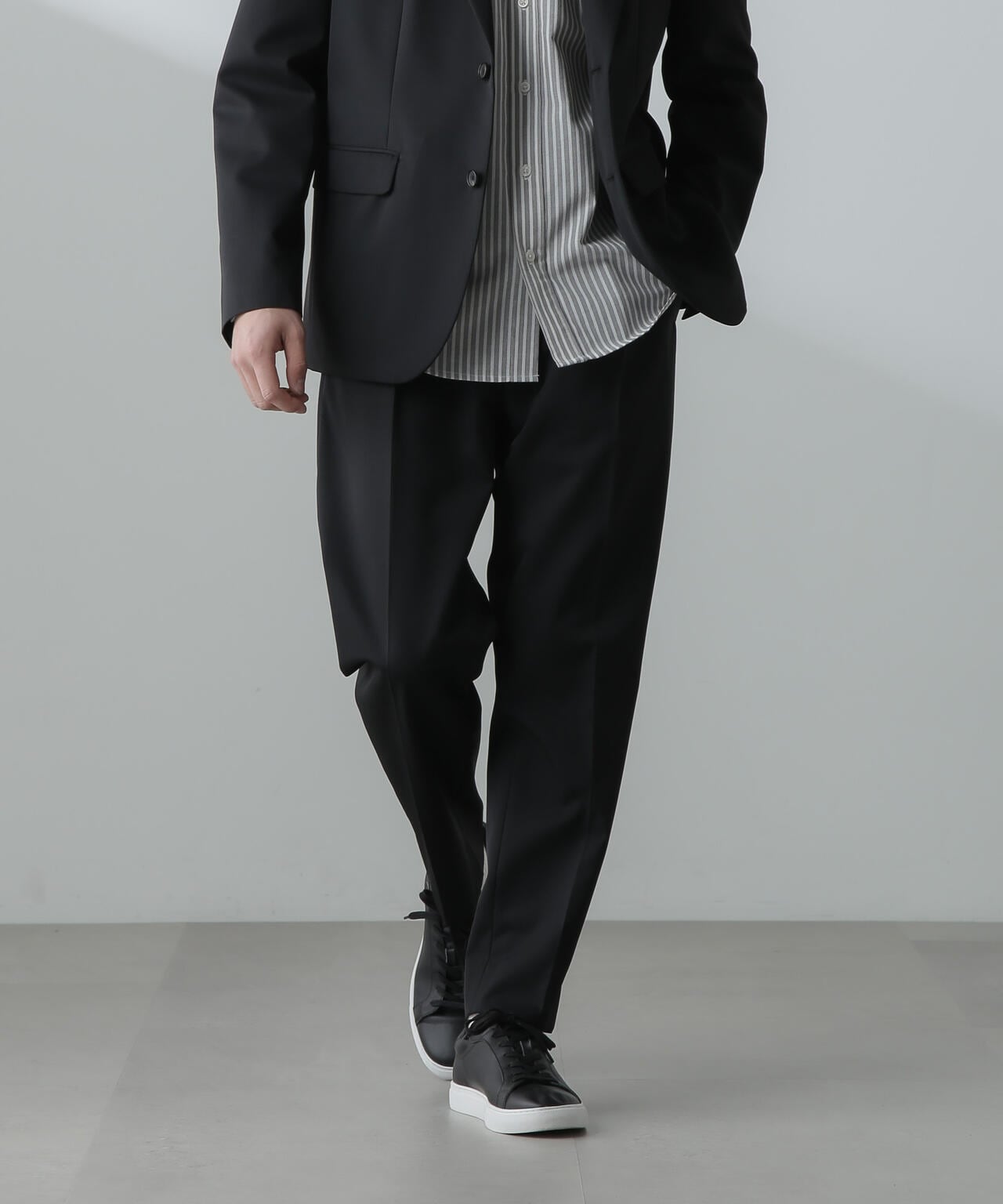 ウールのドレープ性と保形性を併せ持ち、クリース加工でキレイなテーパードシルエットを保てる仕様。