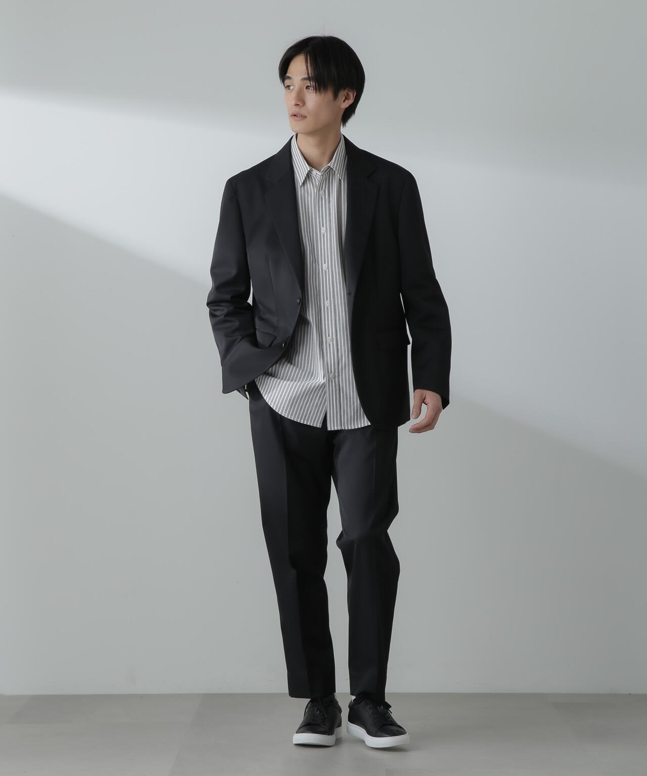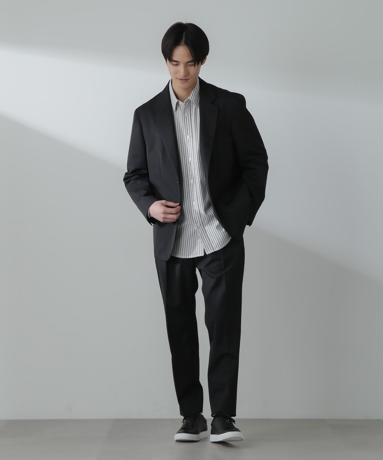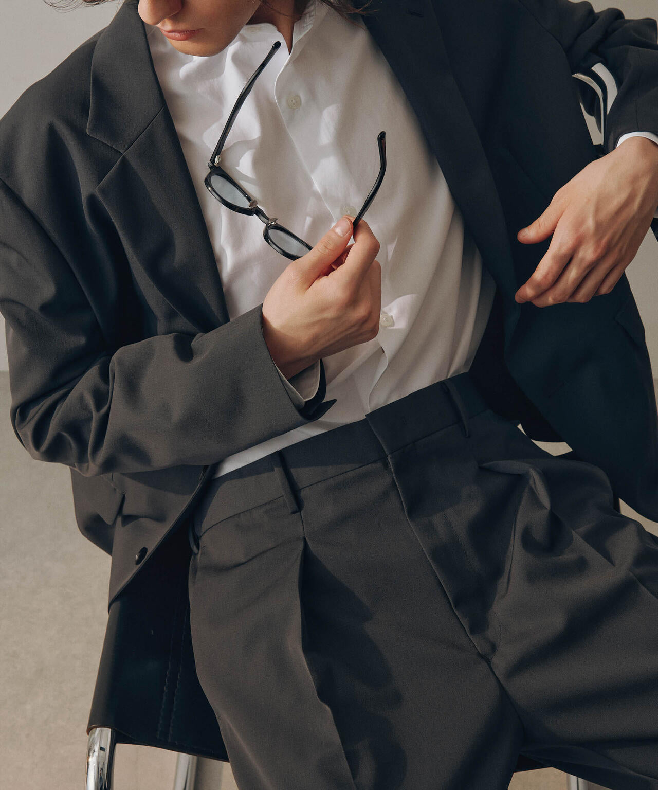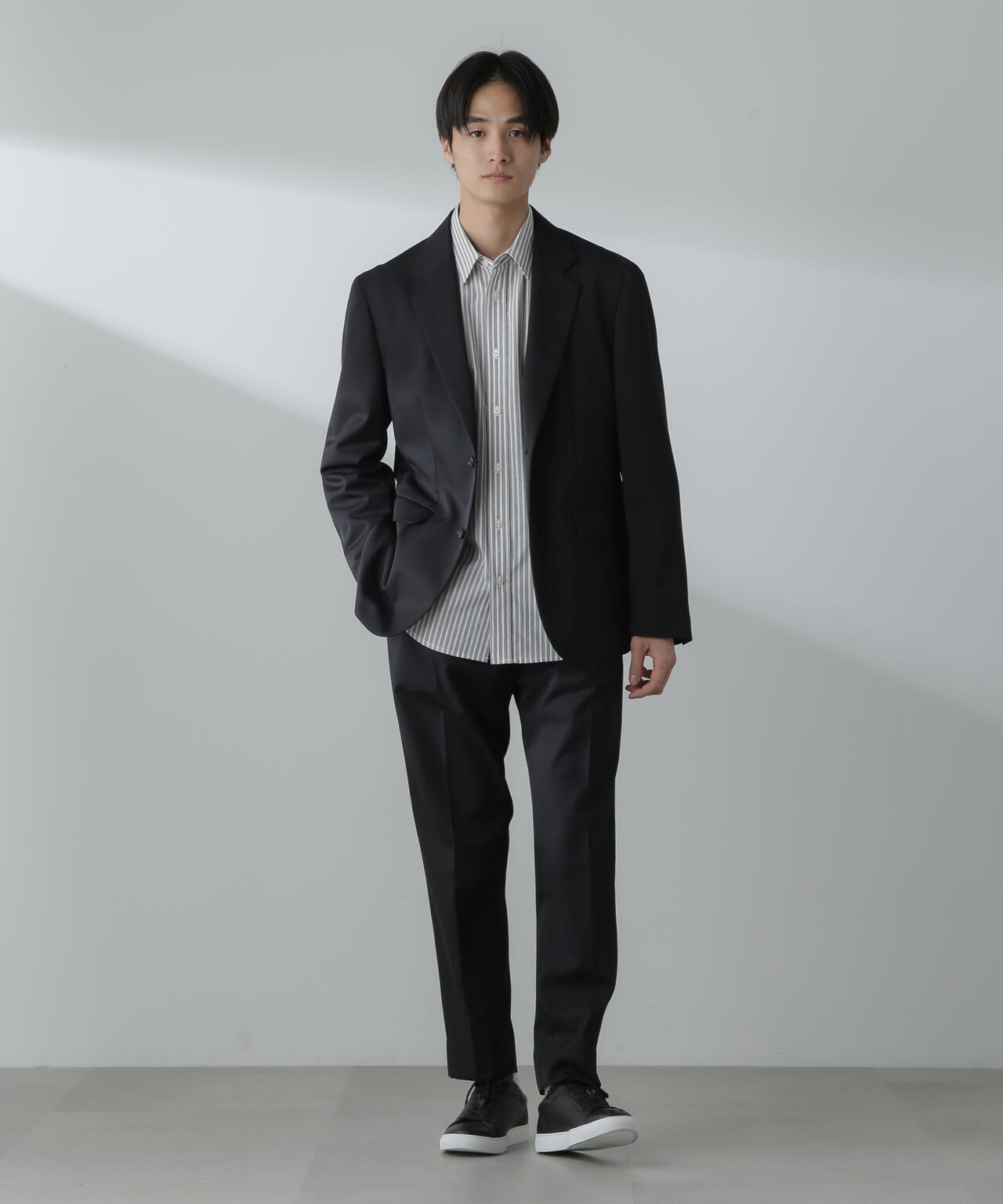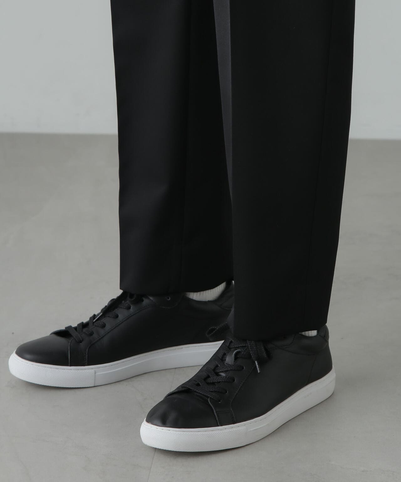 ウールのドレープ性と保形性を併せ持ち、クリース加工でキレイなテーパードシルエットを保てる仕様。