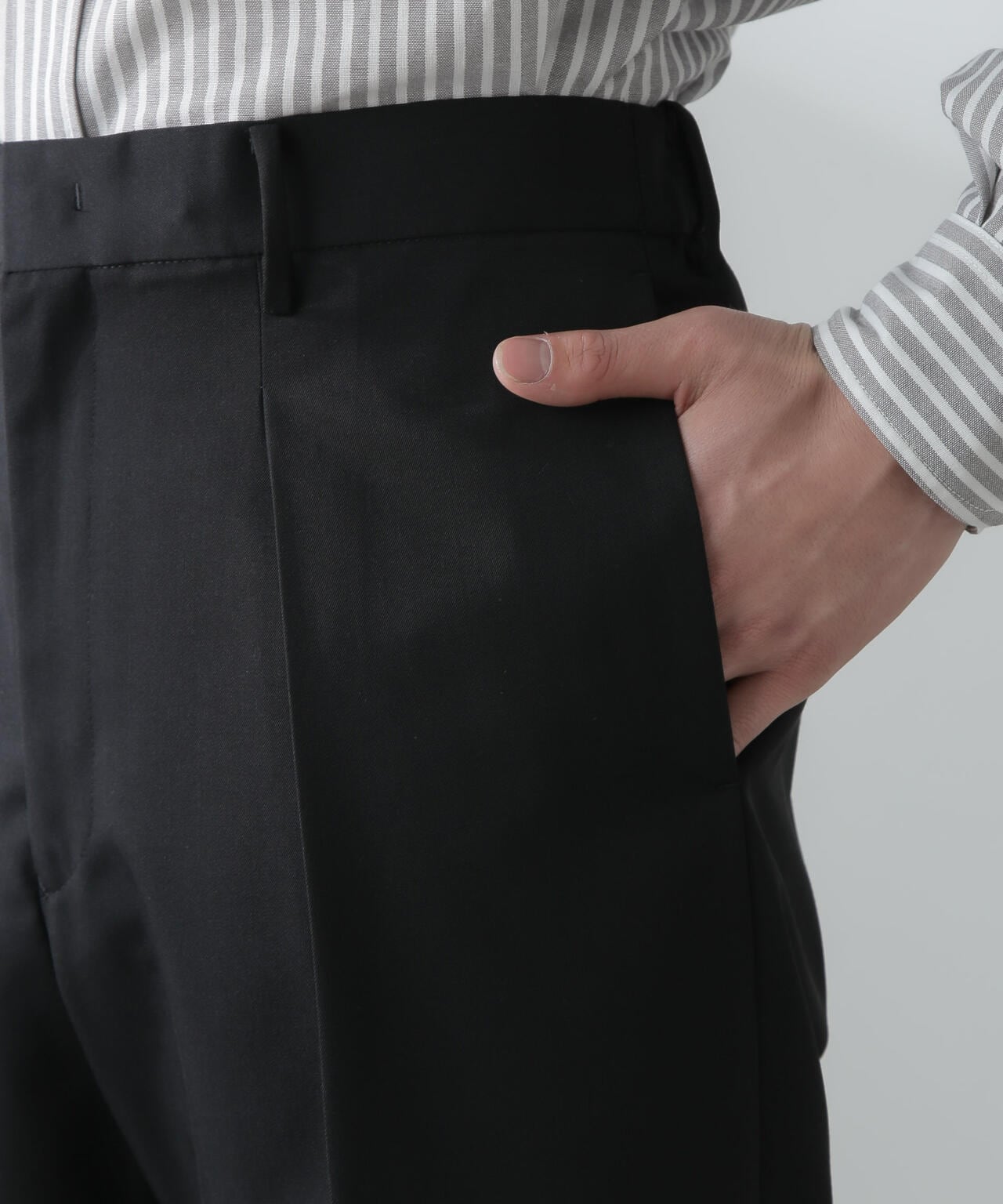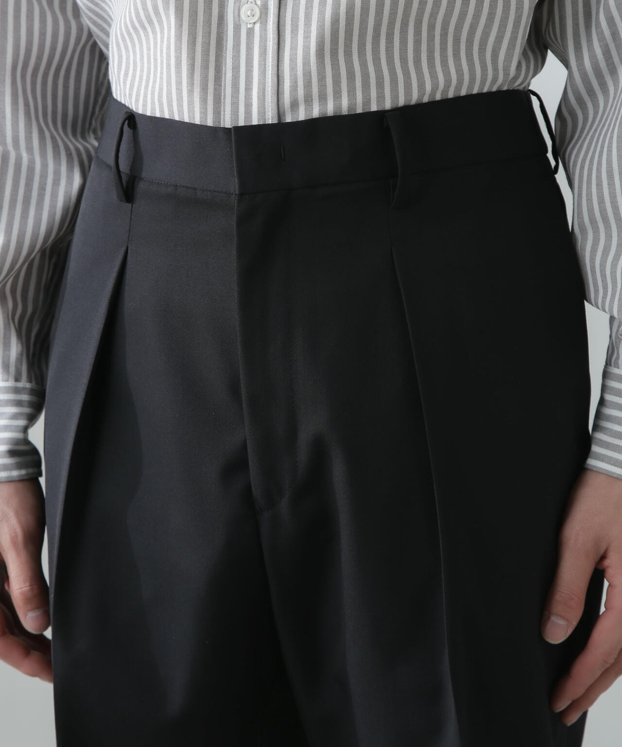 ・ウール×ポリエステルのギャバジンに含浸加工を施したスーツ生地を使用した1プリーツパンツ