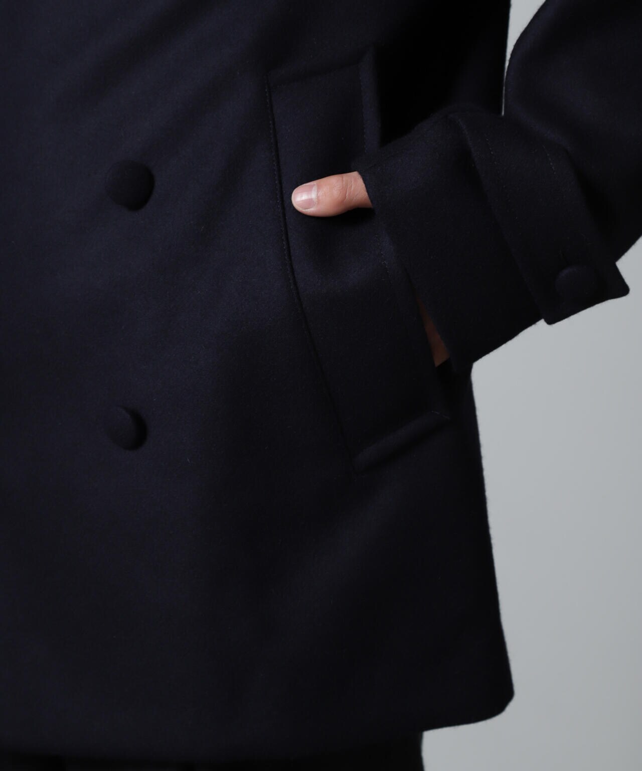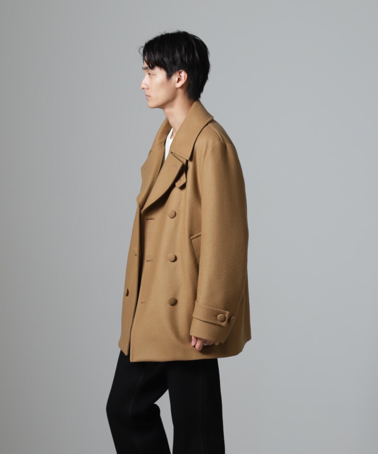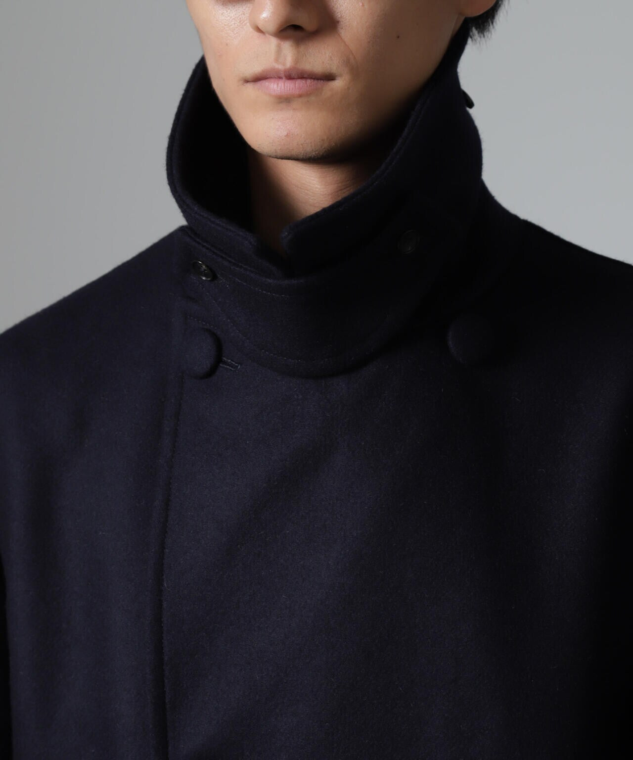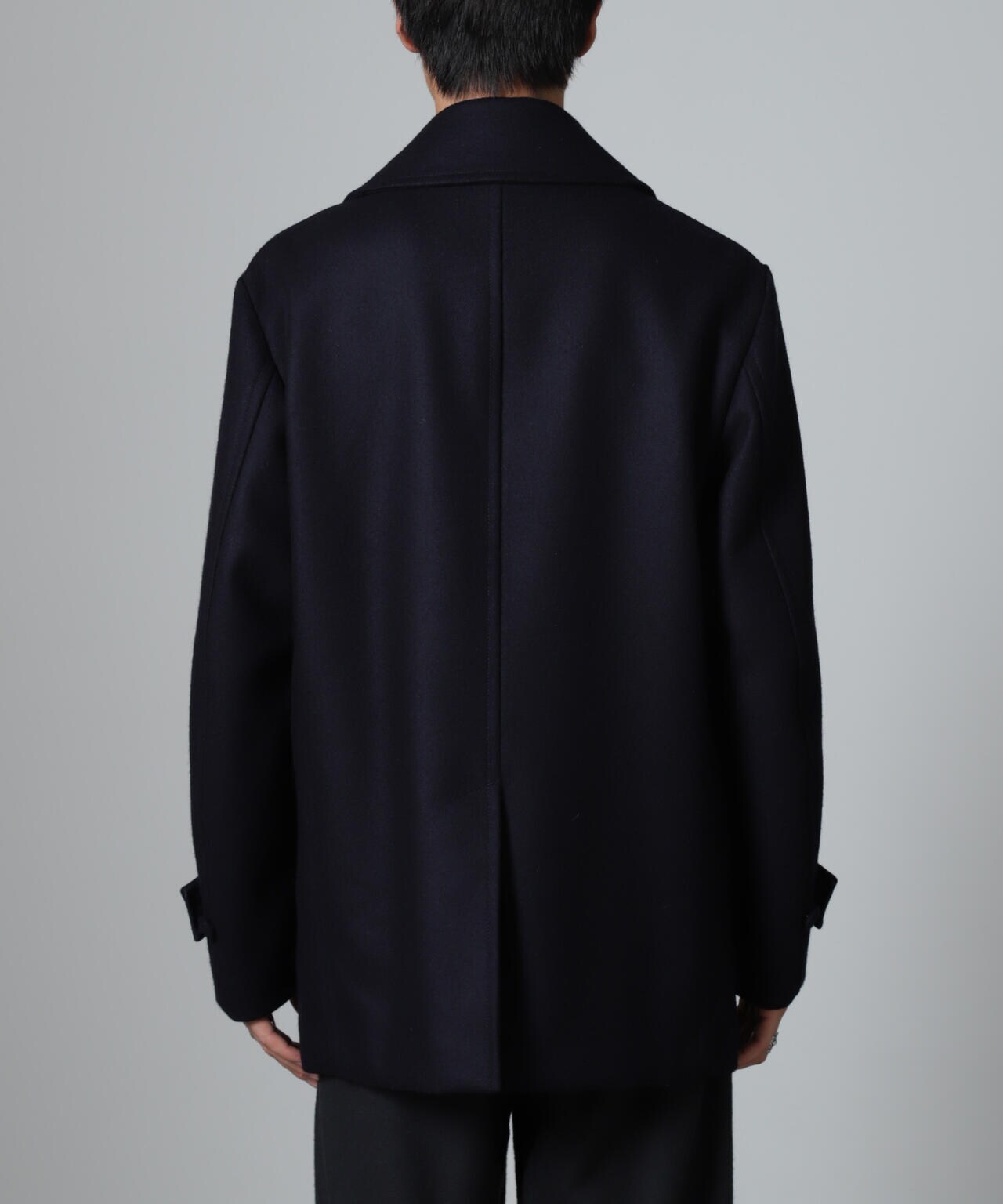 SUPER110'sウール原料使いの2重織りメルトンを使用したミドルレングスピーコート。