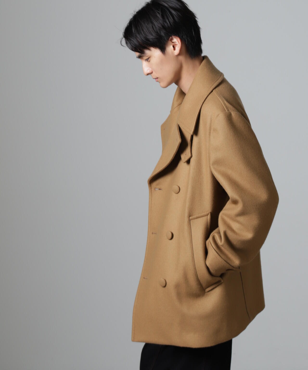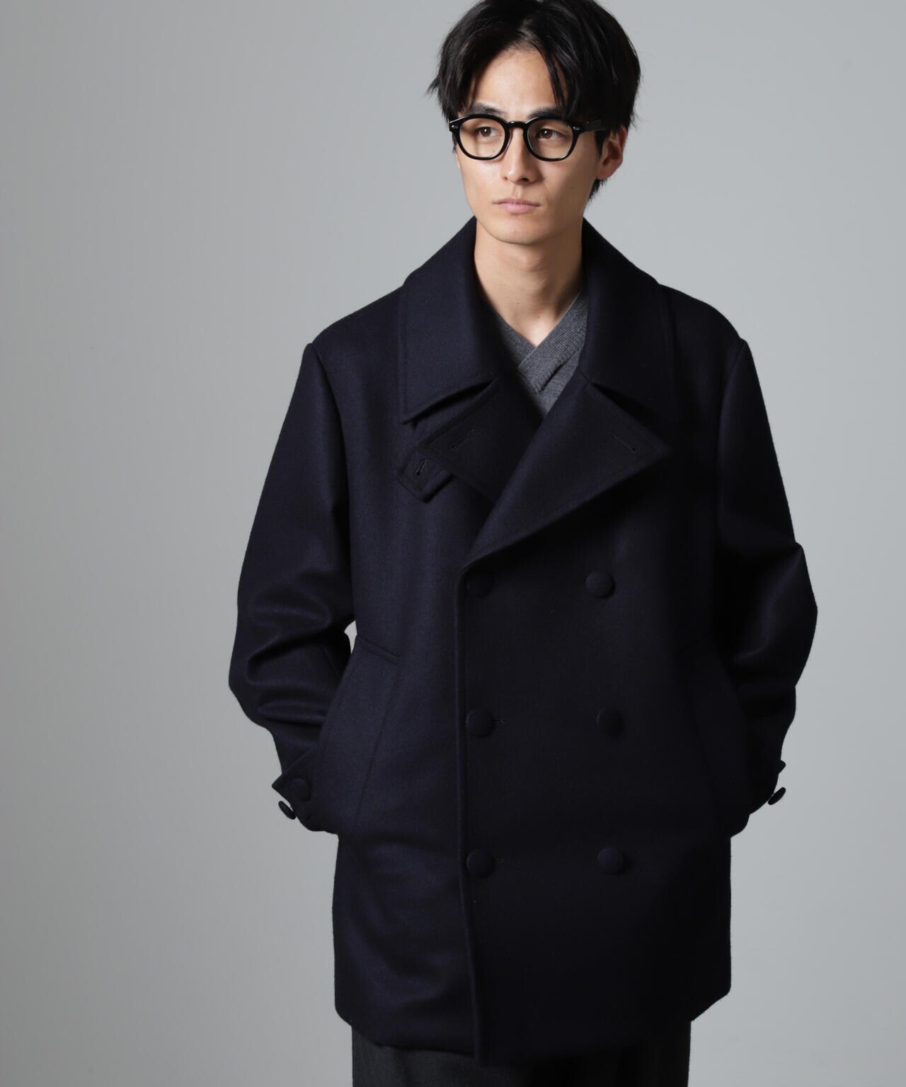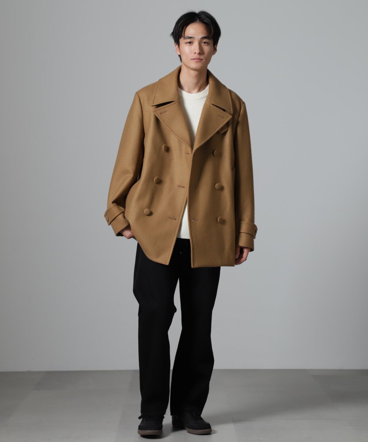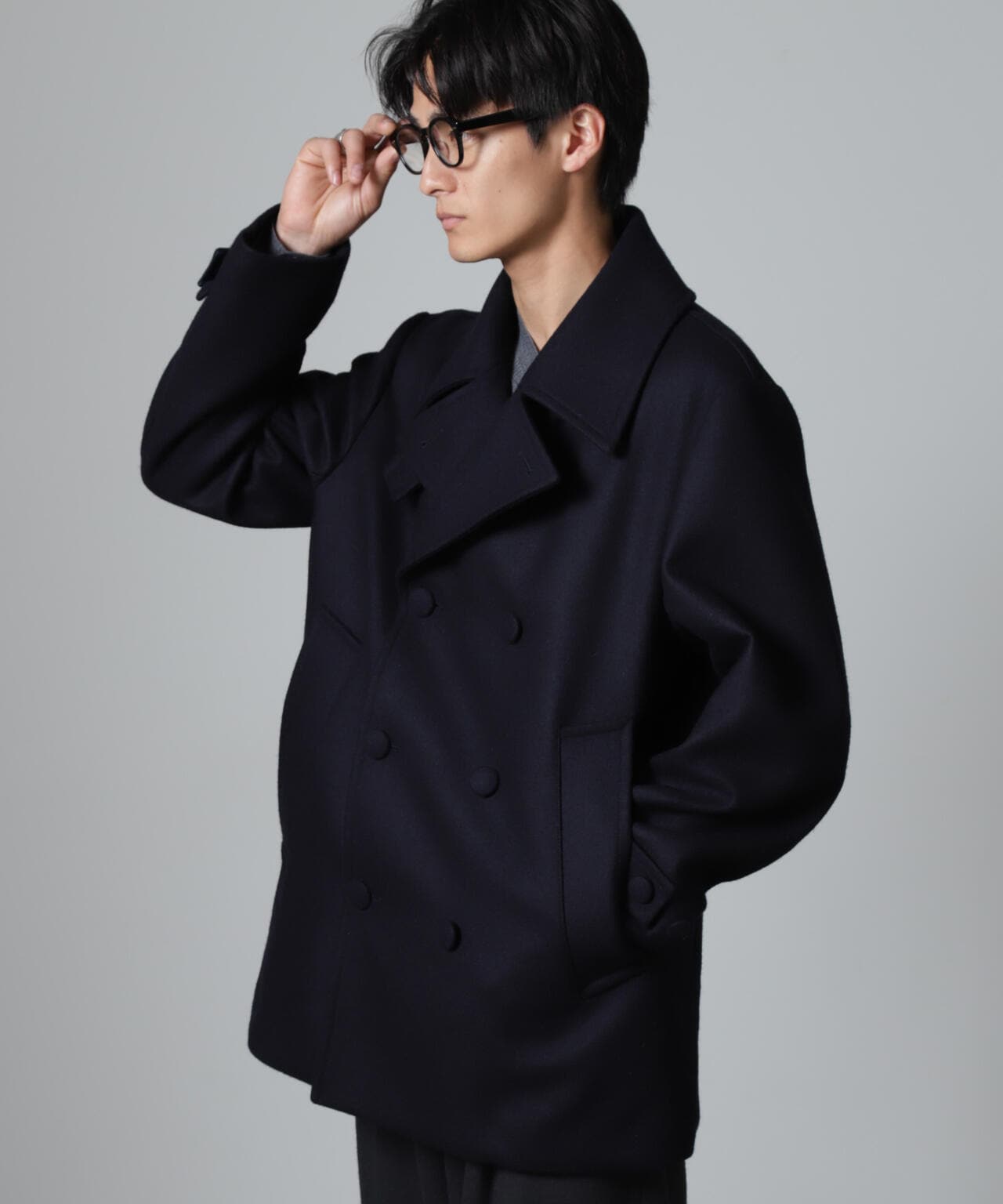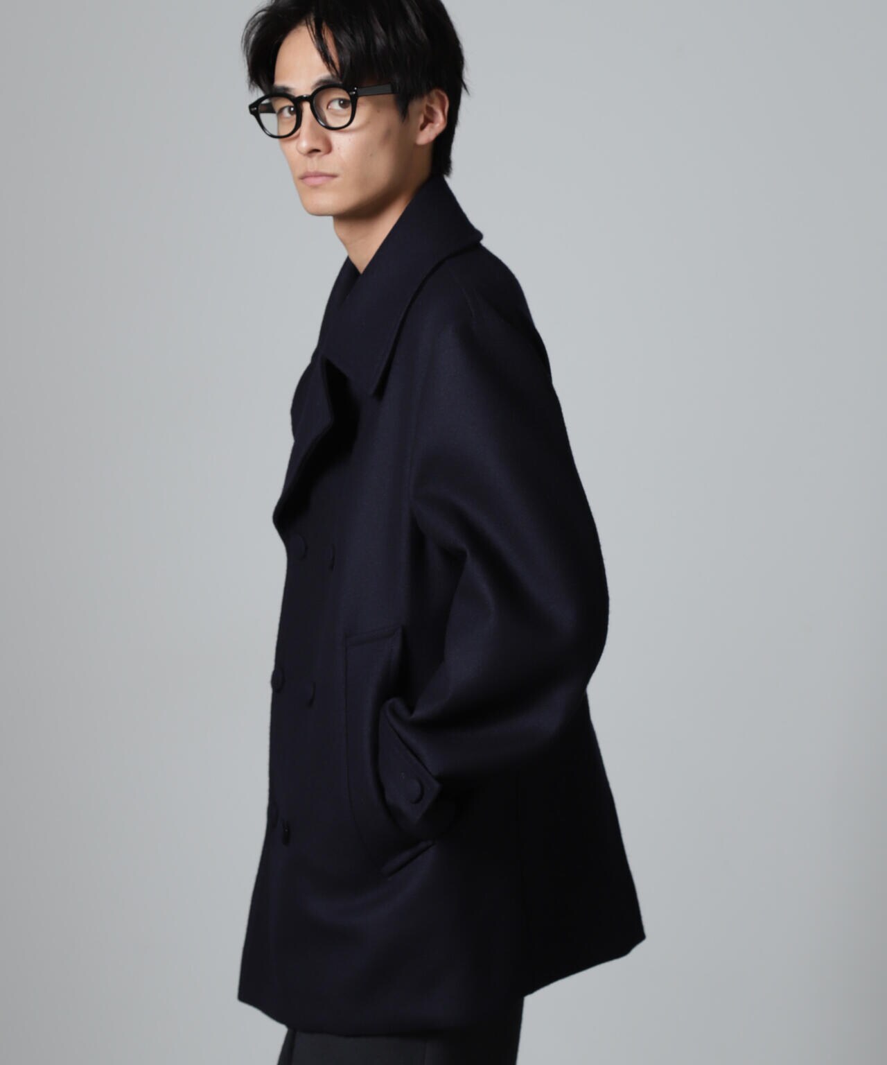 SUPER110'sウール原料使いの2重織りメルトンを使用したミドルレングスピーコート。
