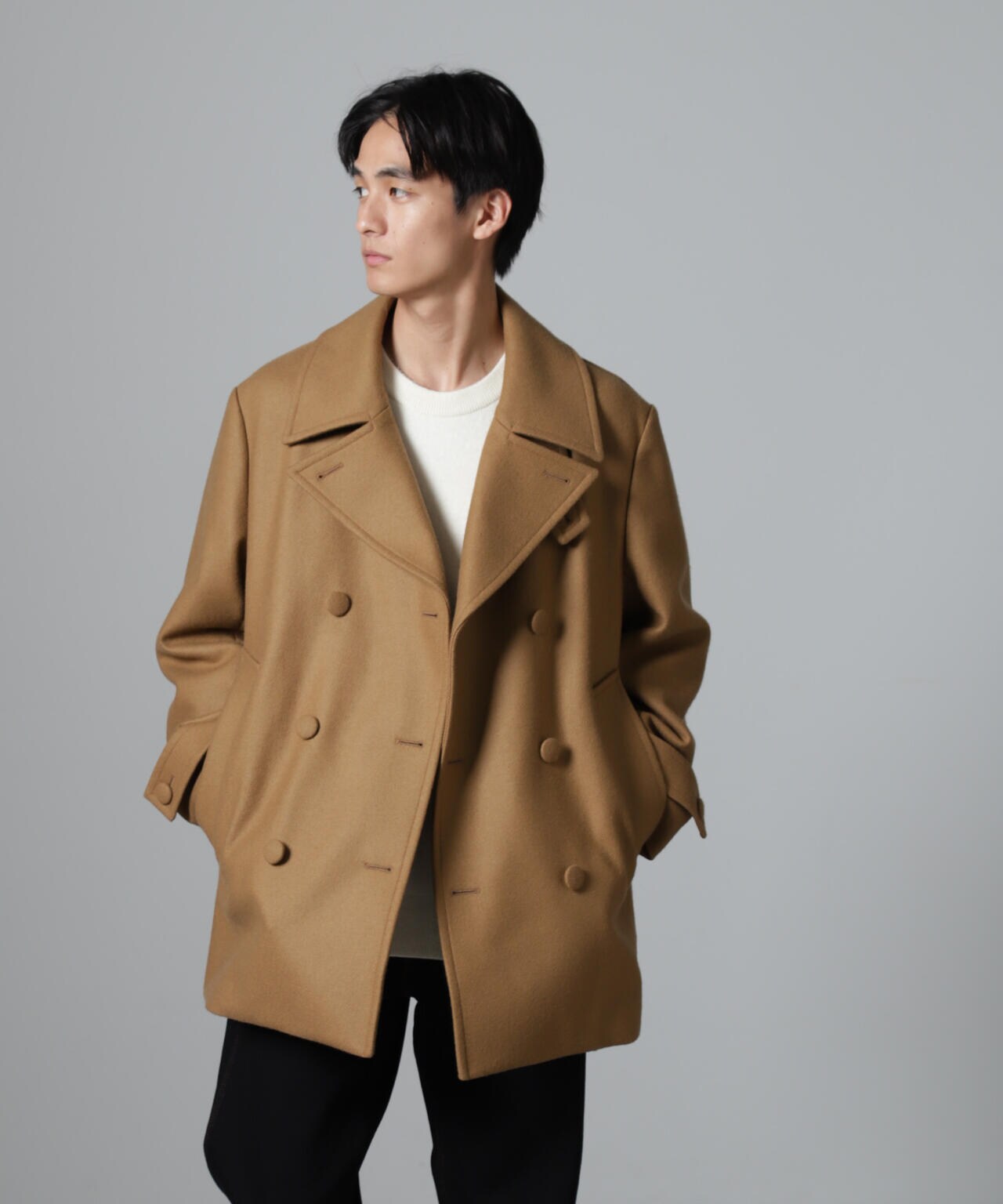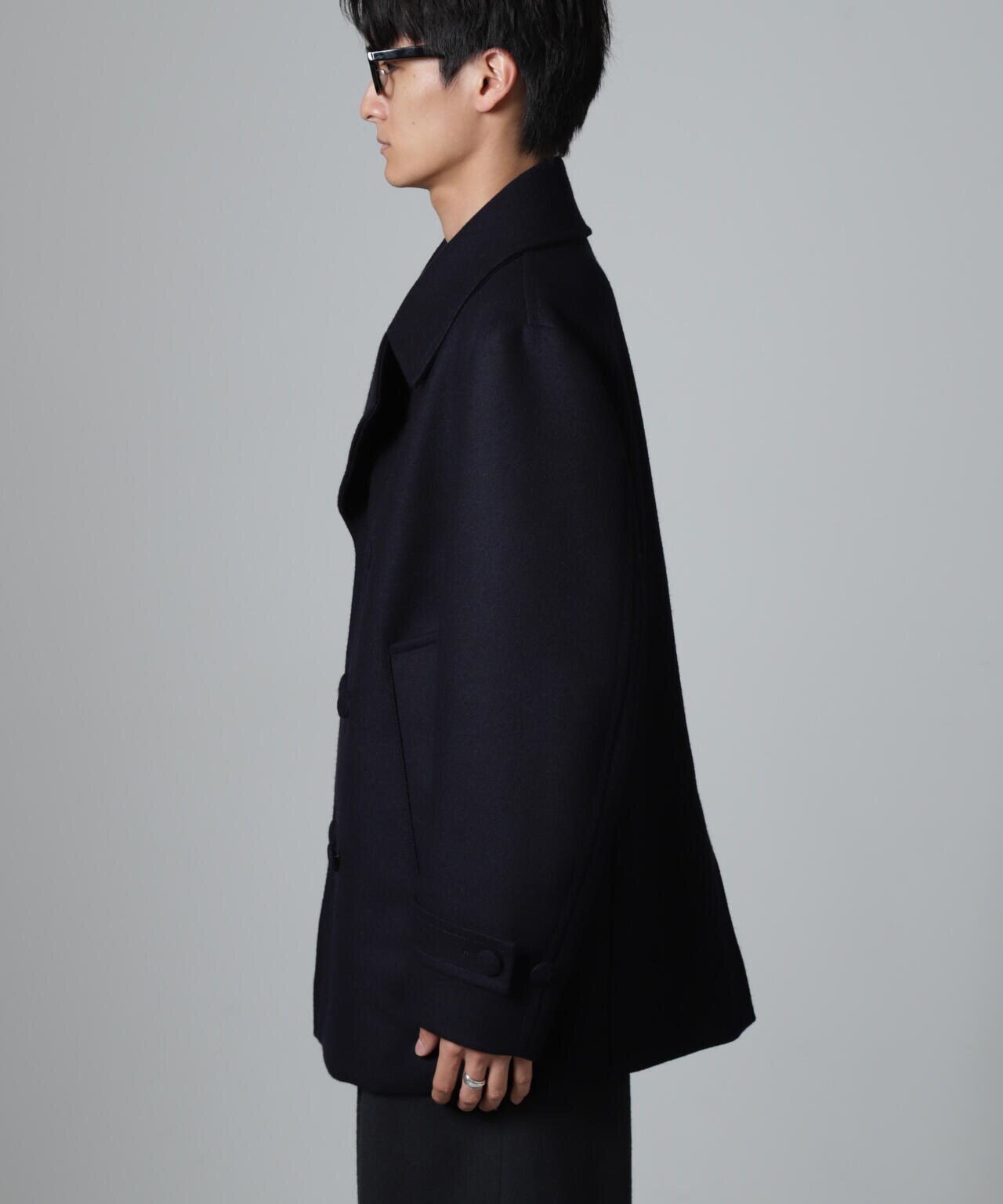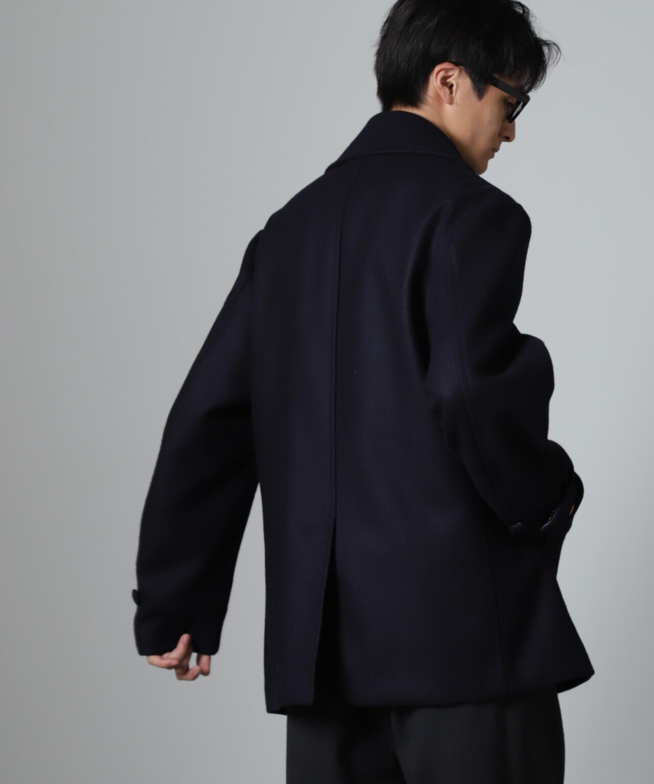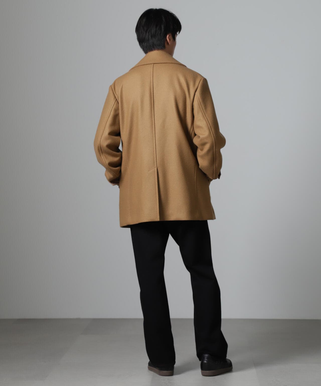 SUPER110'sウール原料使いの2重織りメルトンを使用したミドルレングスピーコート。