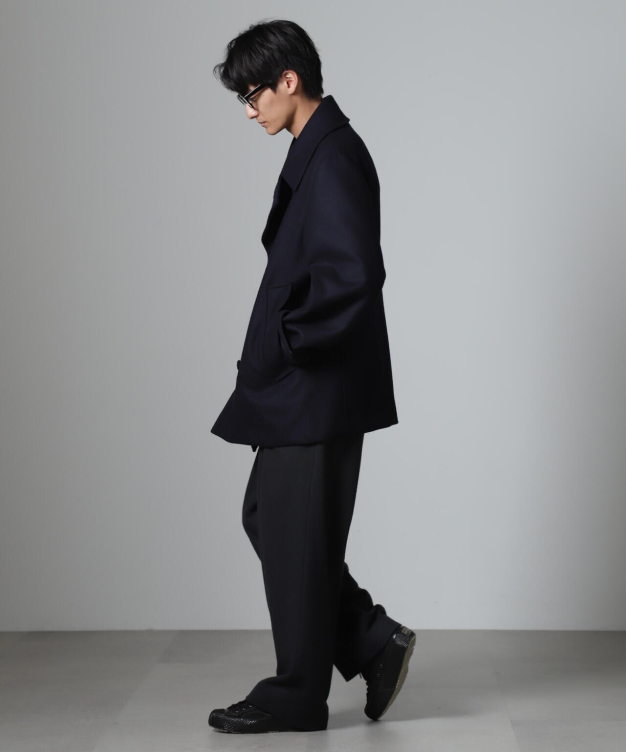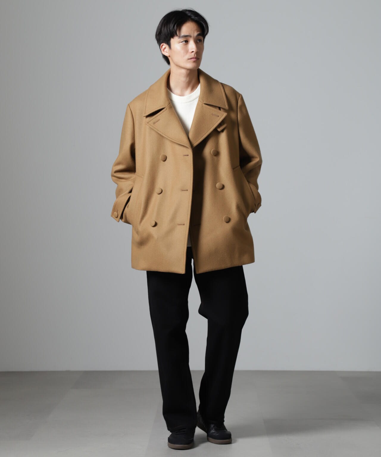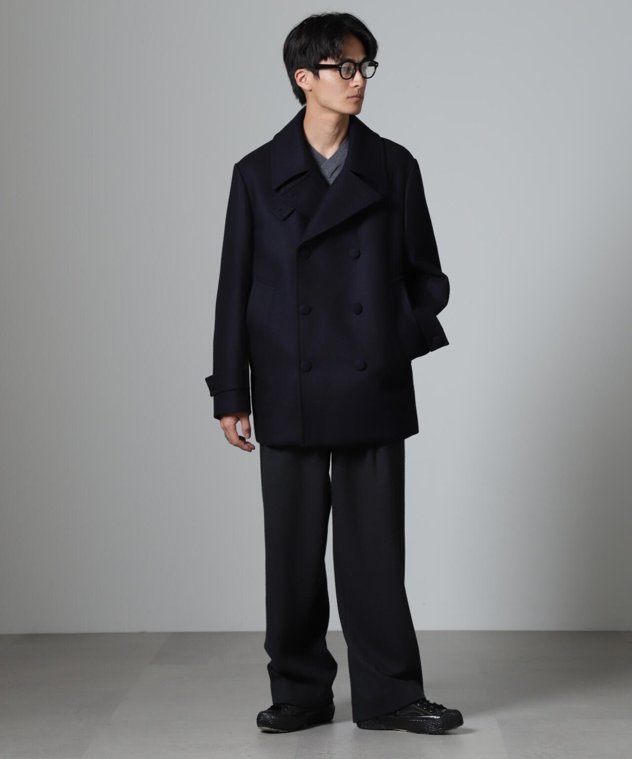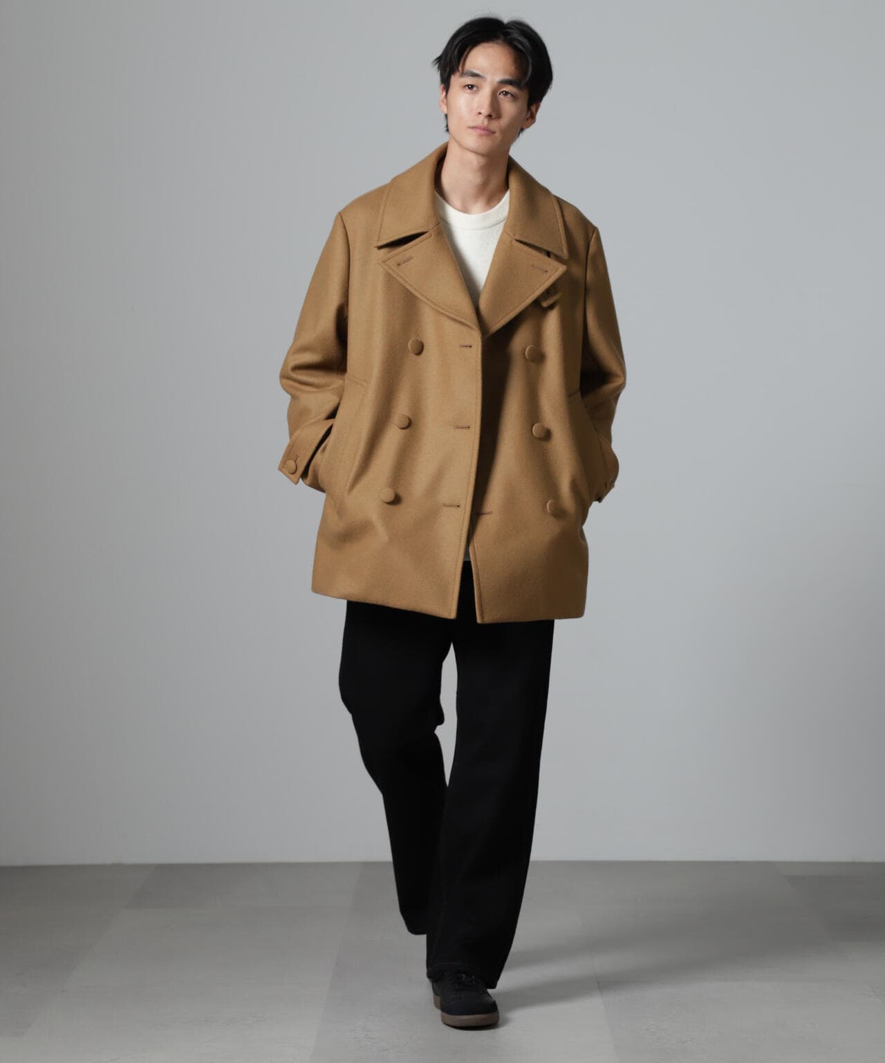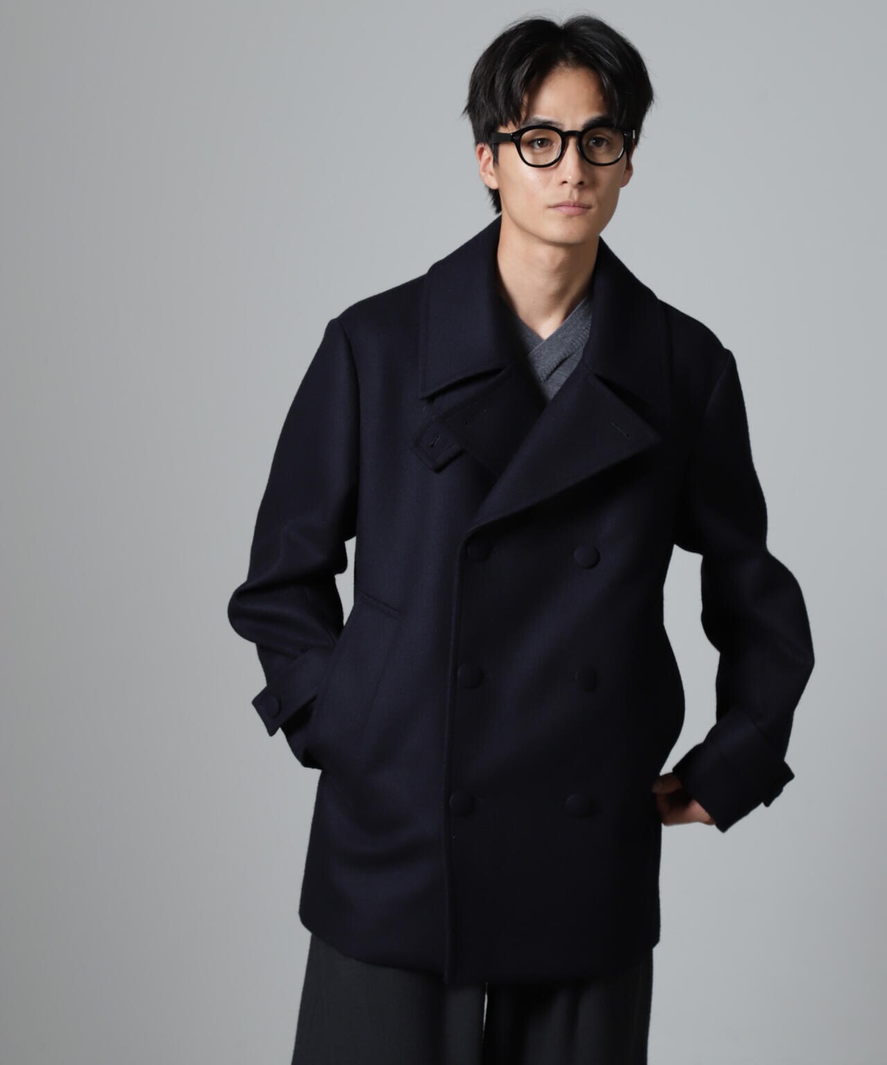 SUPER110'sウール原料使いの2重織りメルトンを使用したミドルレングスピーコート。