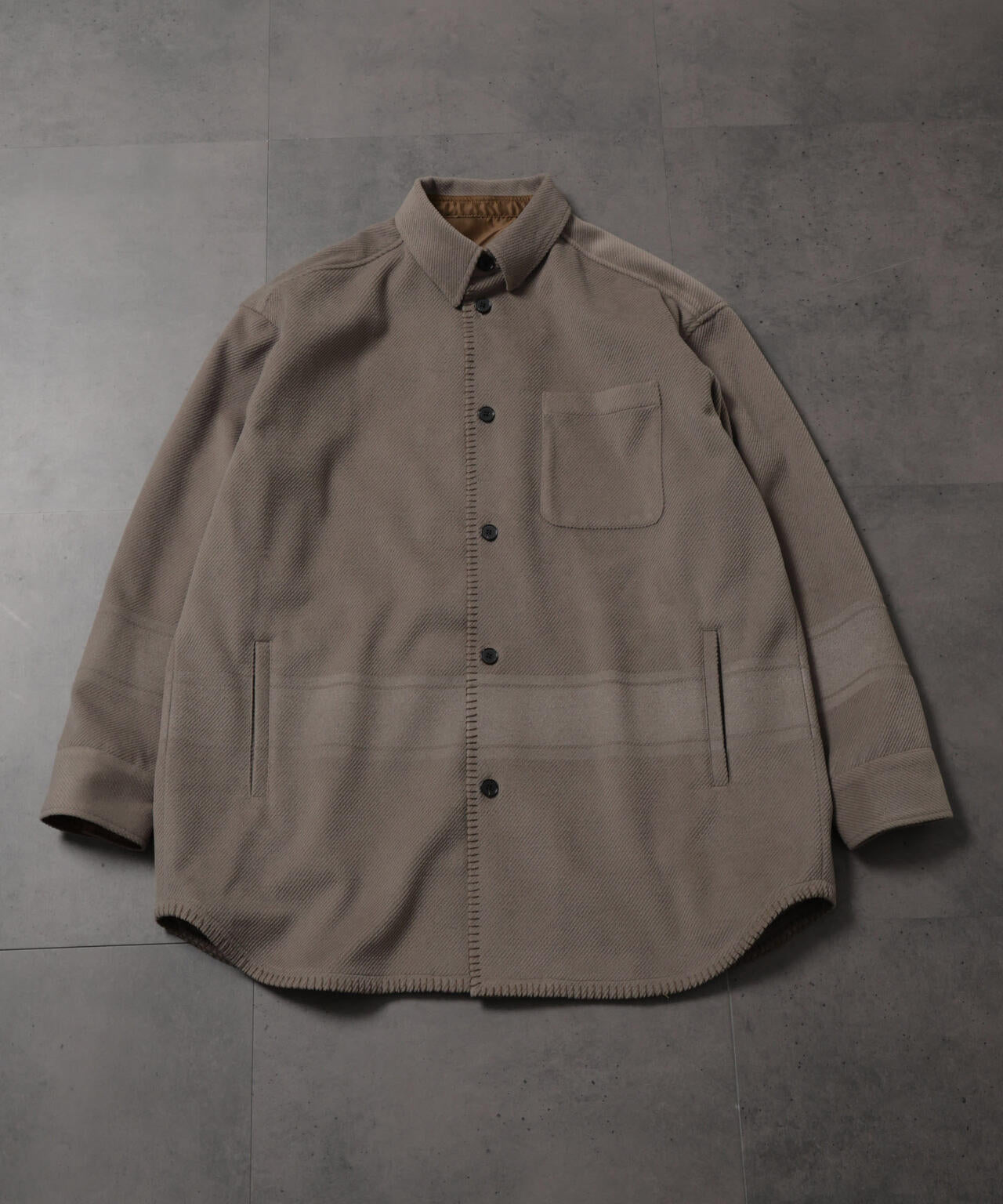コレクションテーマである「HOTEL PALACE in the forest」。ホテルでブランケットを羽織っているイメージから着想したブランケットステッチコート。ボーダープリントでミリタリーエッセンスを加えた、洗練されたデザインが魅力の1着です。
