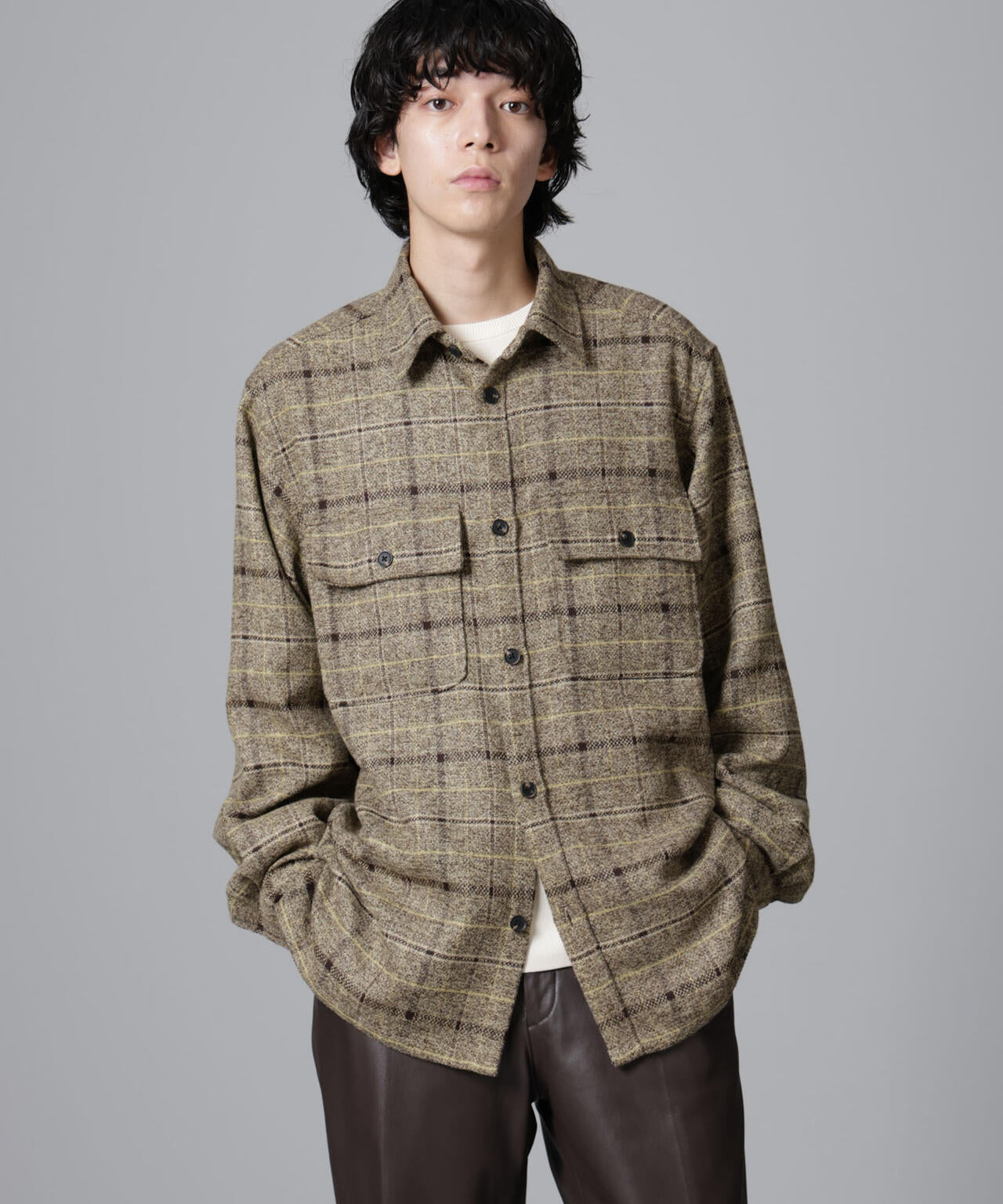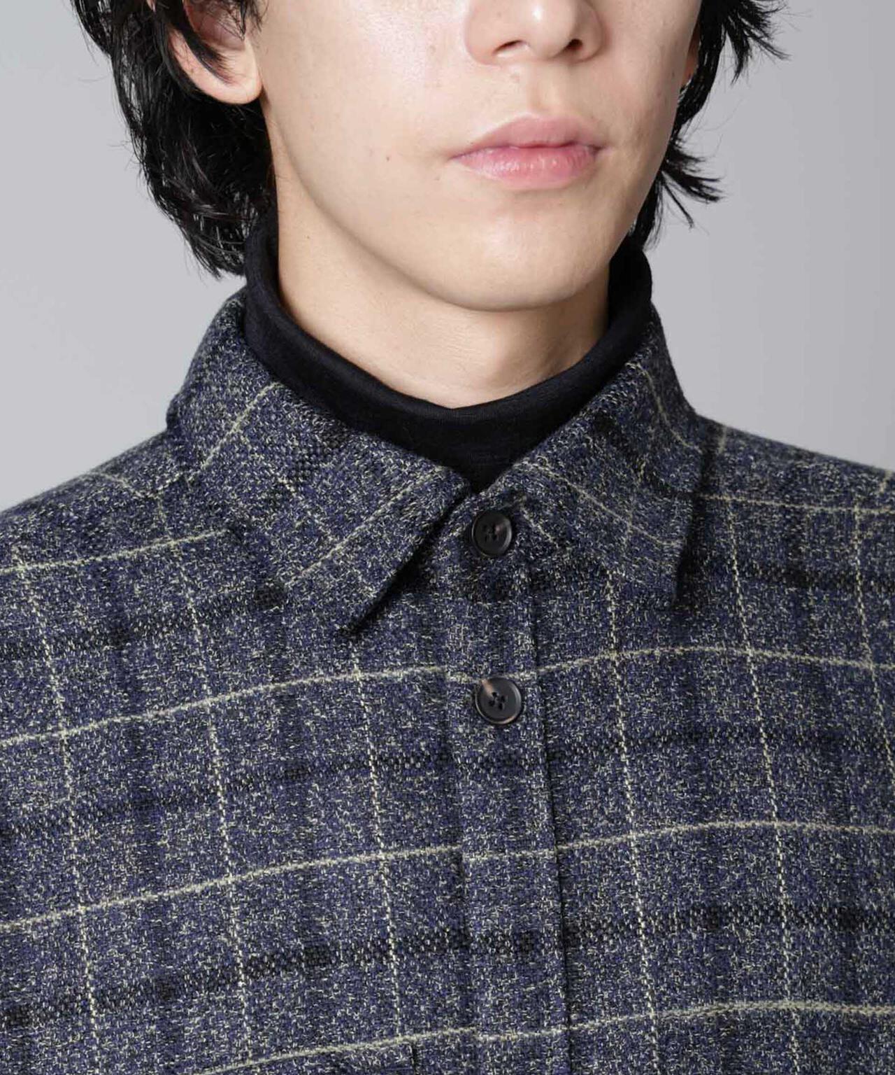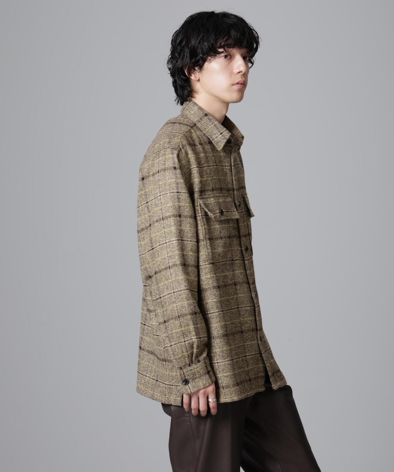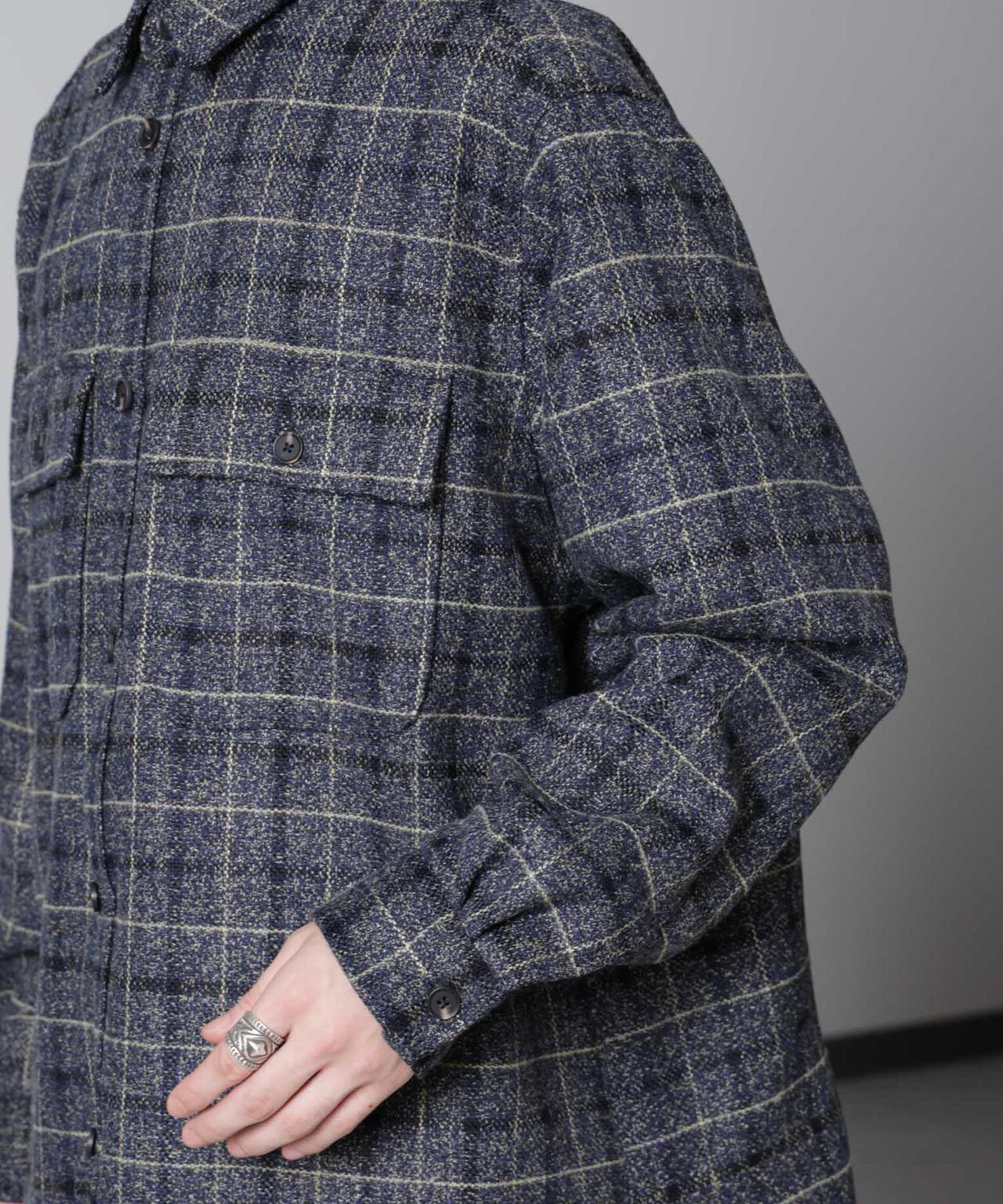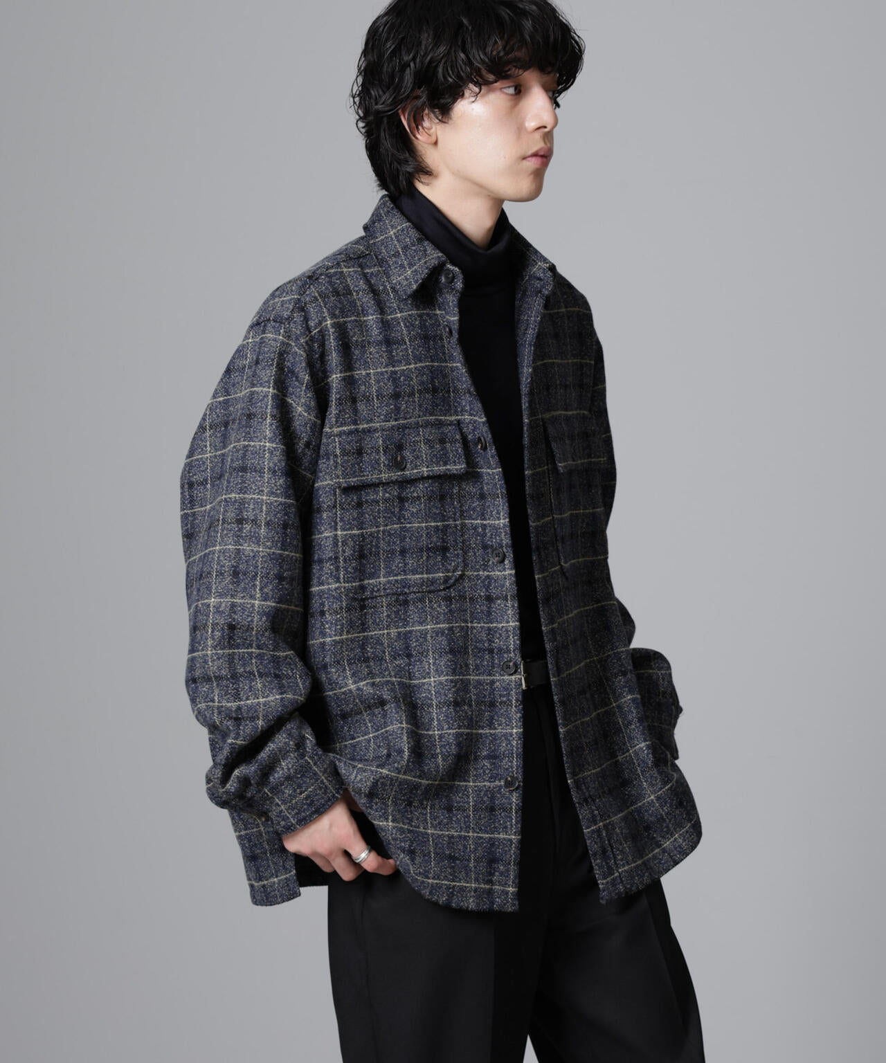 生地の見え方が特徴的な、中肉のツイード生地のシャツアウター。今季トレンドでもあるツイード素材の中でも冬過ぎないライトな生地感にして、ライトアウターや重衣料の中に着れるCPO型に落とし込んだオススメのアイテムです。