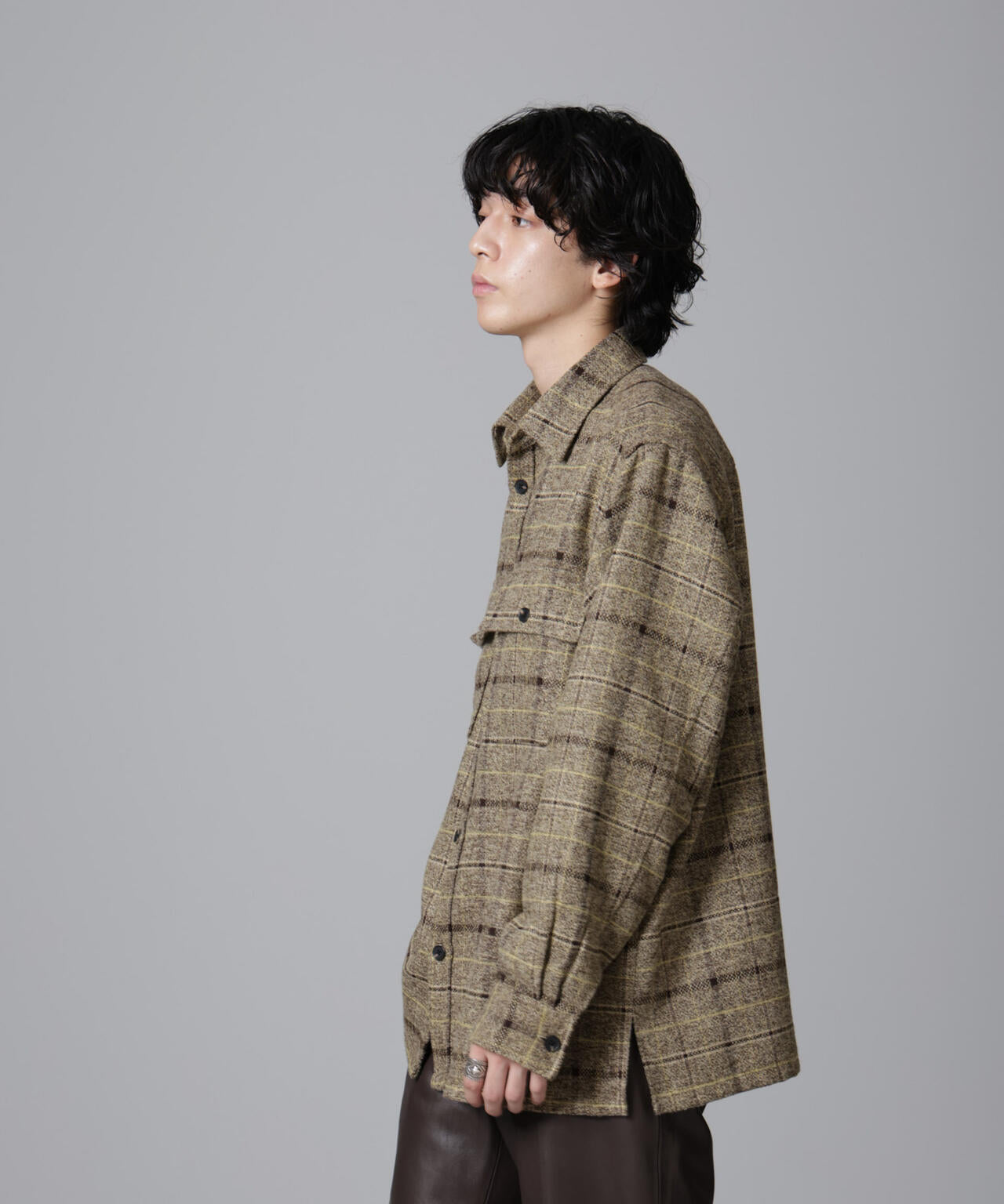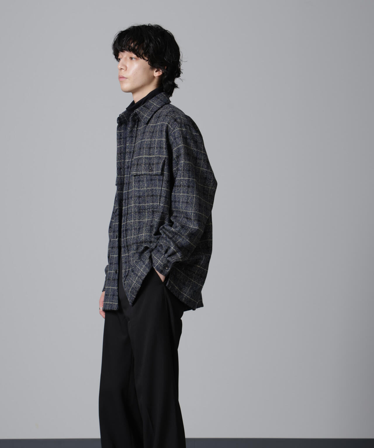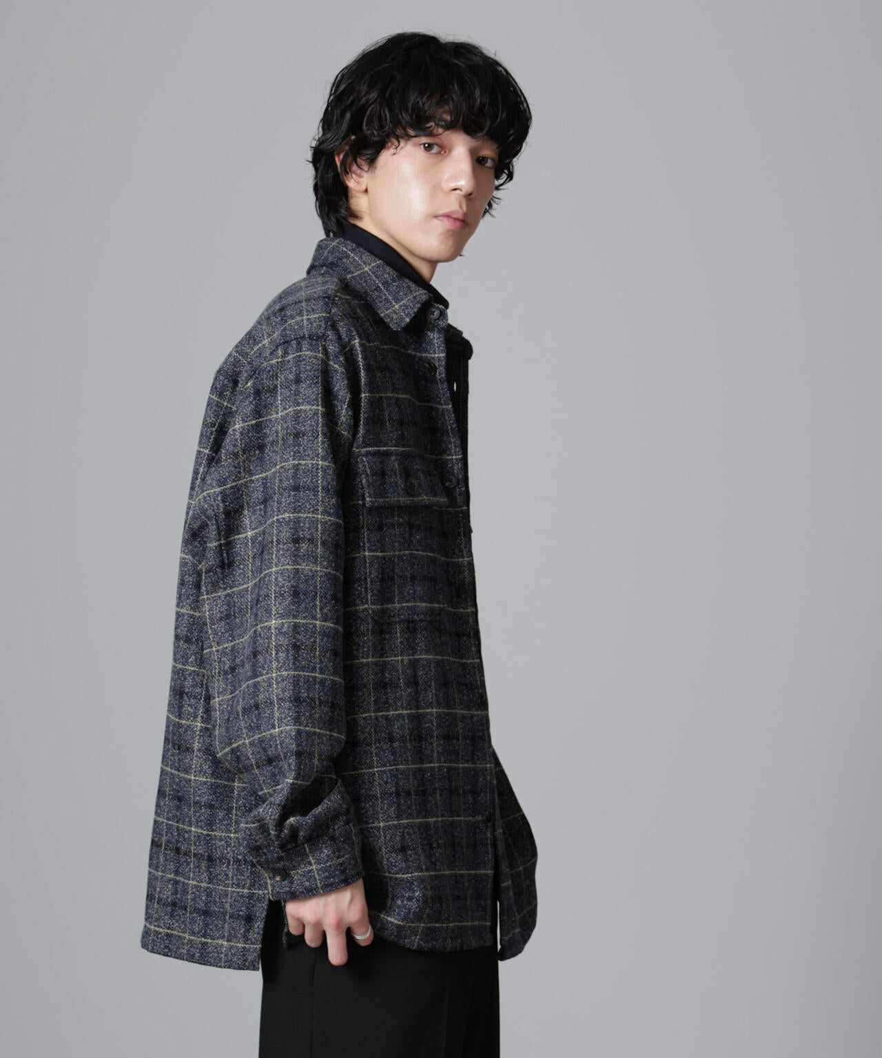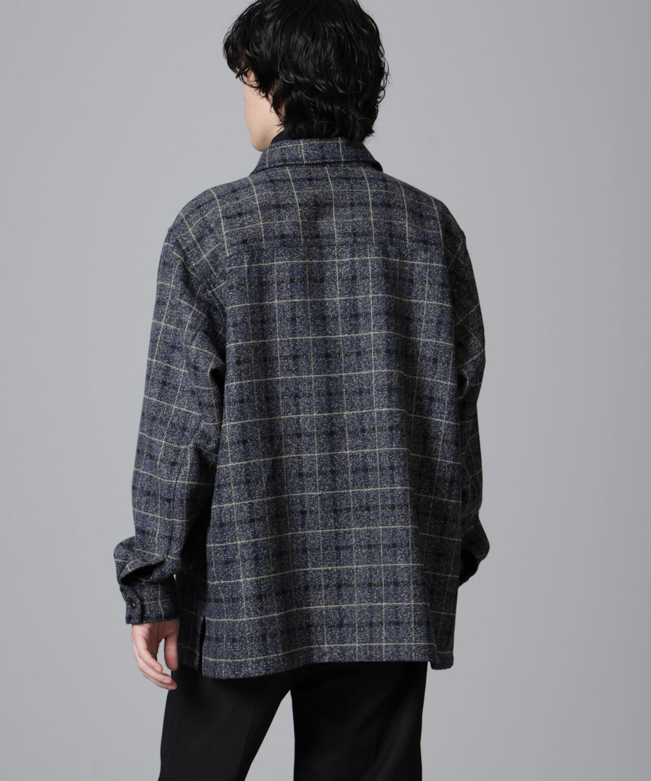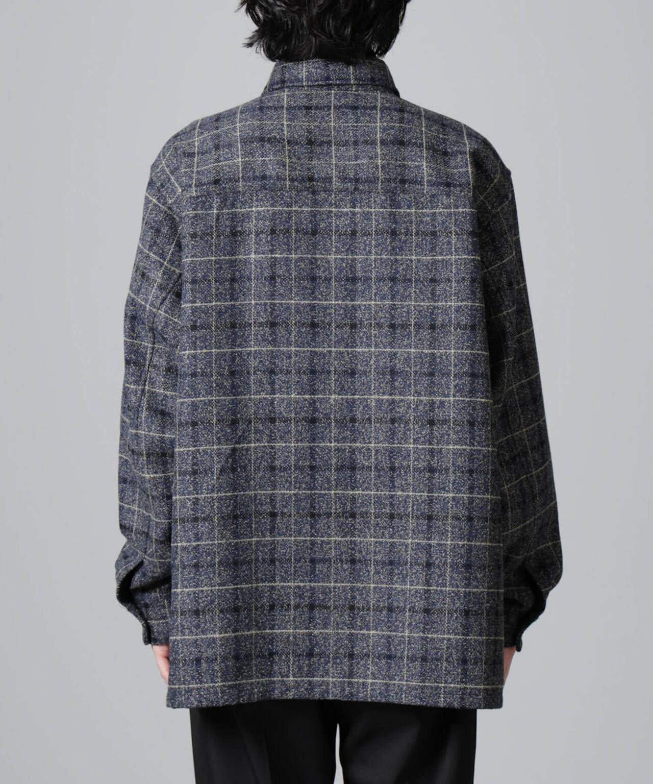 生地の見え方が特徴的な、中肉のツイード生地のシャツアウター。今季トレンドでもあるツイード素材の中でも冬過ぎないライトな生地感にして、ライトアウターや重衣料の中に着れるCPO型に落とし込んだオススメのアイテムです。