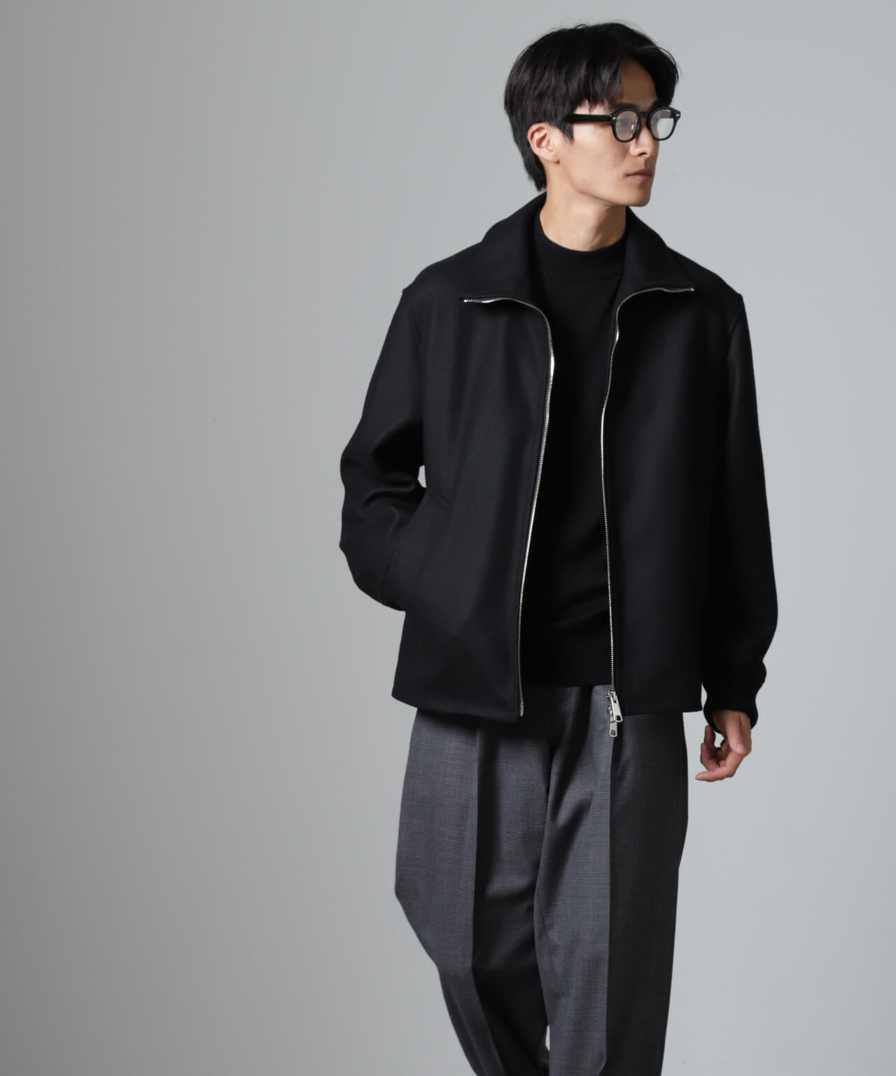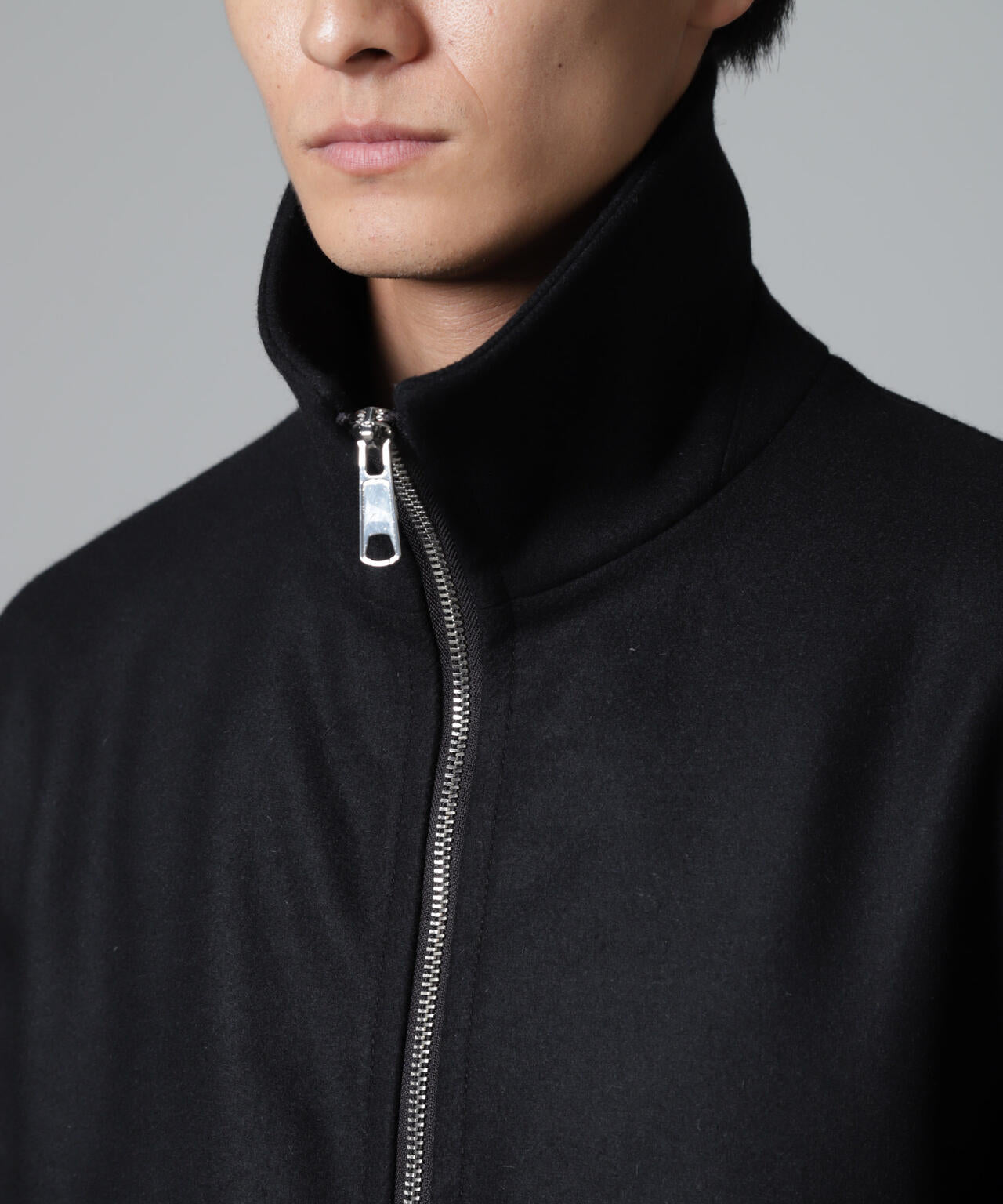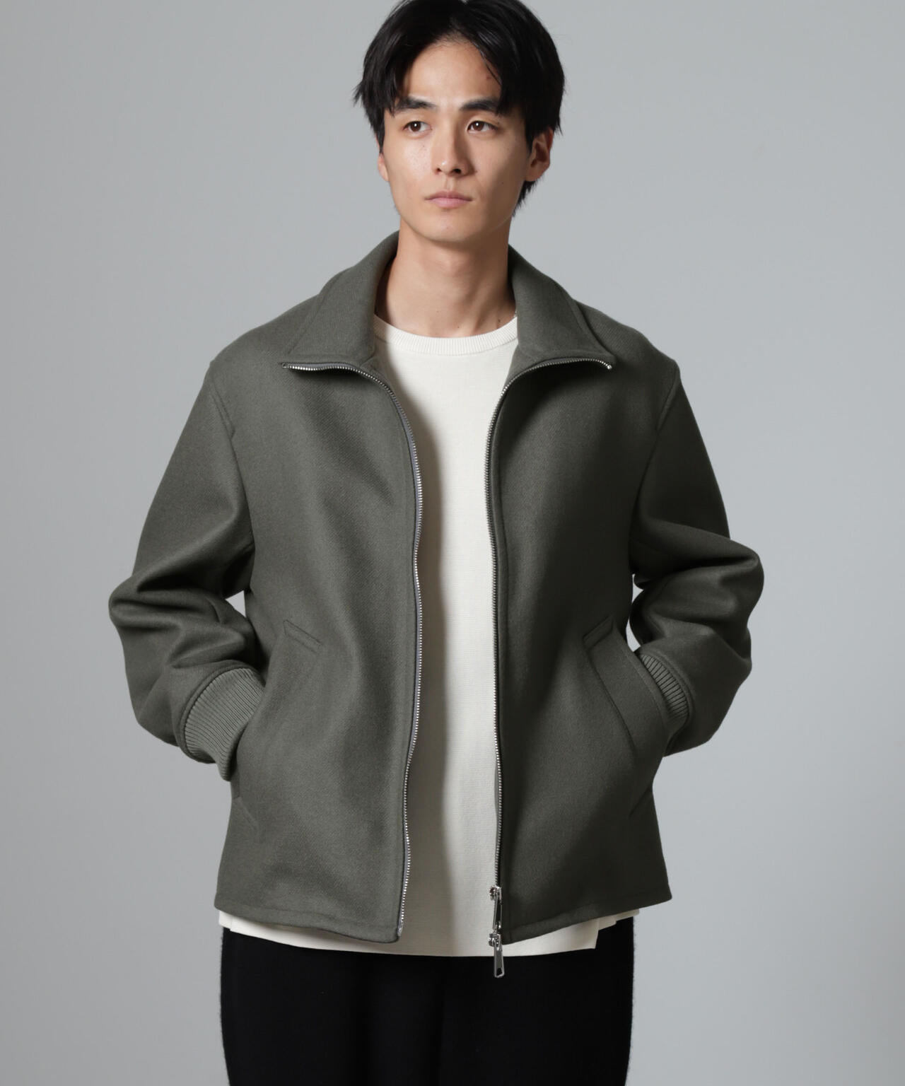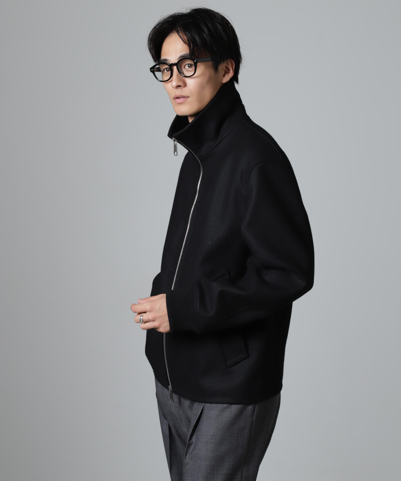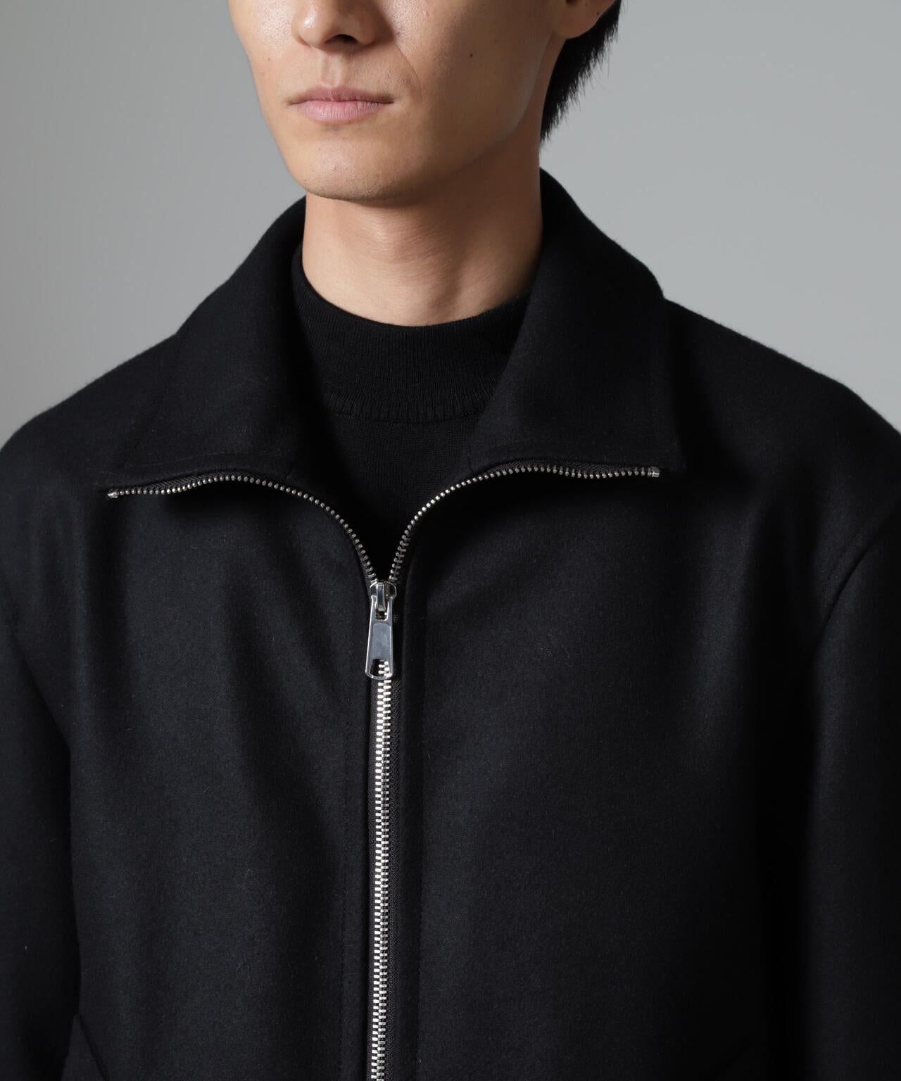 SUPER110'sウール原料使いの2重織りメルトンを使用したハイネックジップアップブルゾン。生地にはソトー社のハードプレス加工を施し、原料をギュッと圧縮しキレイな表面感に仕上げた1着。着心地はもちろん、袖を通したときに感じる特別感を与えてくれる、オススメのアイテムです。