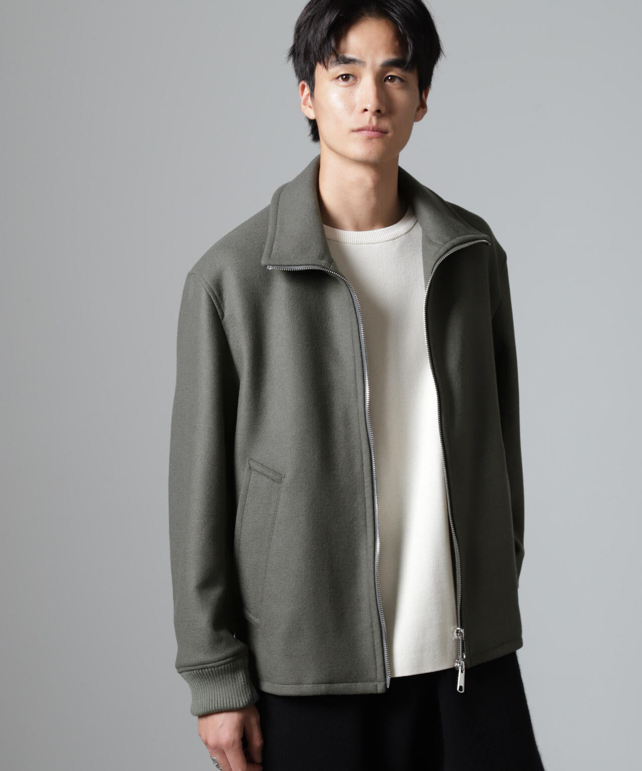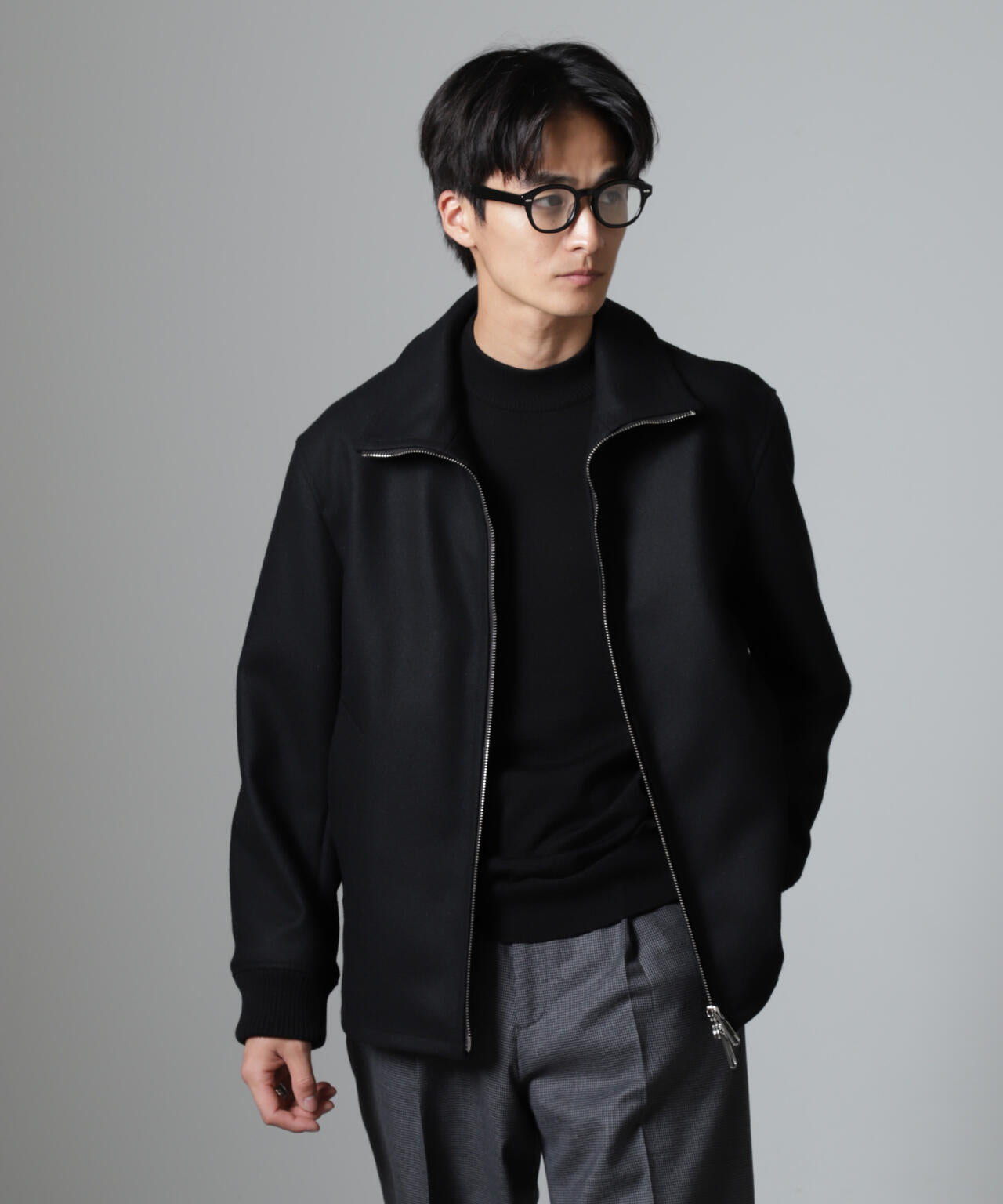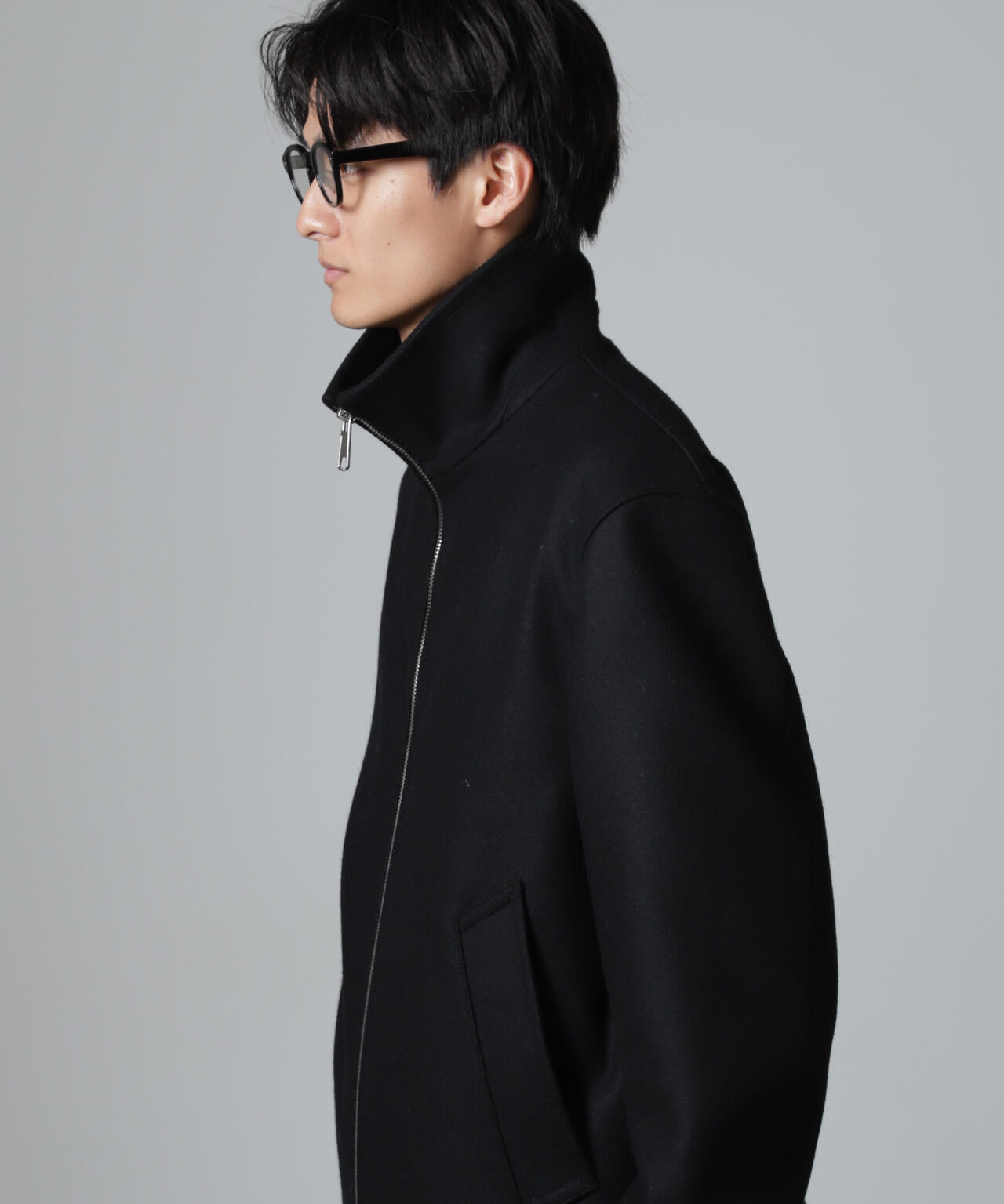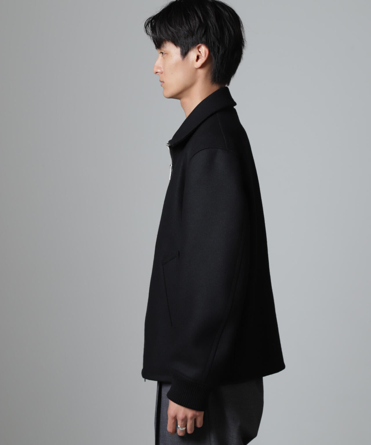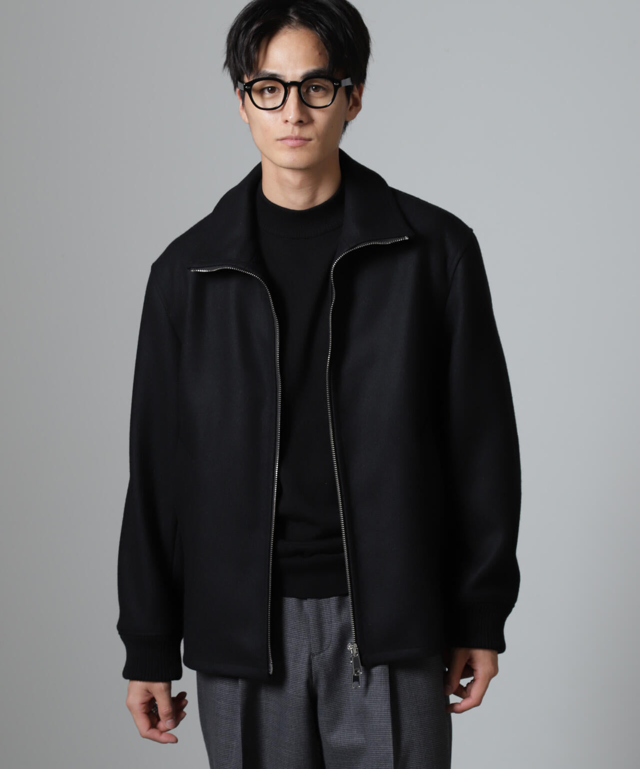 SUPER110'sウール原料使いの2重織りメルトンを使用したハイネックジップアップブルゾン。生地にはソトー社のハードプレス加工を施し、原料をギュッと圧縮しキレイな表面感に仕上げた1着。着心地はもちろん、袖を通したときに感じる特別感を与えてくれる、オススメのアイテムです。