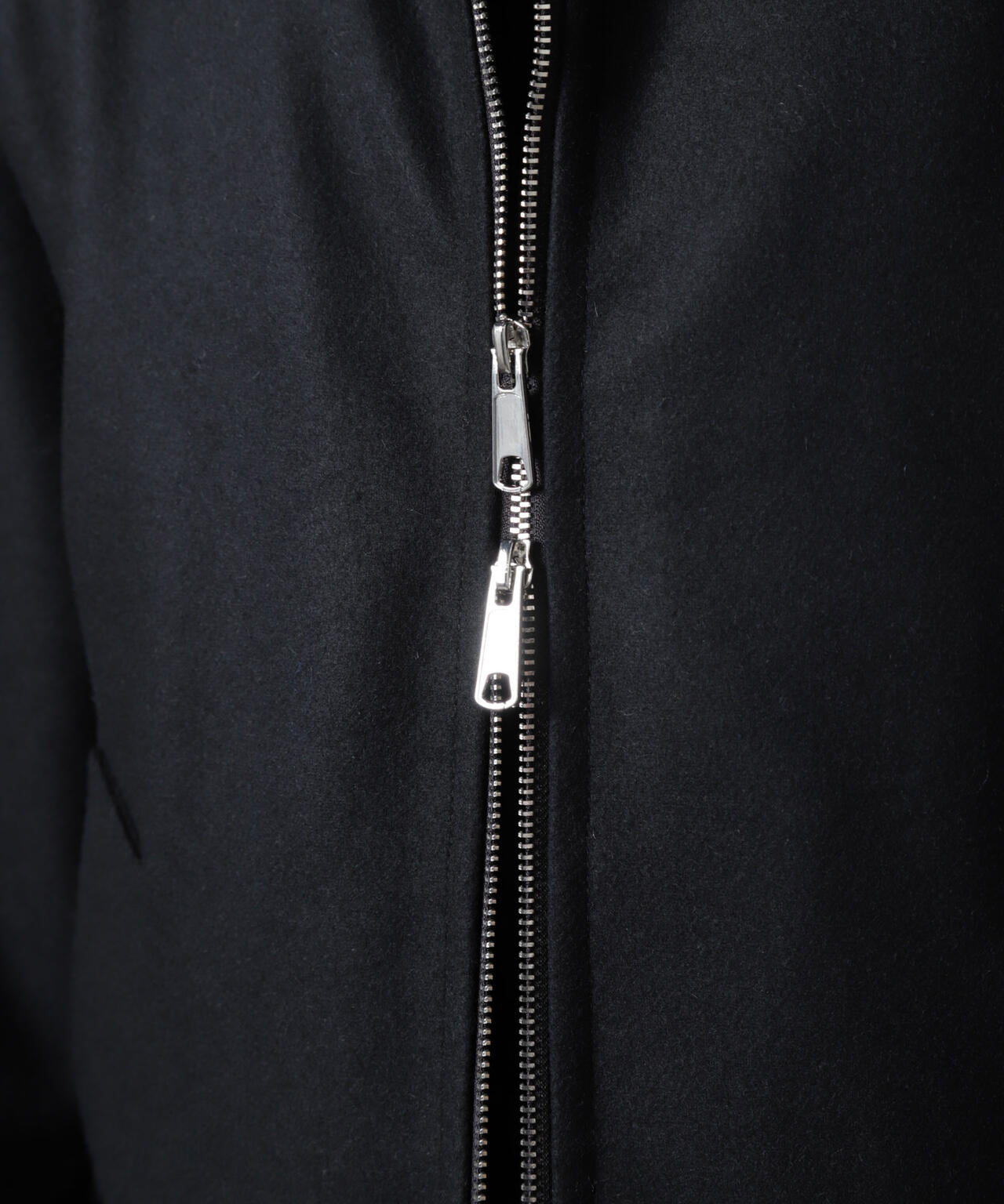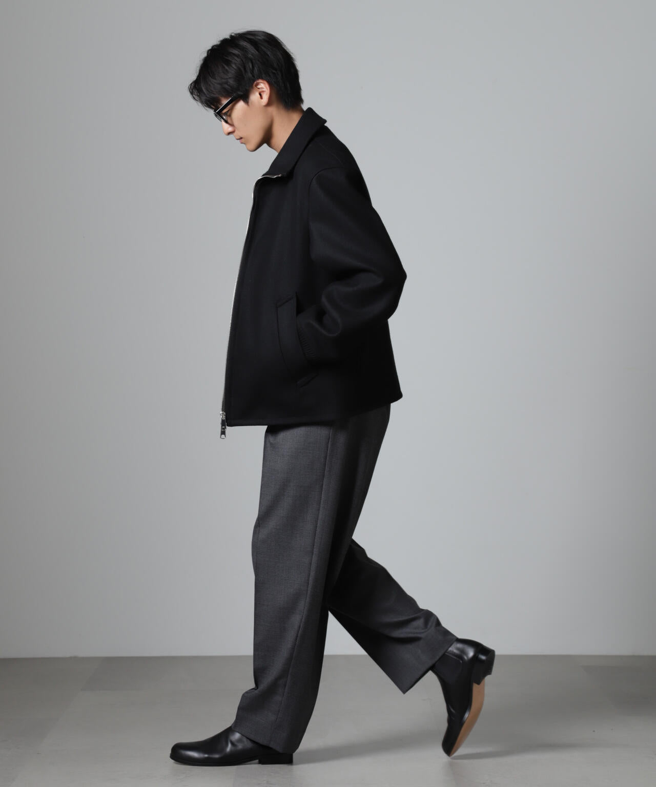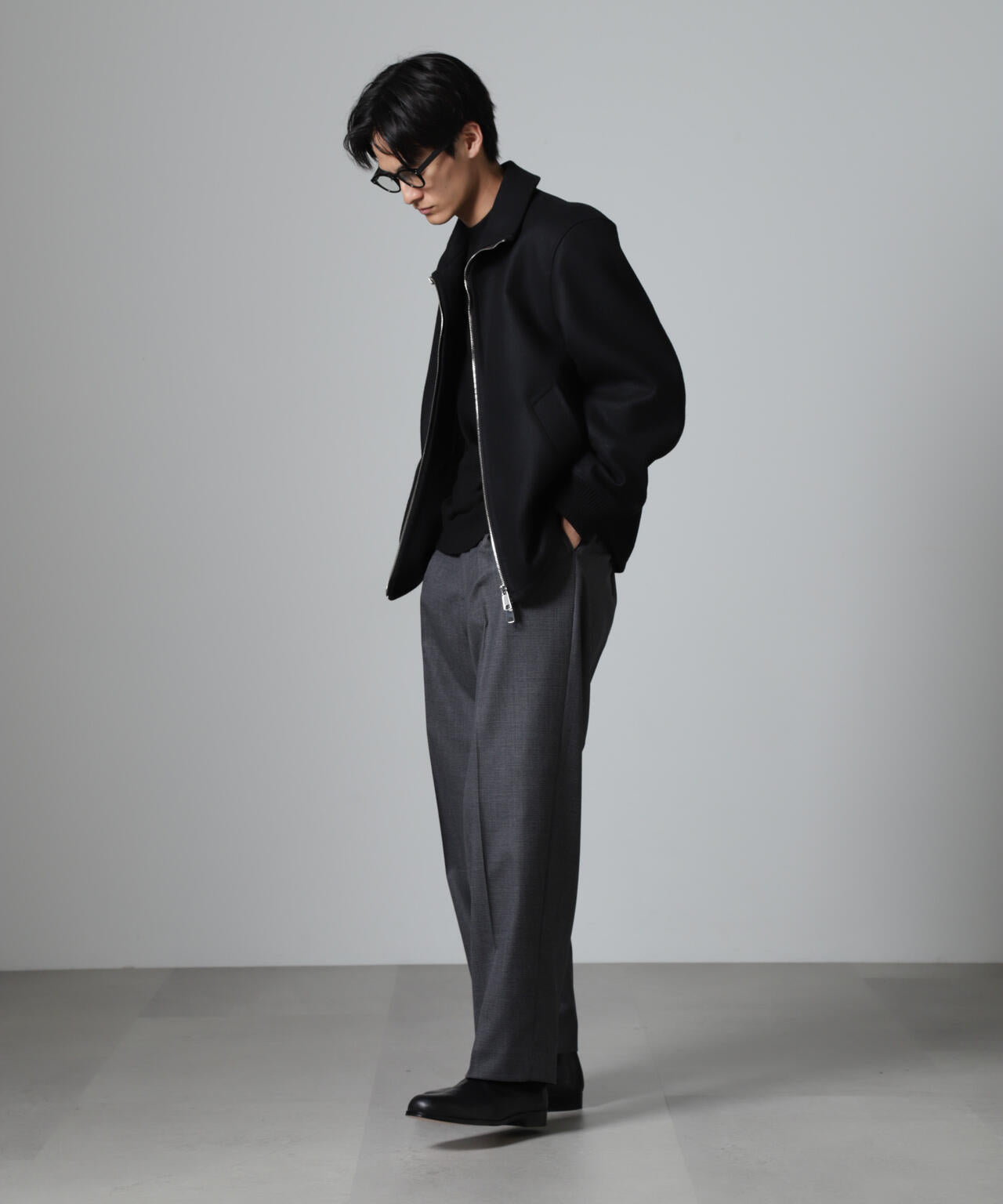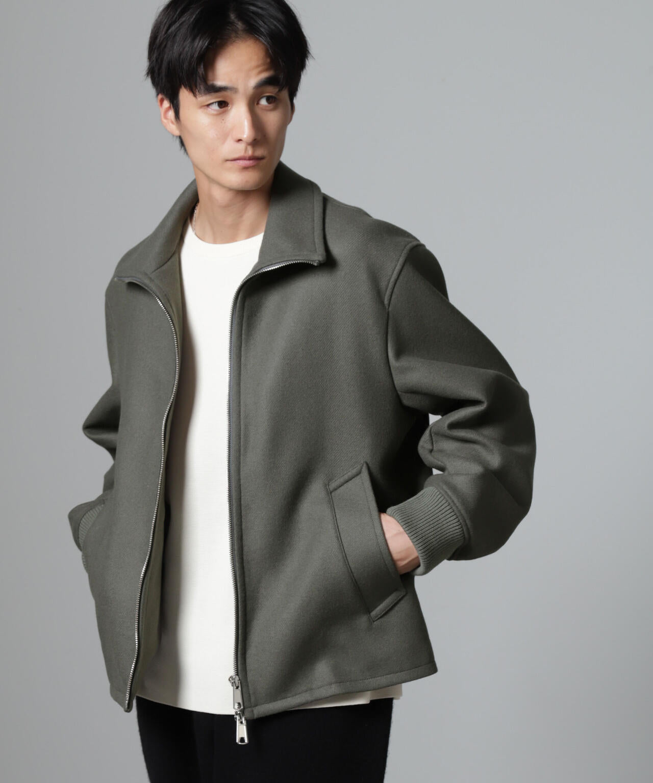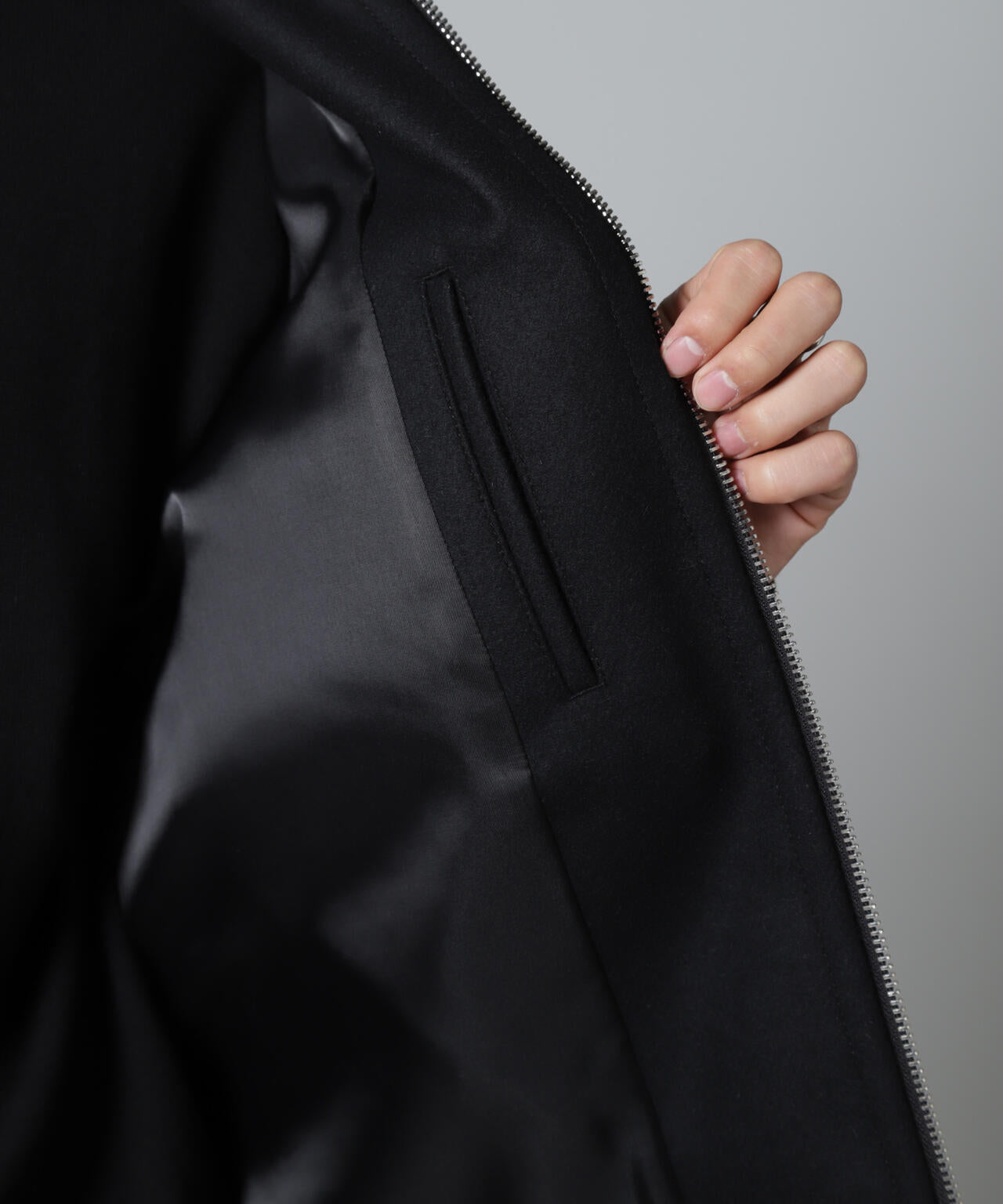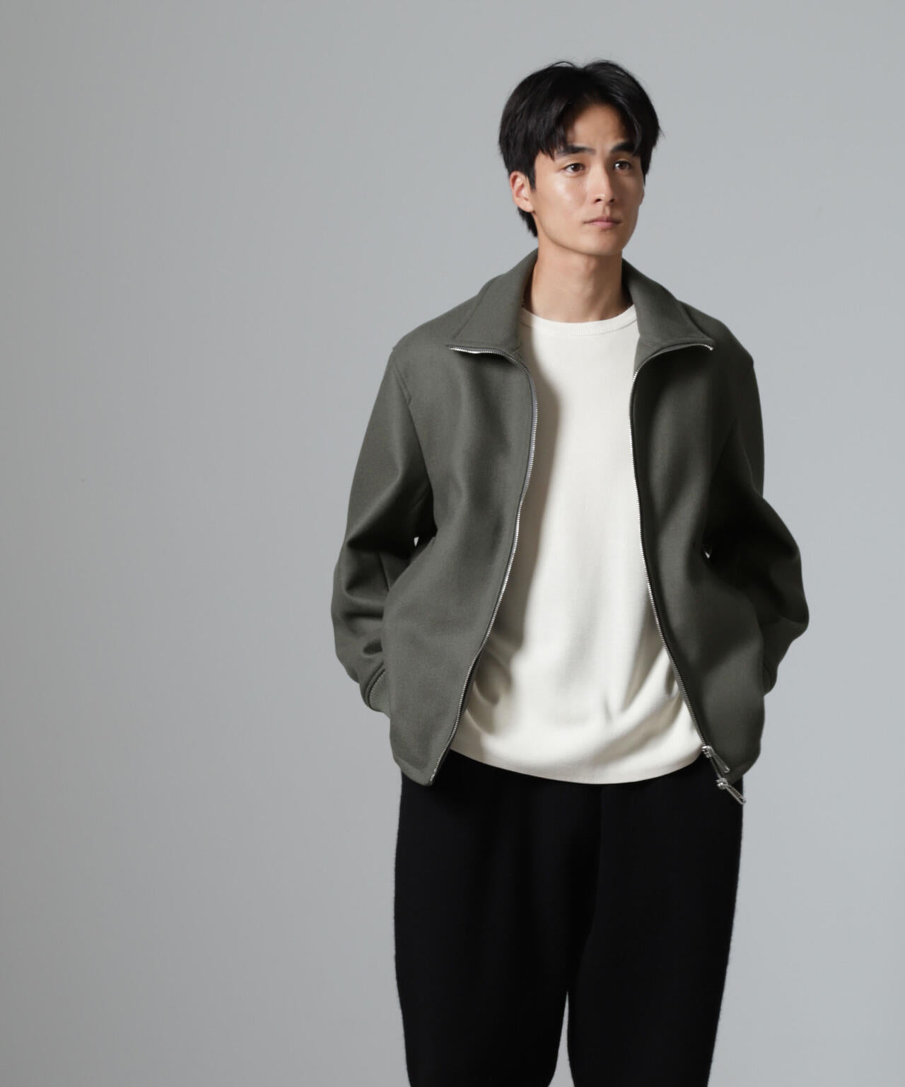 SUPER110'sウール原料使いの2重織りメルトンを使用したハイネックジップアップブルゾン。生地にはソトー社のハードプレス加工を施し、原料をギュッと圧縮しキレイな表面感に仕上げた1着。着心地はもちろん、袖を通したときに感じる特別感を与えてくれる、オススメのアイテムです。