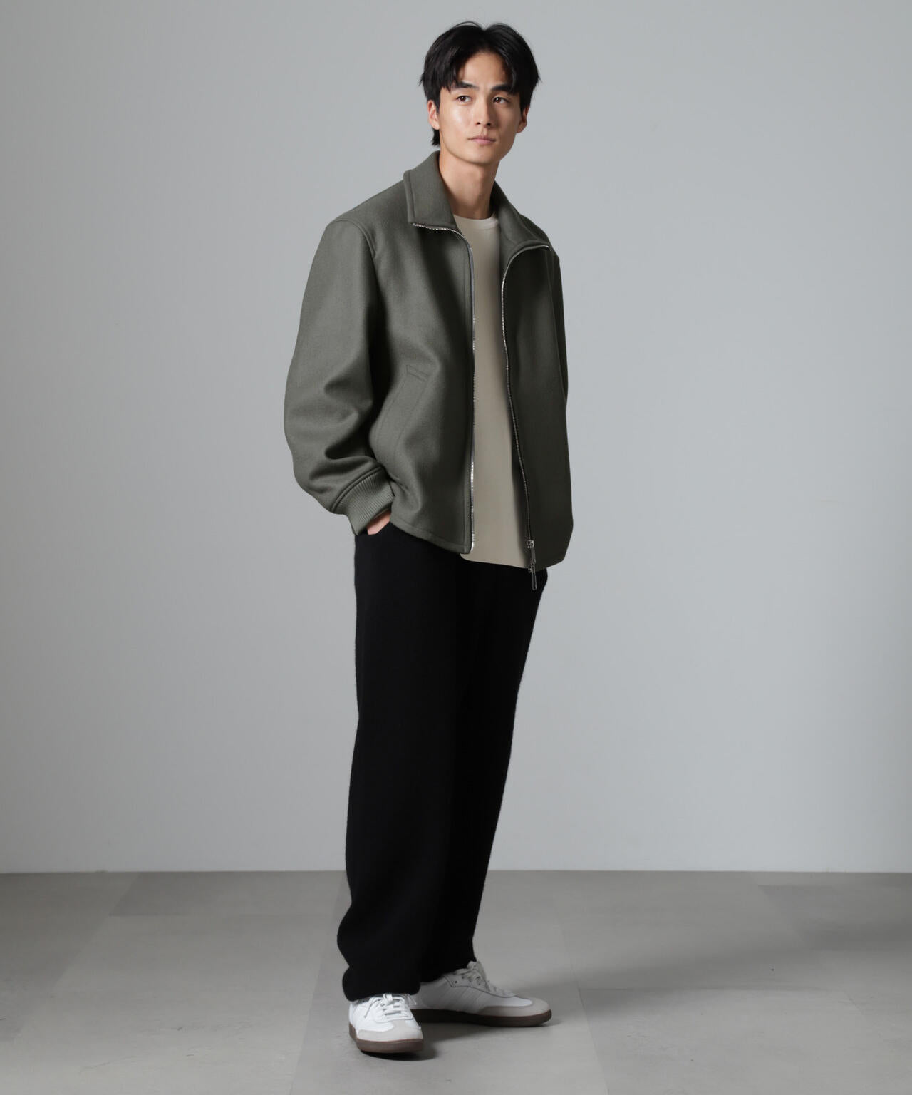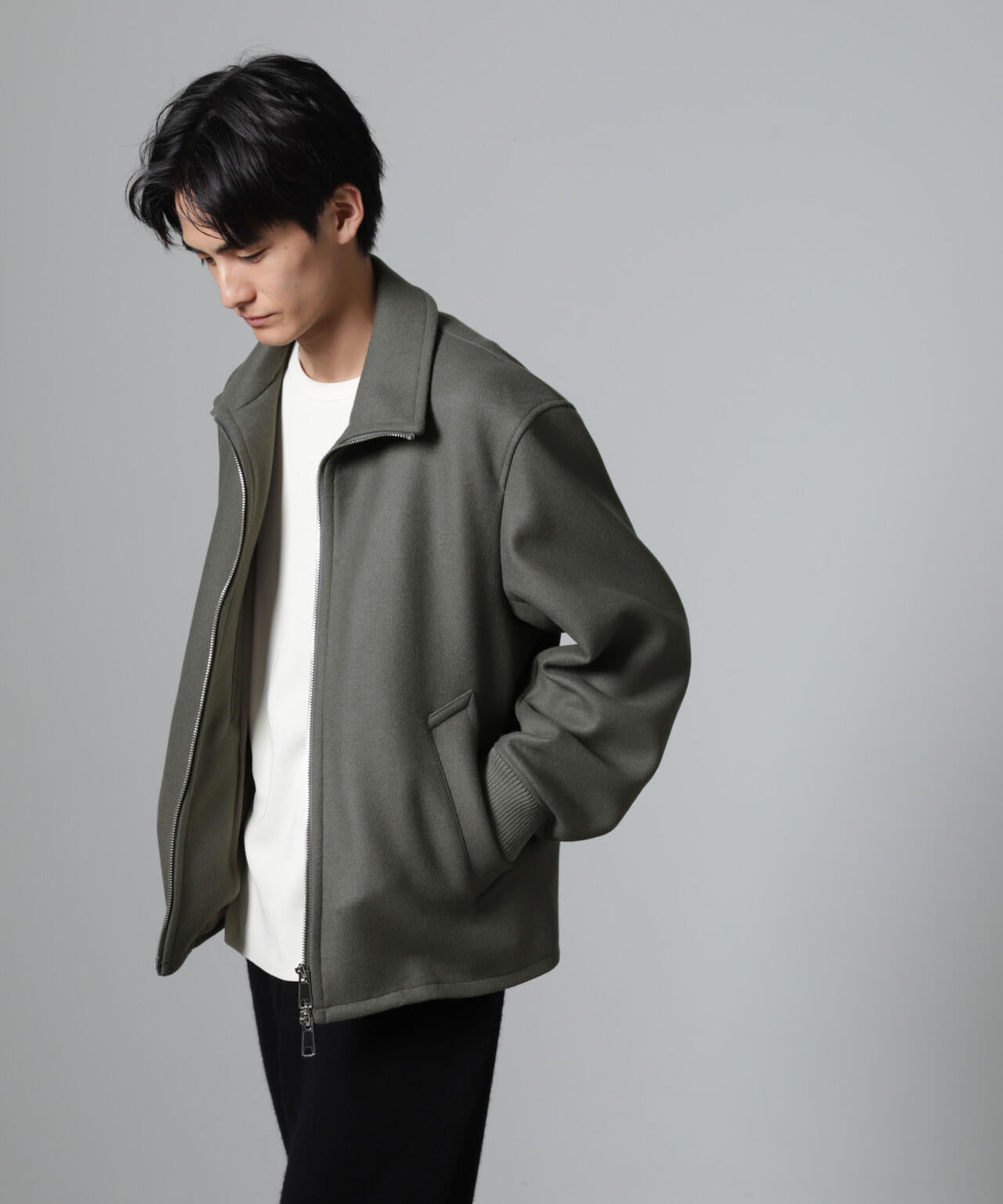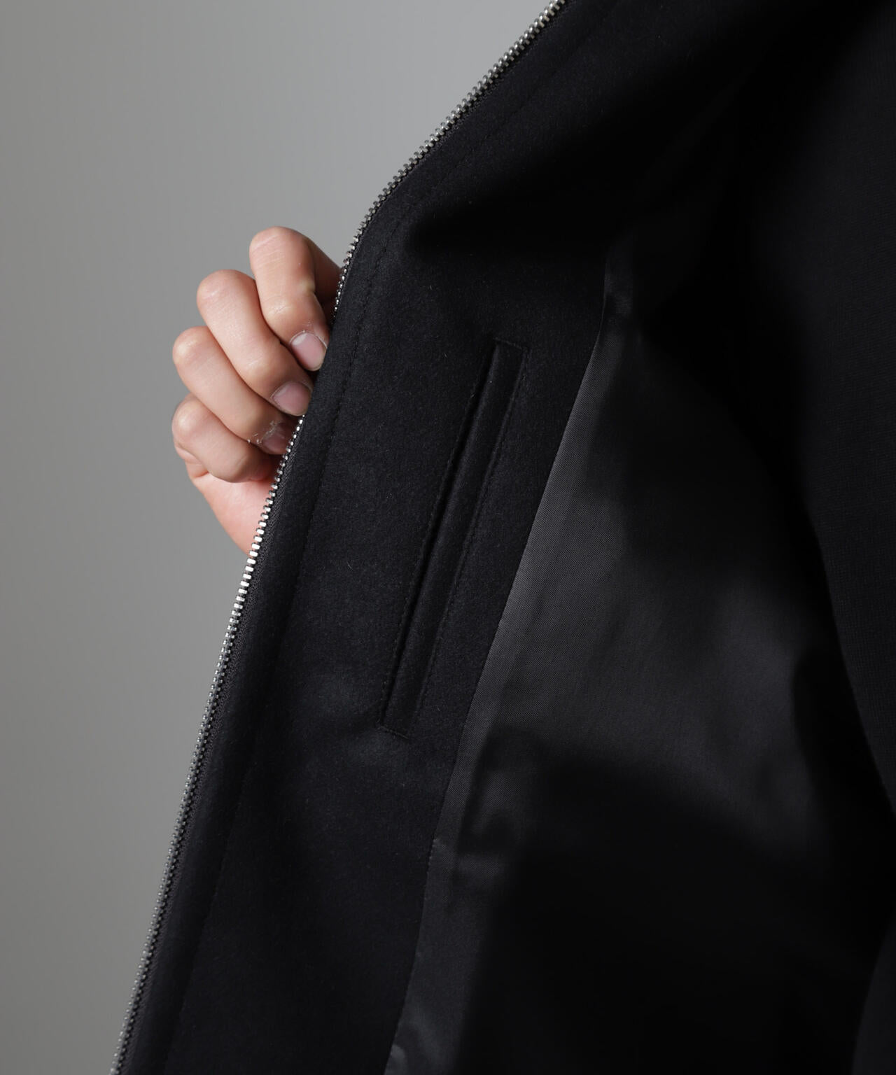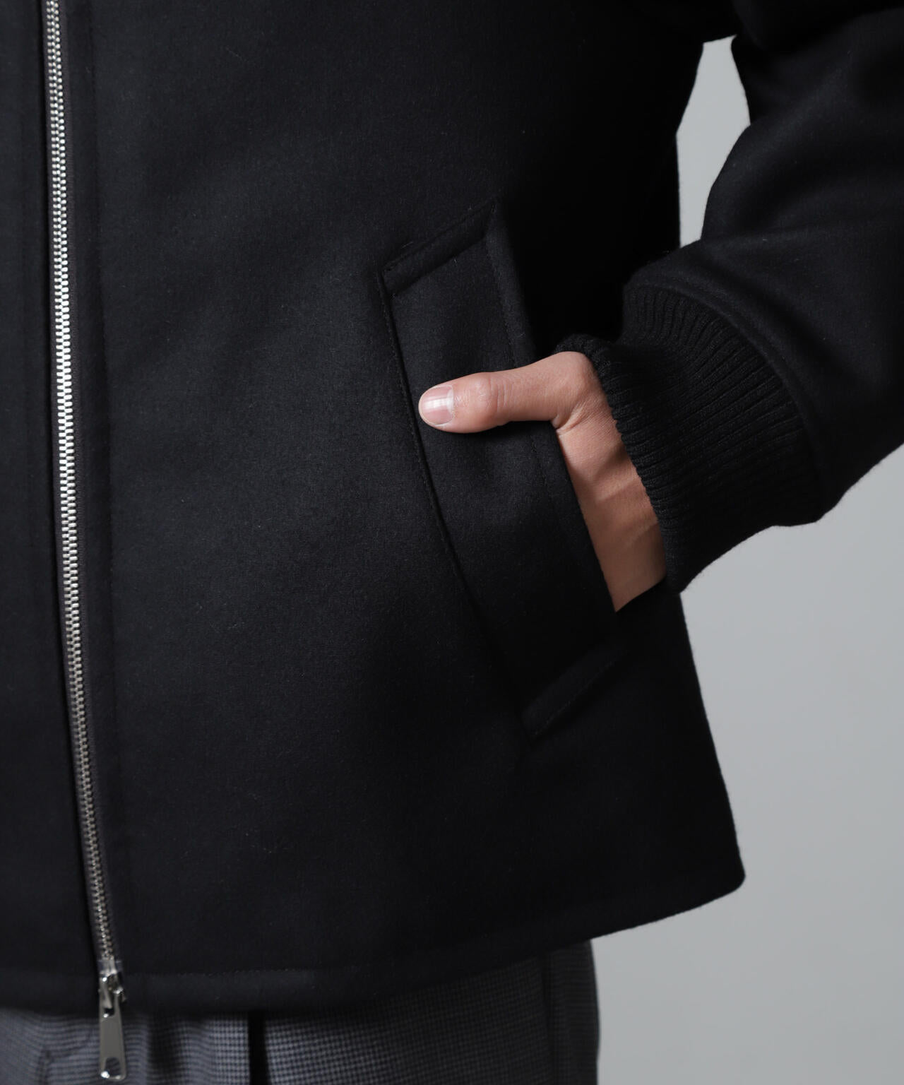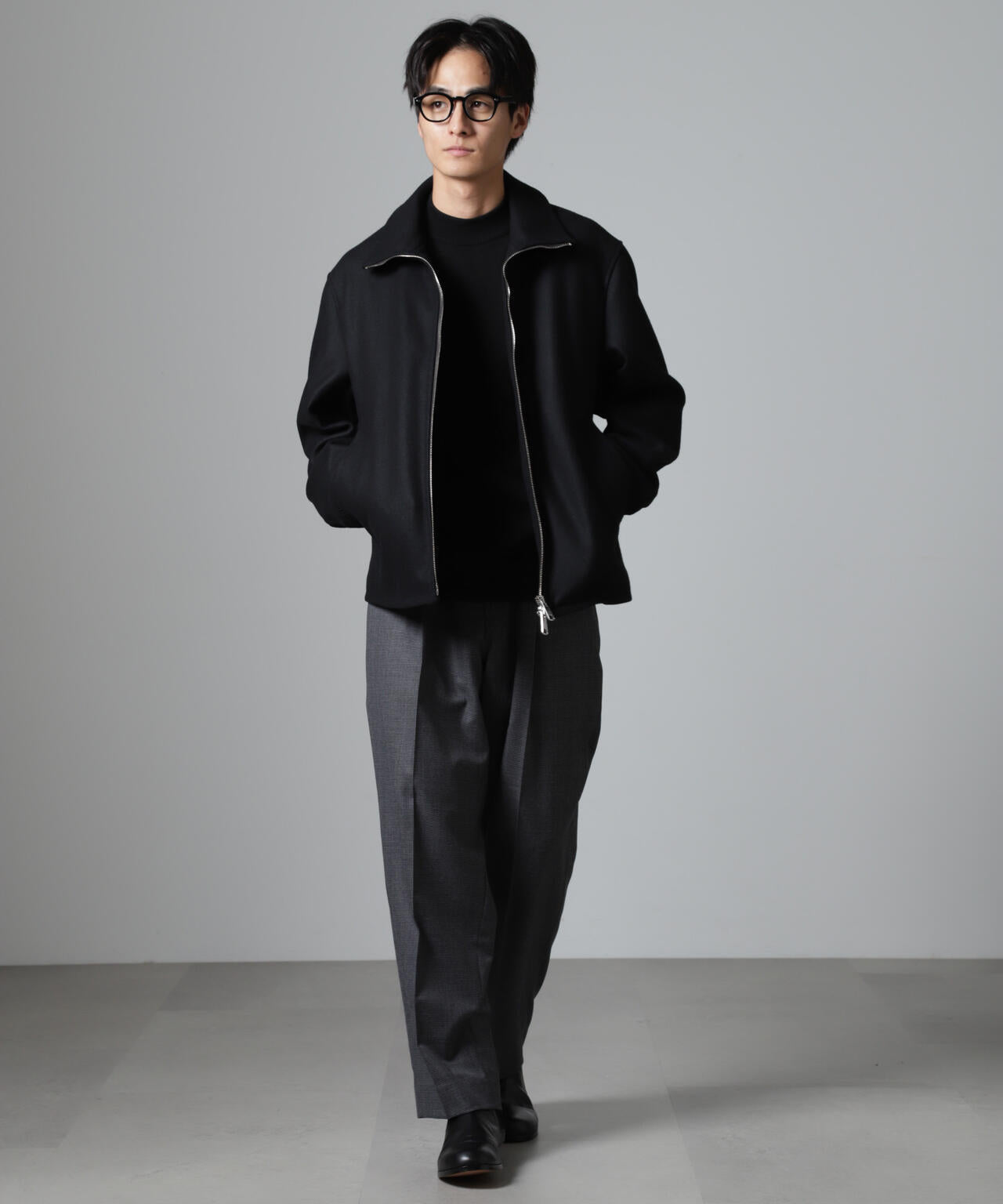 SUPER110'sウール原料使いの2重織りメルトンを使用したハイネックジップアップブルゾン。生地にはソトー社のハードプレス加工を施し、原料をギュッと圧縮しキレイな表面感に仕上げた1着。着心地はもちろん、袖を通したときに感じる特別感を与えてくれる、オススメのアイテムです。