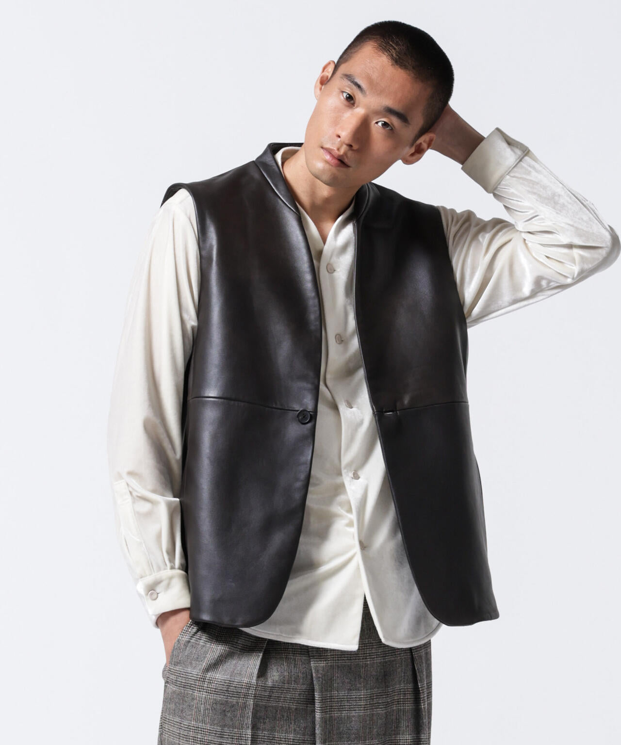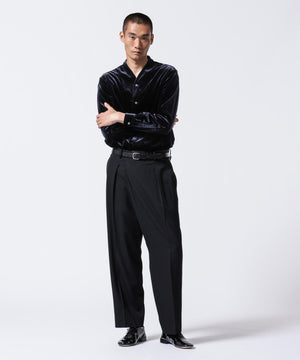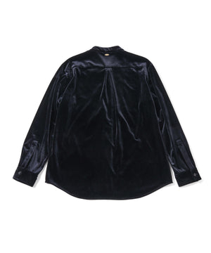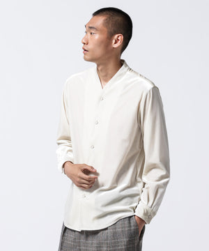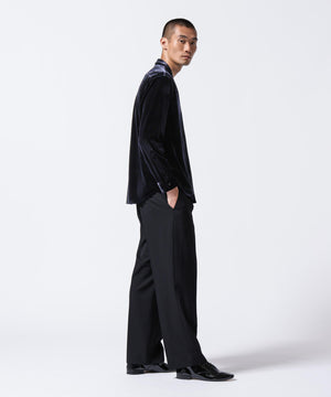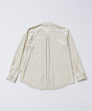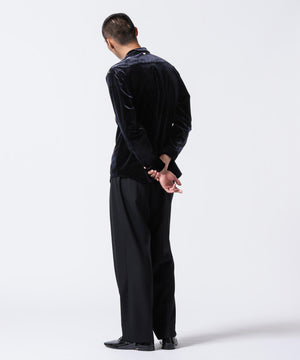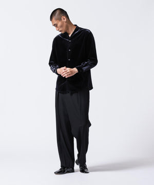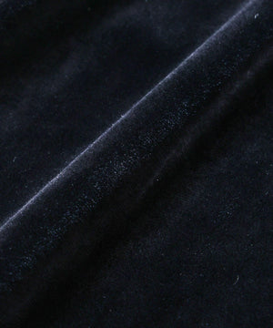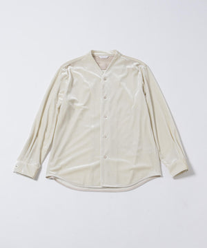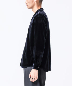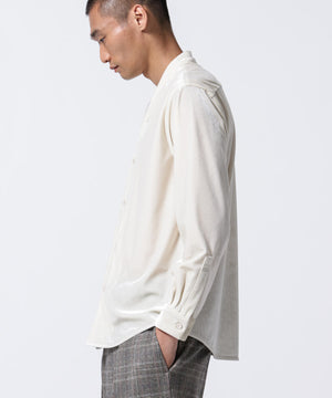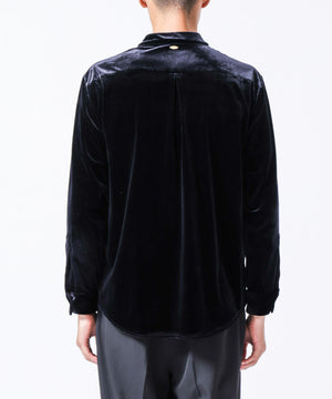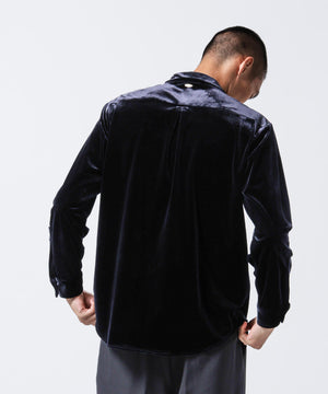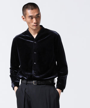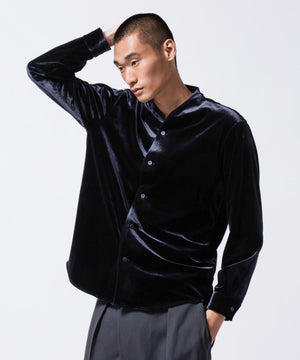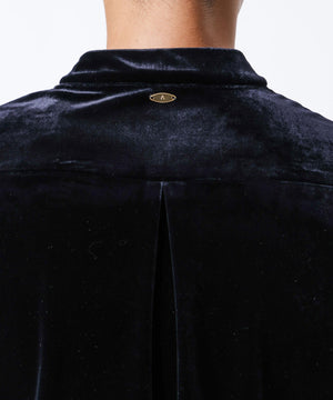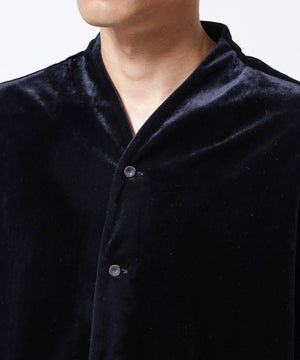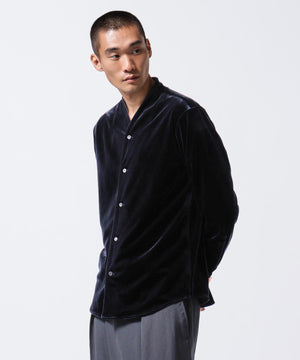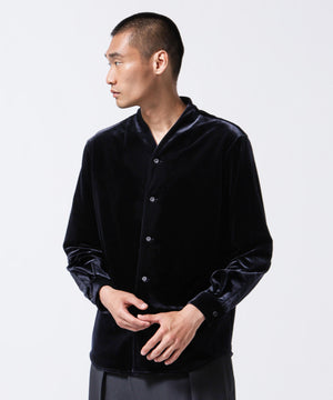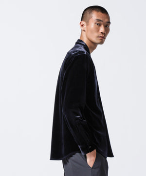 柔らかで上品な手触りと深い光沢感が特徴のシャツブルゾン。トリアセテートとベロアを採用。暑さが残る季節は、カーディガン感覚で着流した着こなしがおすすめの、1着。